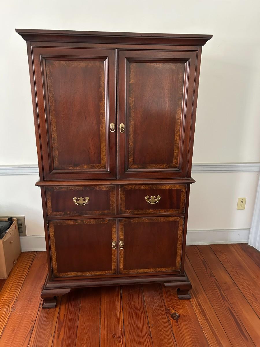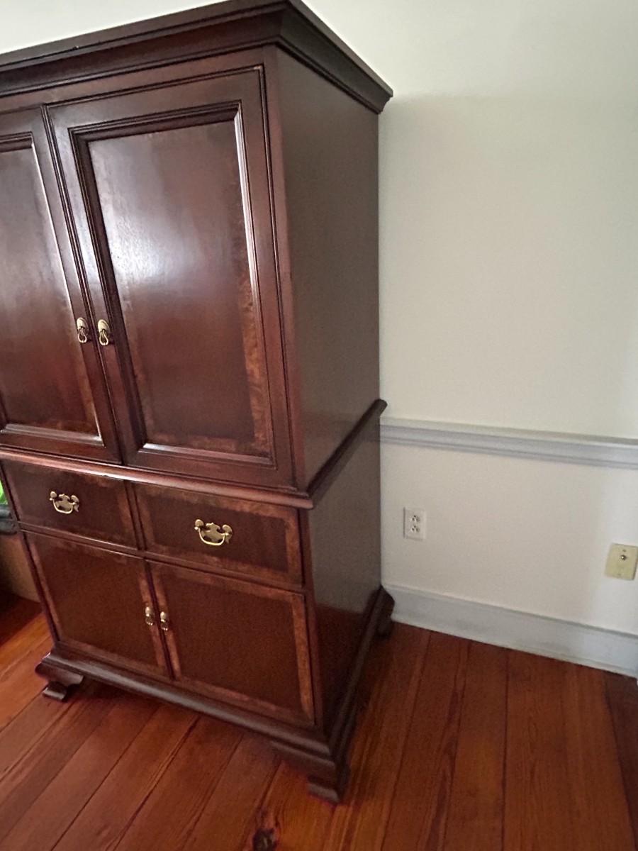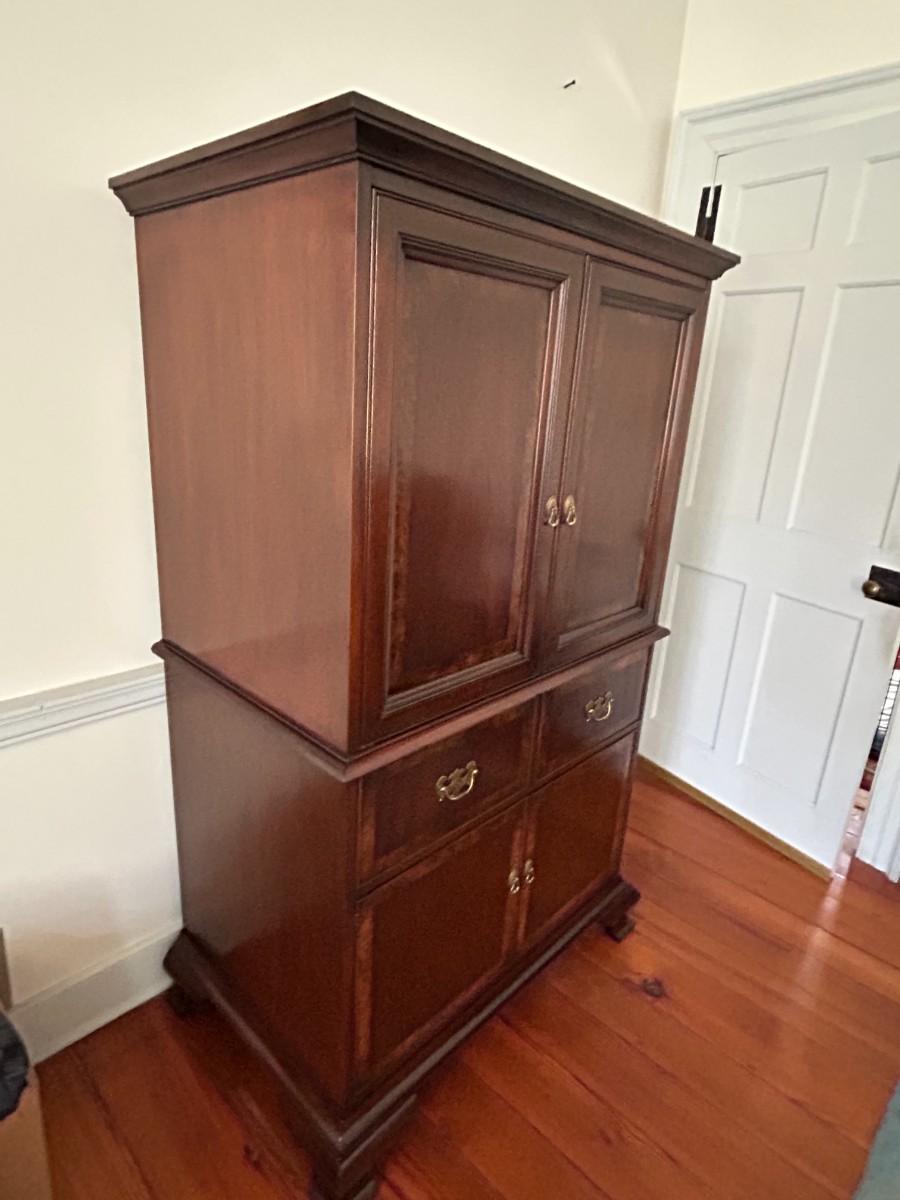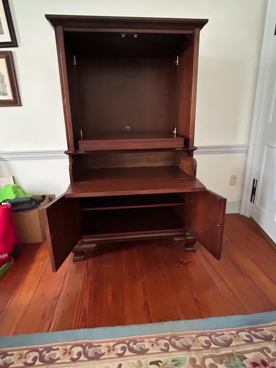 T.V, Cabinet/Desk/Armoire? The possibilities are endless with this beautiful piece. Upper cabinet has stand for t.v. or computer that swivels. plenty of storage underneath, no noticeable scratches or dents. Great condition.