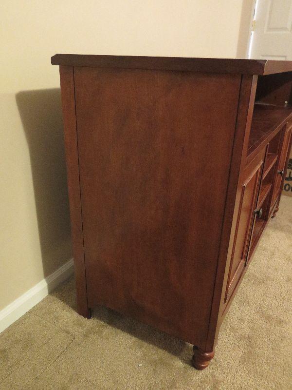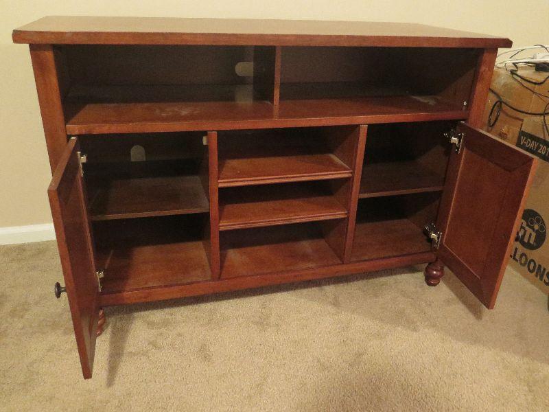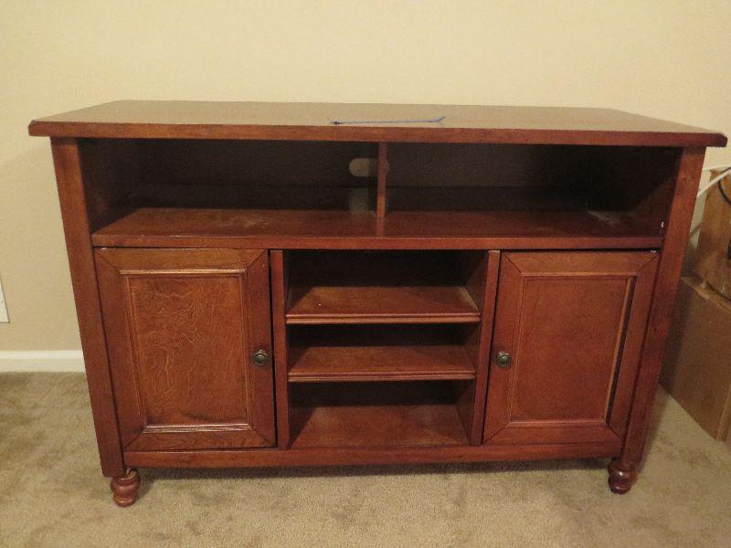 Wooden cabinet with space for electronics, room for storage, and a spot on top for a large TV. Two front legs need to be reattached. 47.5x19x32. Heavy, bring help to move. **Please read Terms and Conditions before placing a bid. Pick up is Wednesday July 31st, from 2 pm to 7pm in Sicklerville. All sales are final. All sales are as is, where is. Please review all photos. Any props included in photos are not included in listing. All measurements are approximate.