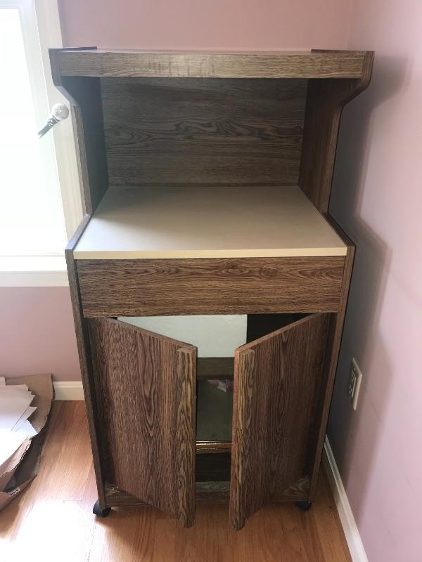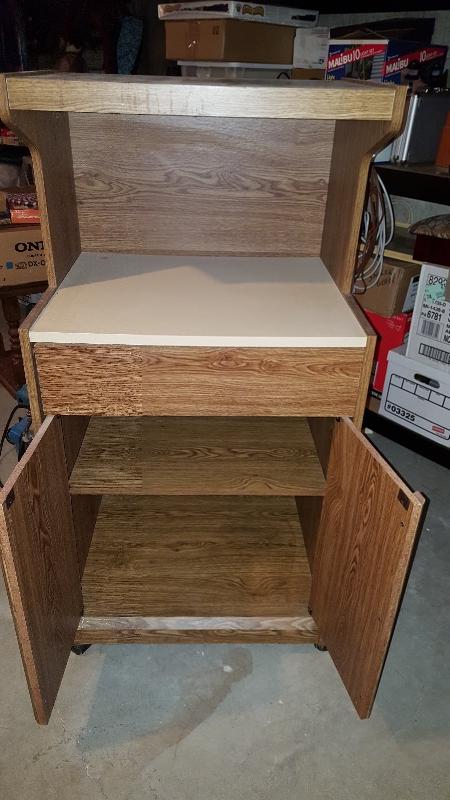 This cabinet is in good condition. It has a shelf and storage space underneath. It would look nice in the kitchen for a great coffee station!
