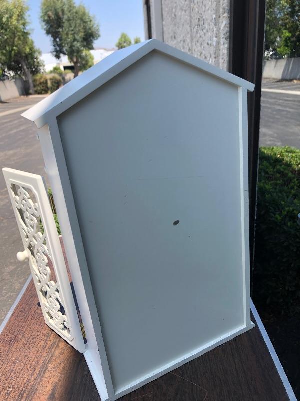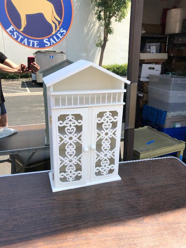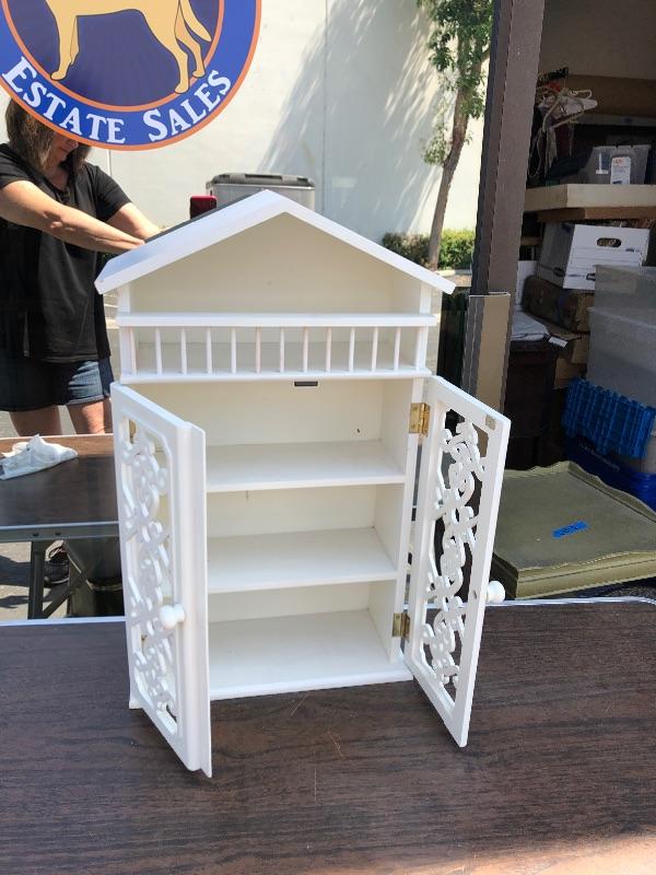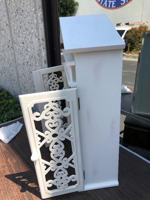 White storage display cabinet. Can sit on top of surface or made to hang. Multiple shelves inside openwork doors.