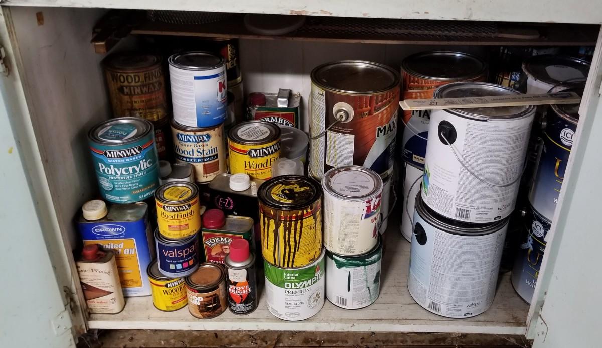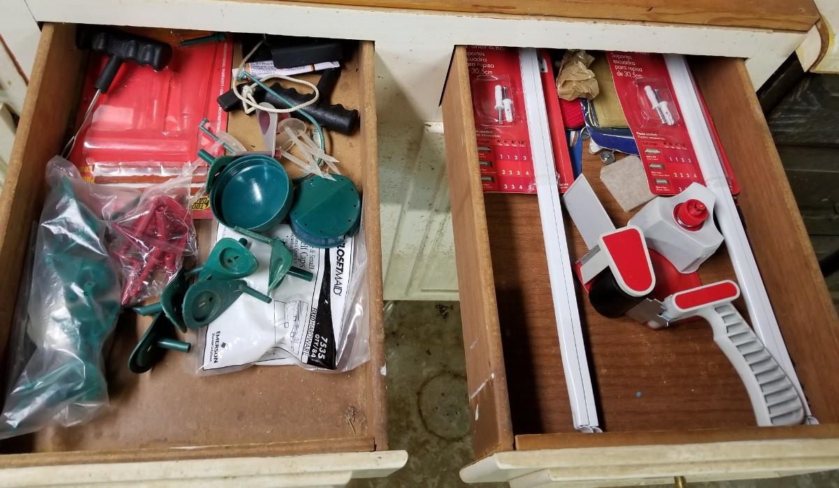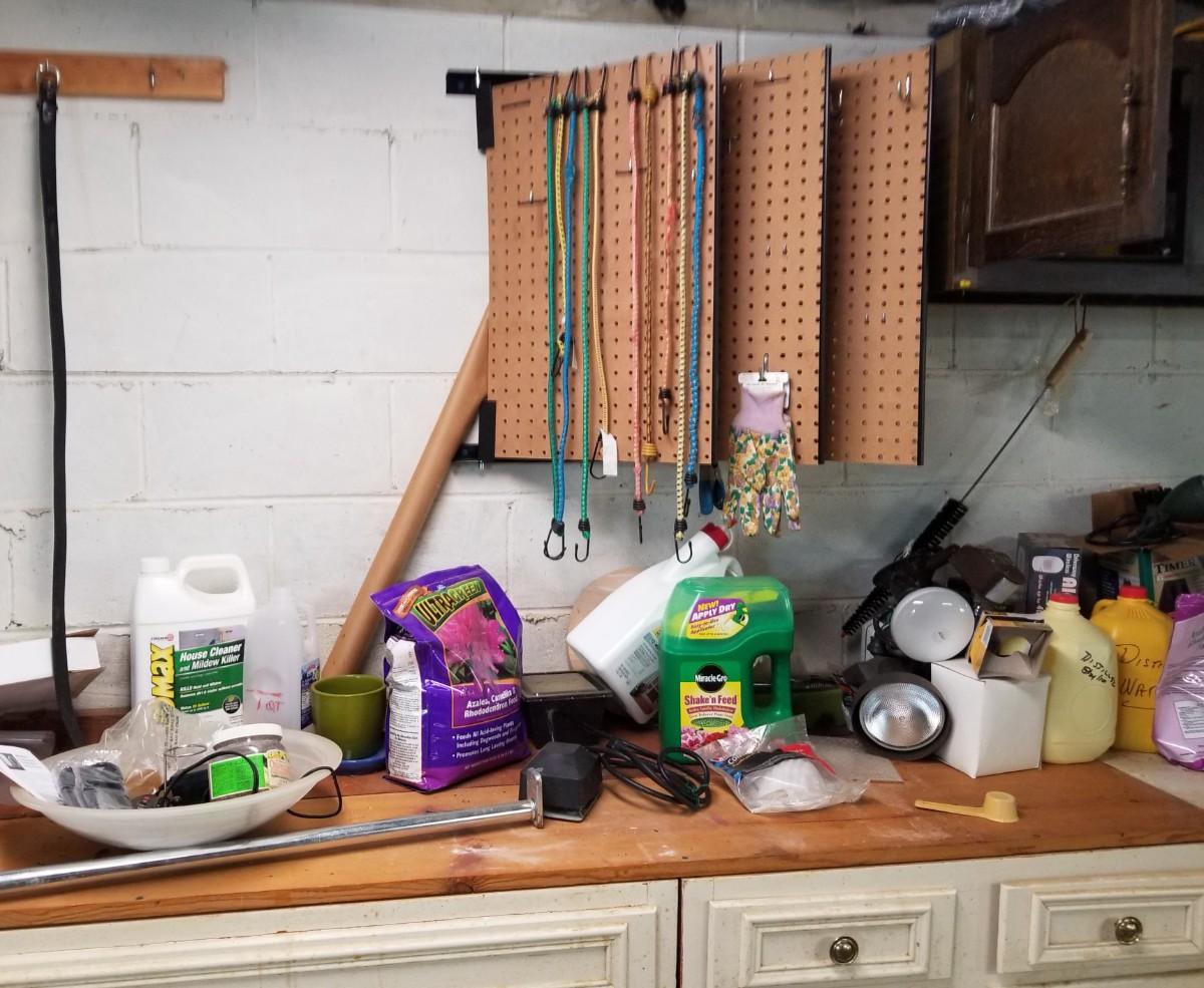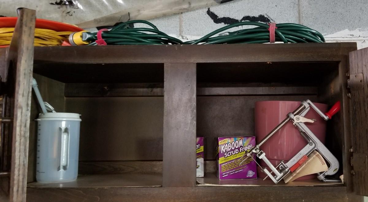 Variety of contents in garage cabinet section. Swinging peg board and cabinets not included