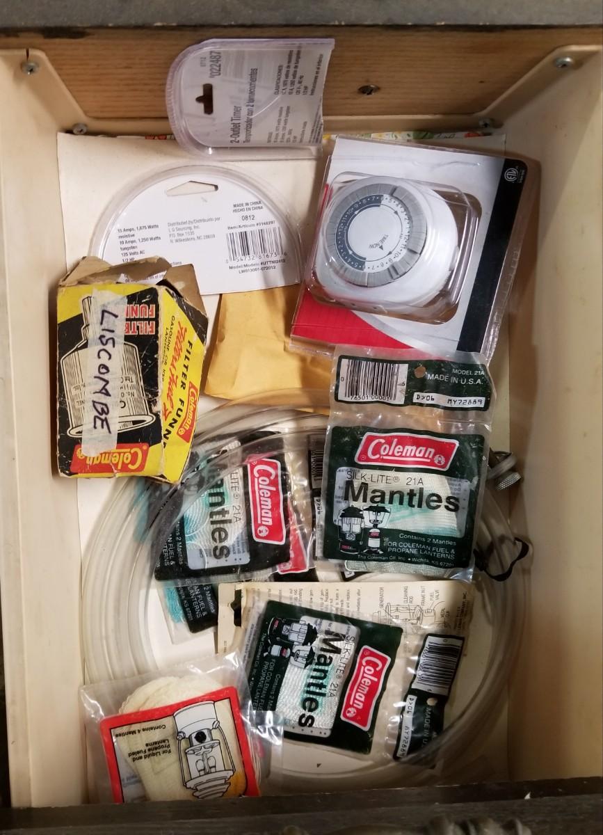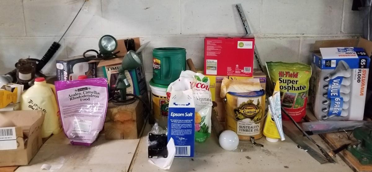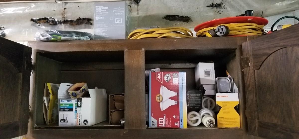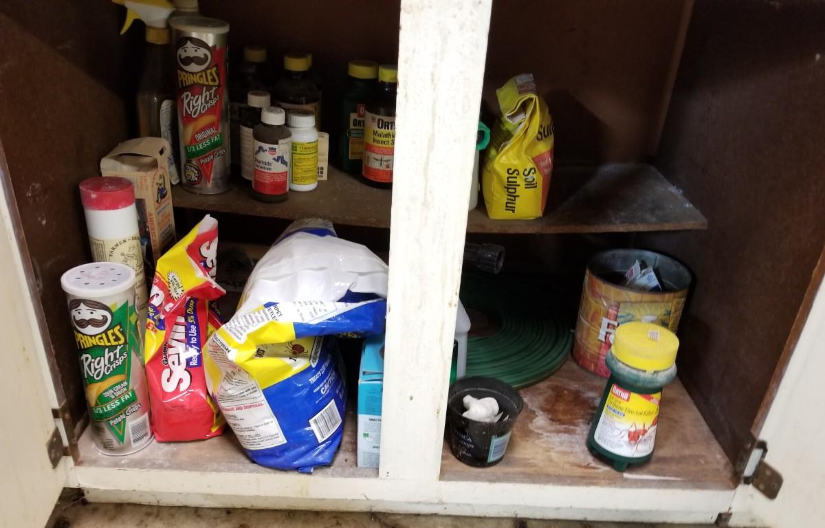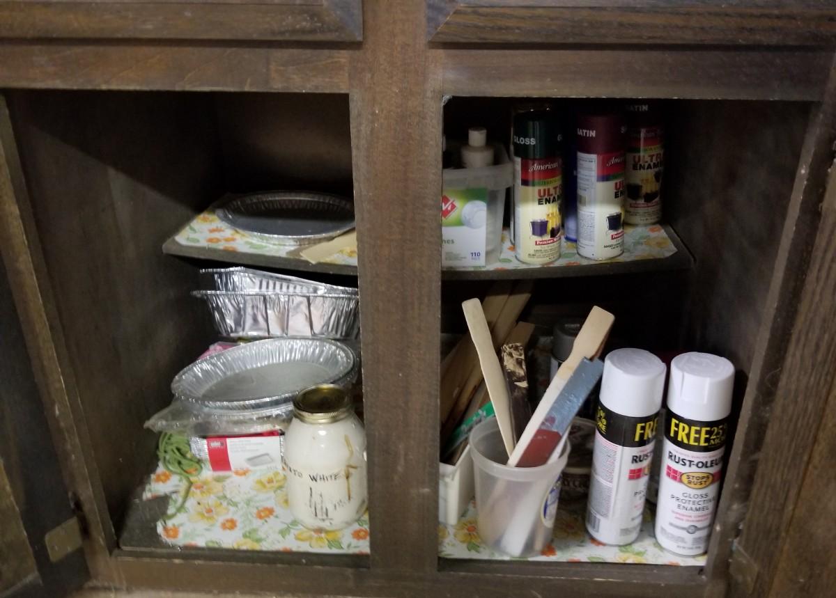 Variety of contents in garage cabinet section. Swinging peg board and cabinets not included