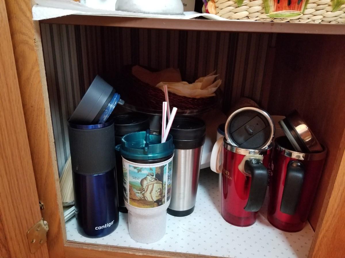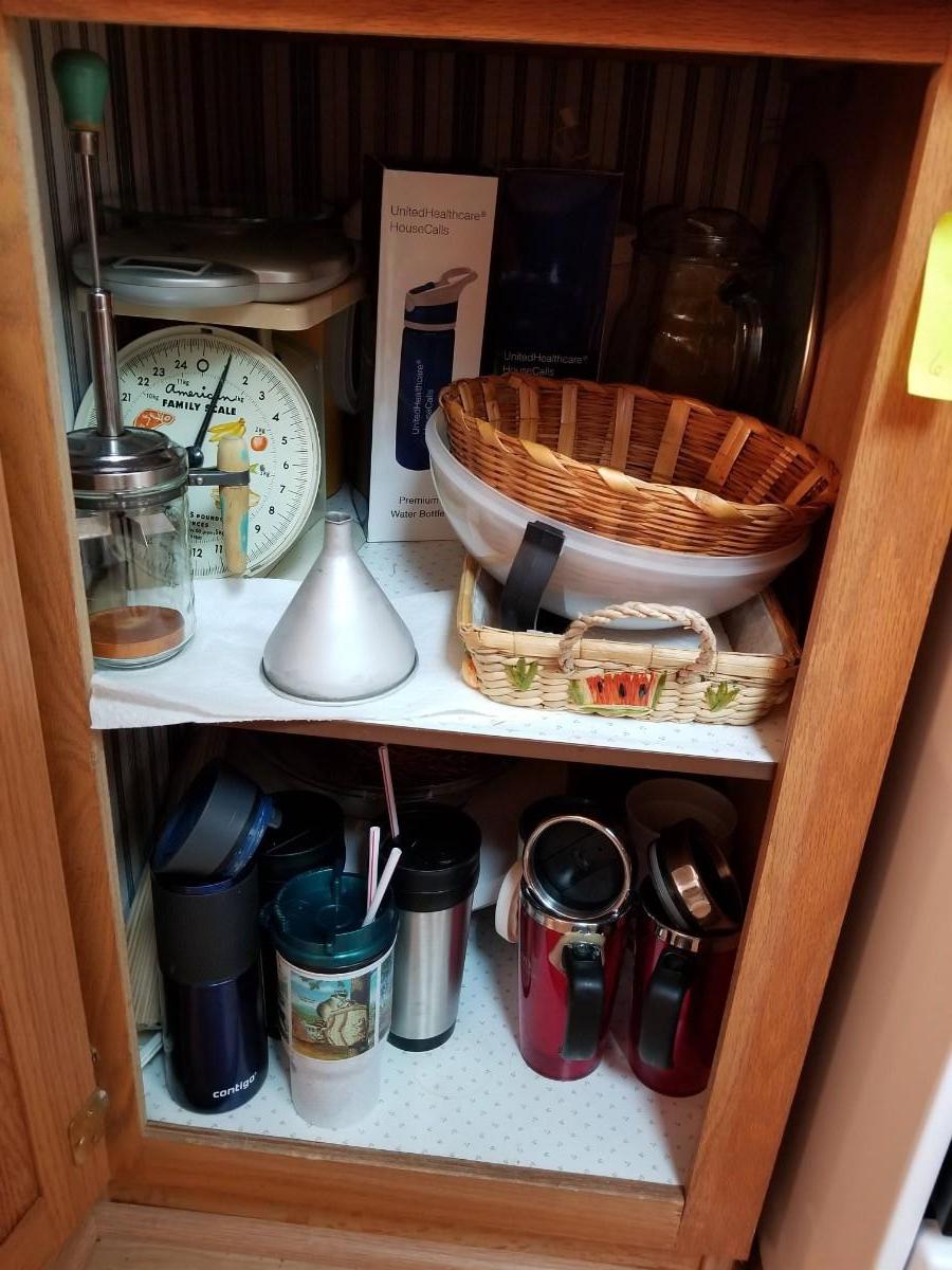 Vintage kitchenware and travel mugs.