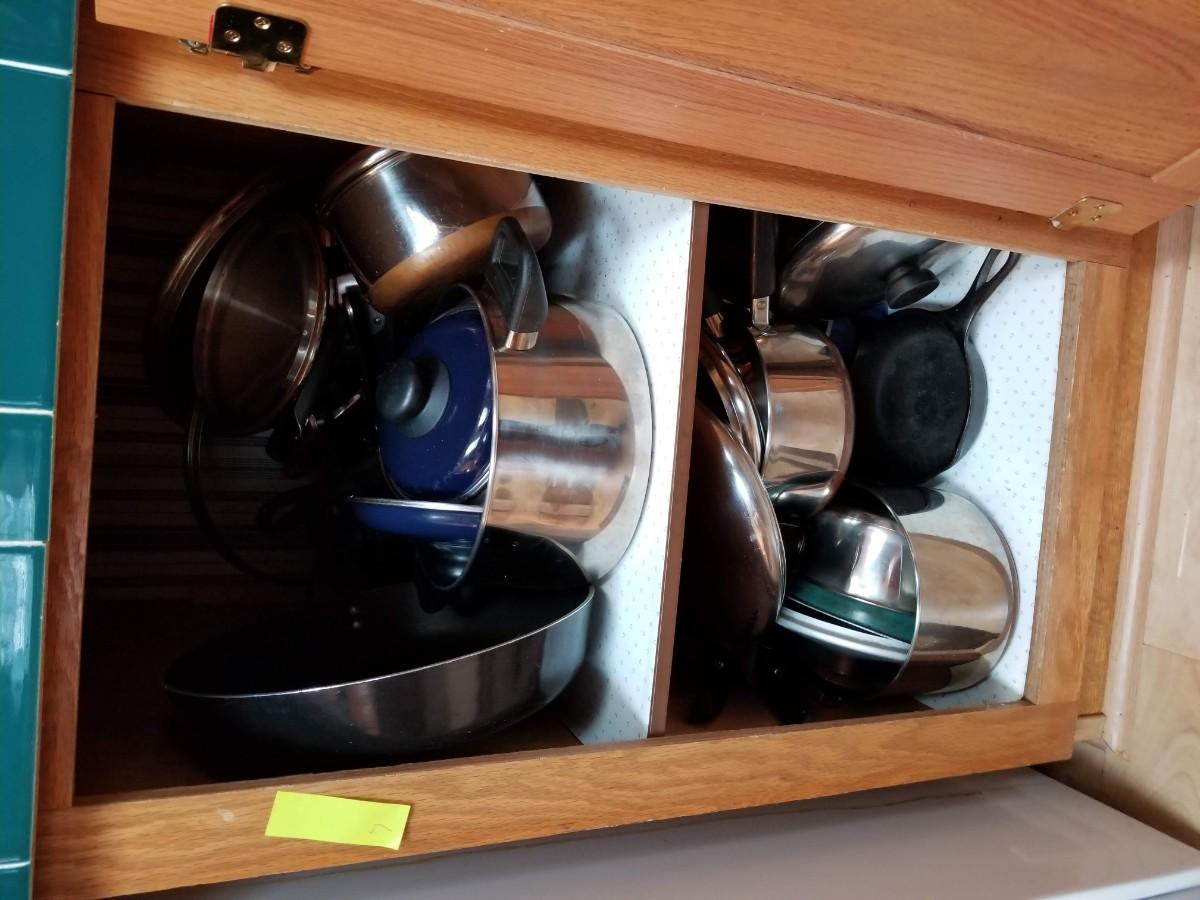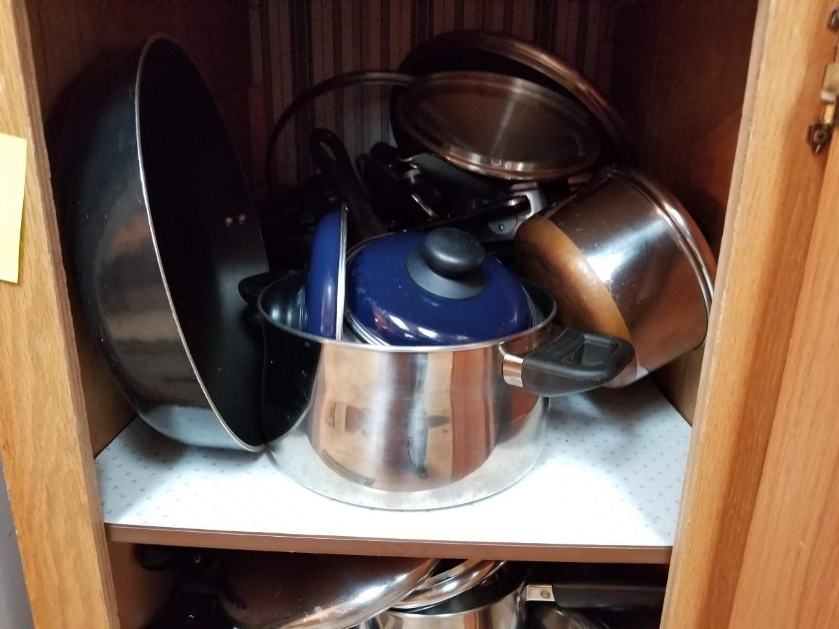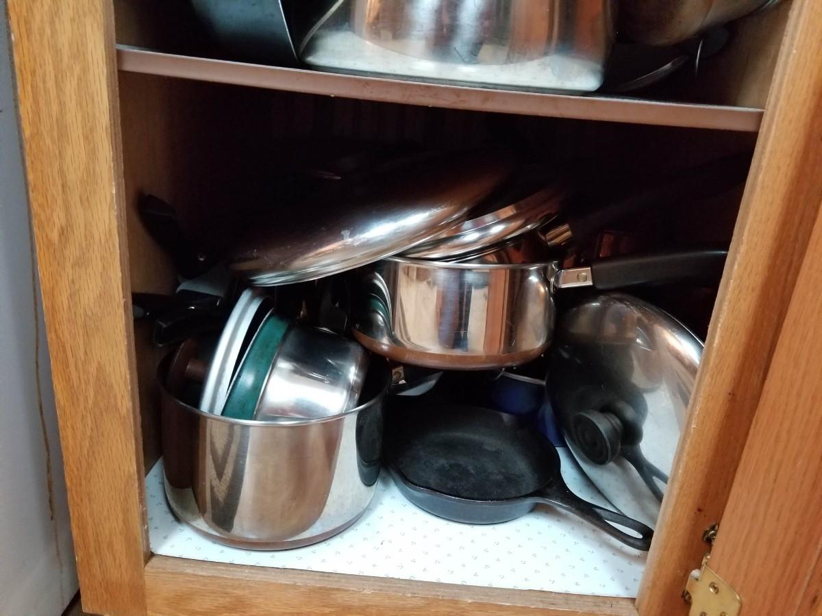 Pots and pans. One small cast iron piece is a Cracker Barrel item.