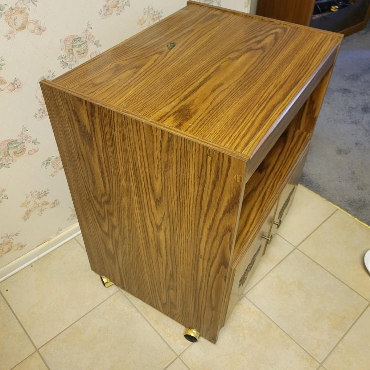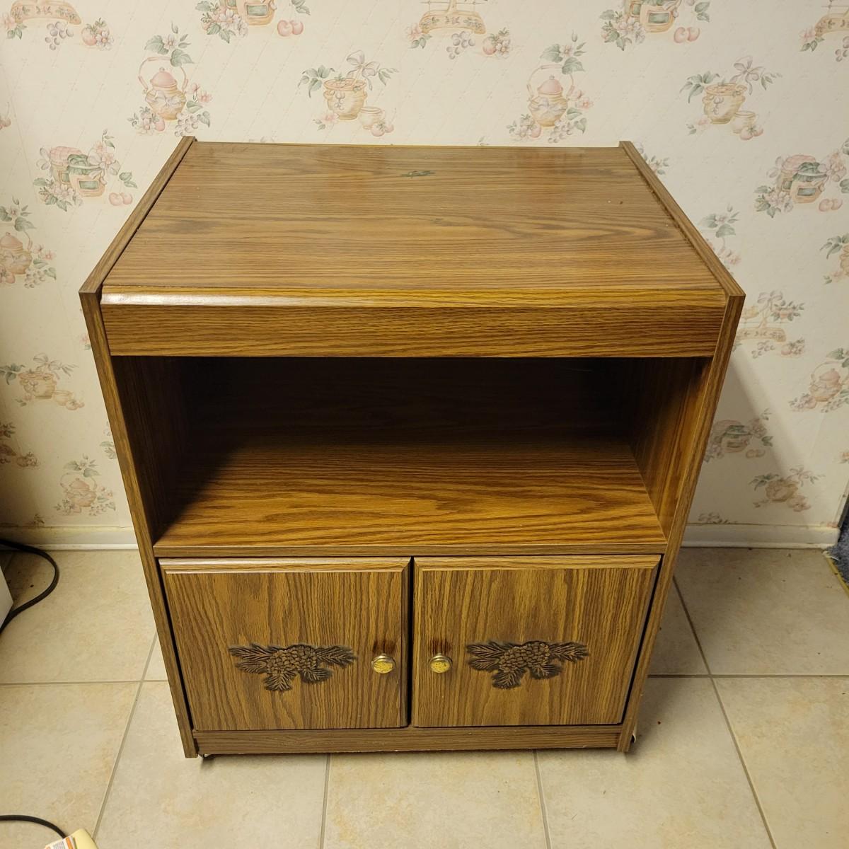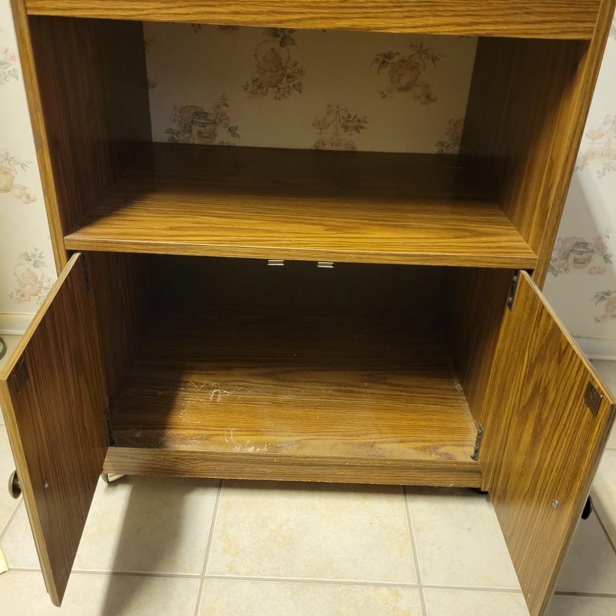 A small cabinet on casters that measures approximately 24.5" x 19" x 30"H. It is made of engineered wood with a faux oak finish. Local pickup only