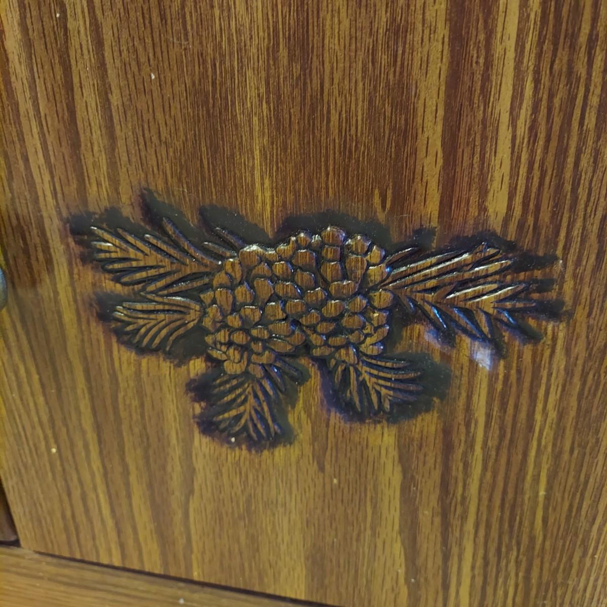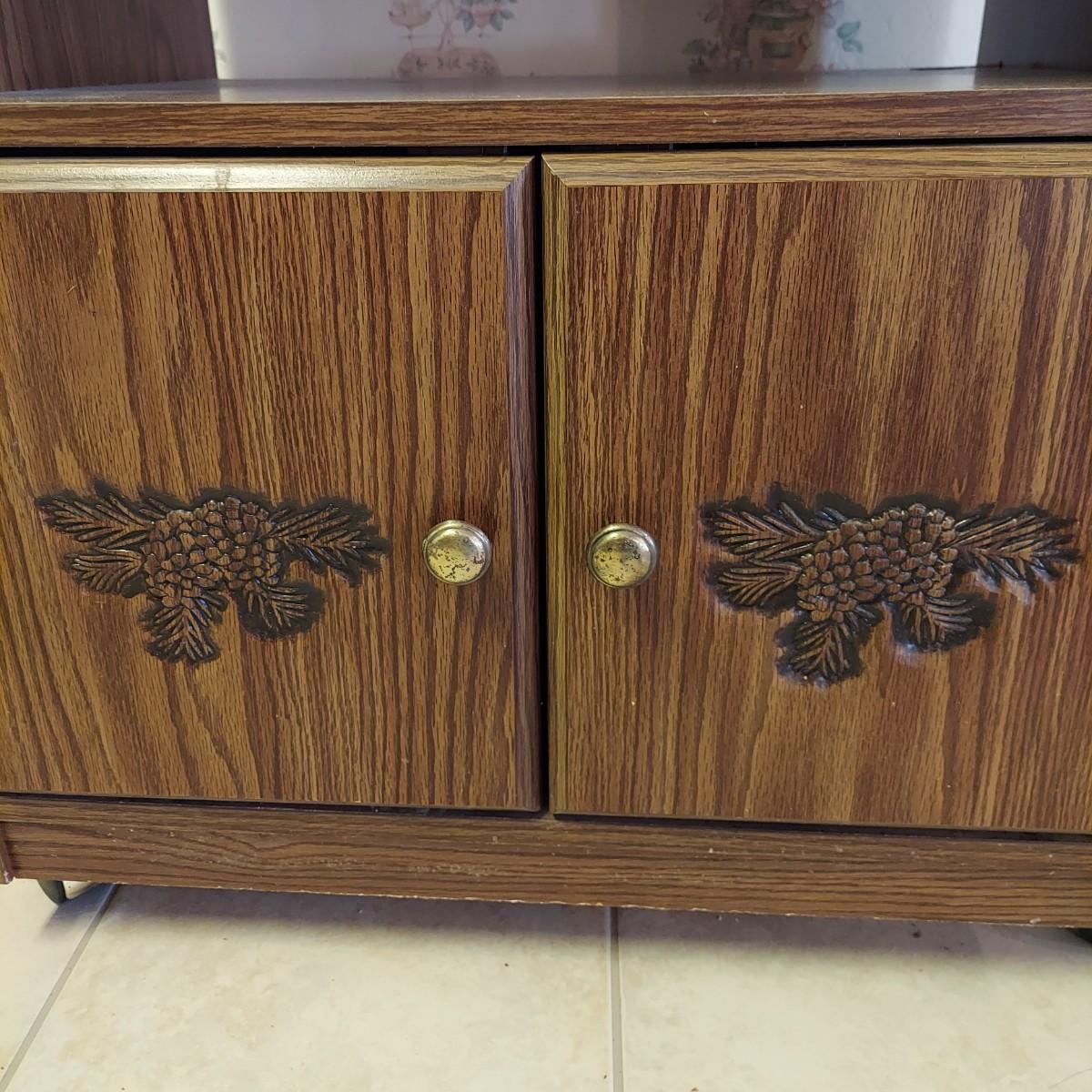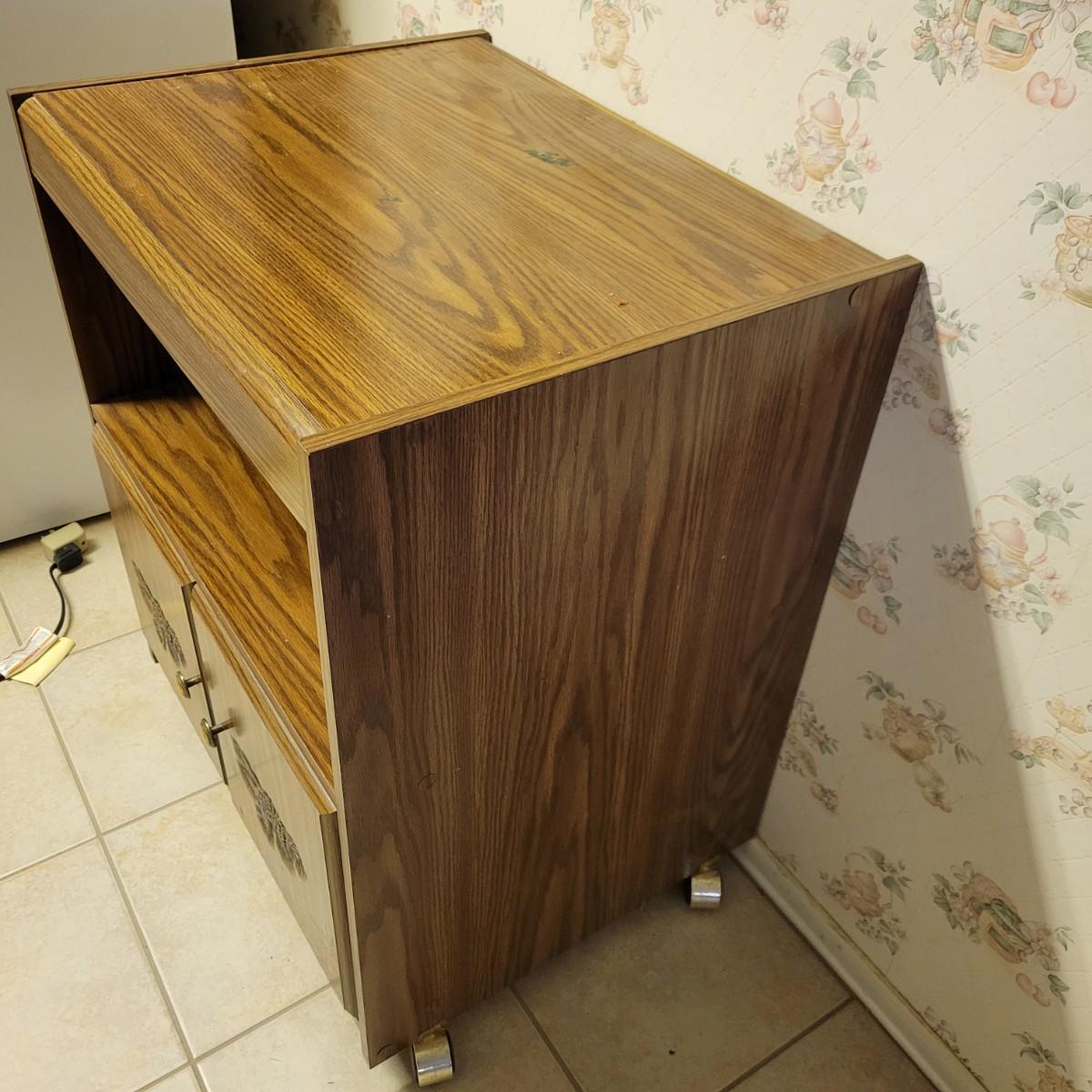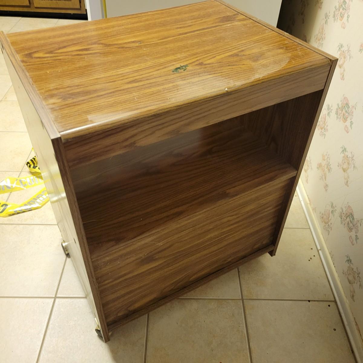 A small cabinet on casters that measures approximately 24.5" x 19" x 30"H. It is made of engineered wood with a faux oak finish. Local pickup only