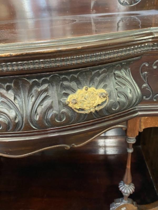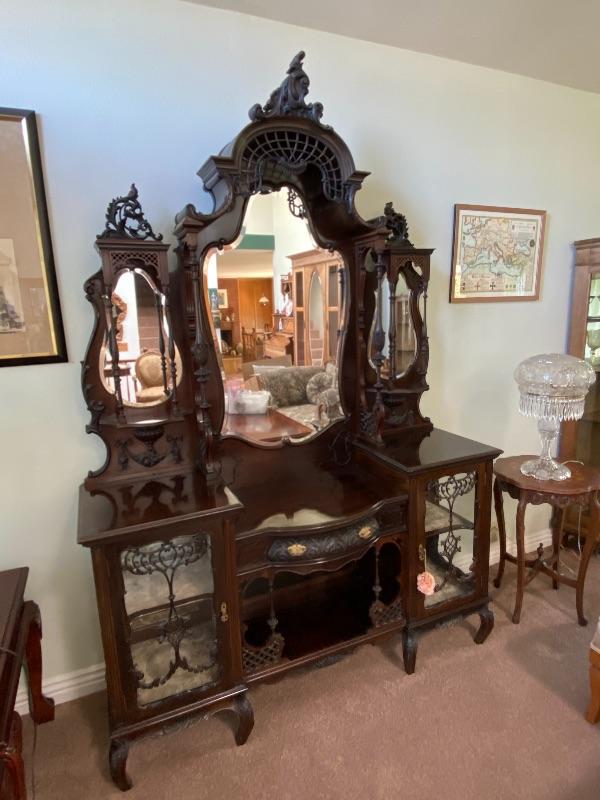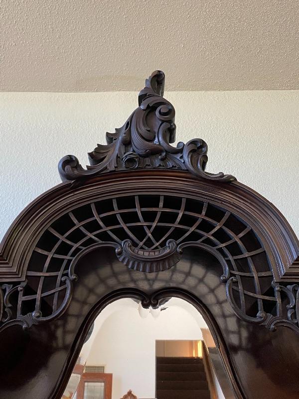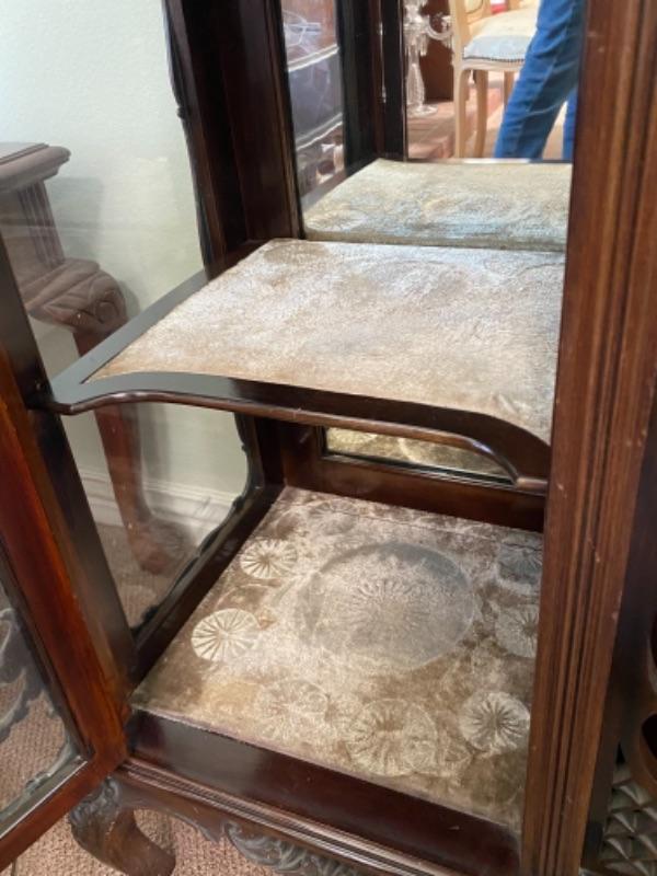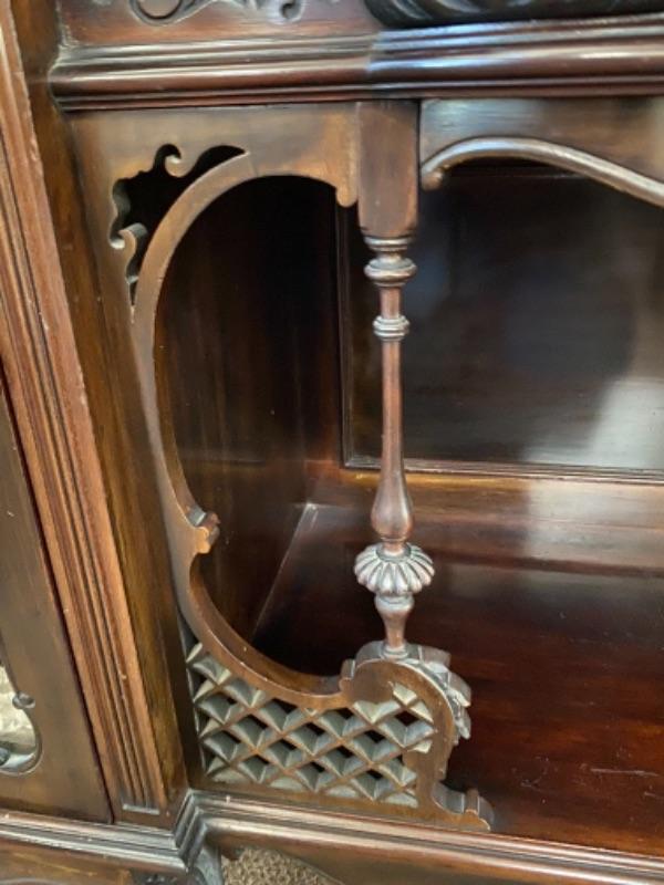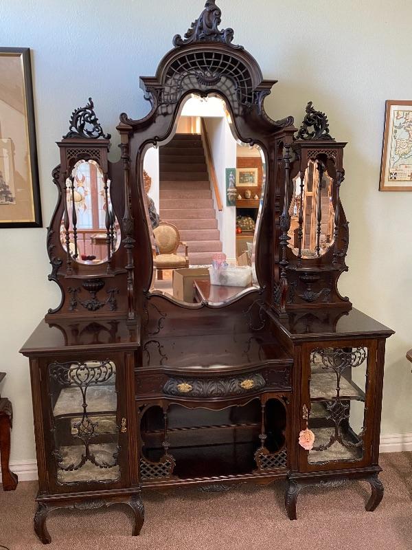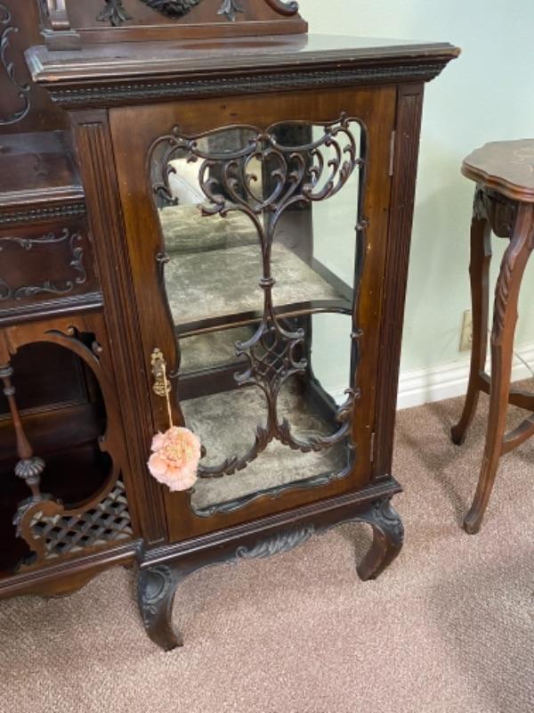 Beautiful mahogany wood cabinet. Antique Victorian/ Gothic piece of furniture. Ornate details from top to bottom. Mirrored back. Locking glass cabinets are cream/beige colored velvet lined. Great as a display cabinet or vanity table. A few very minor dings, no major damage.