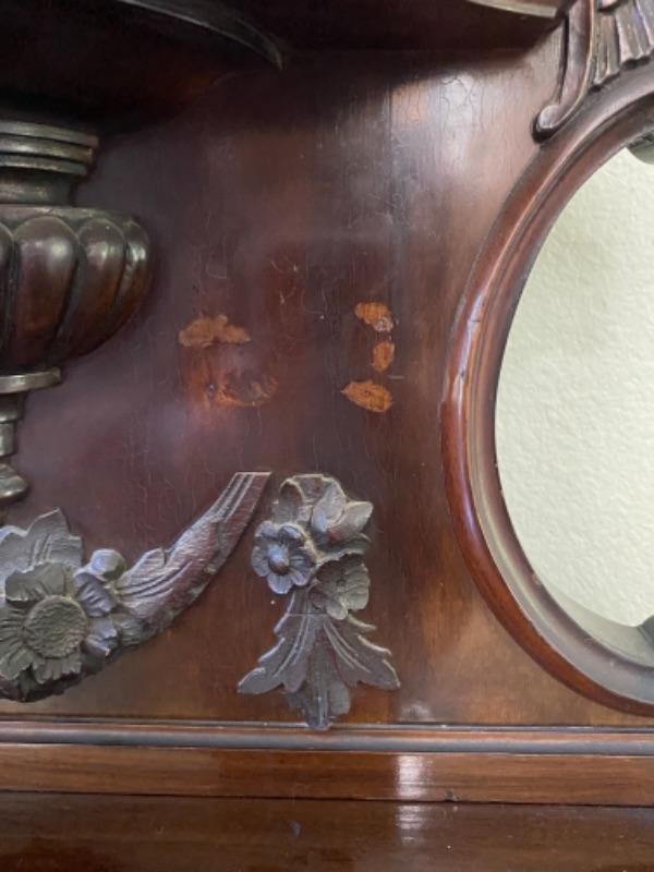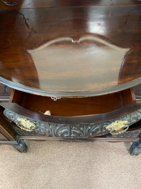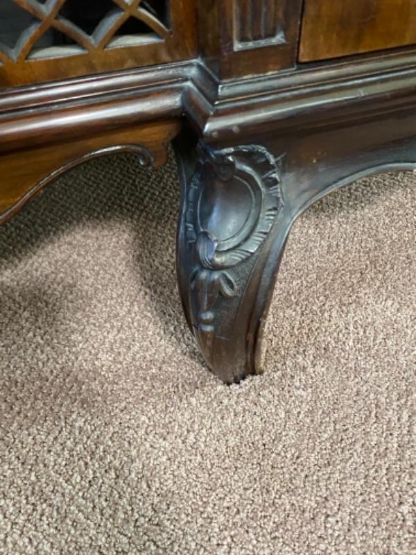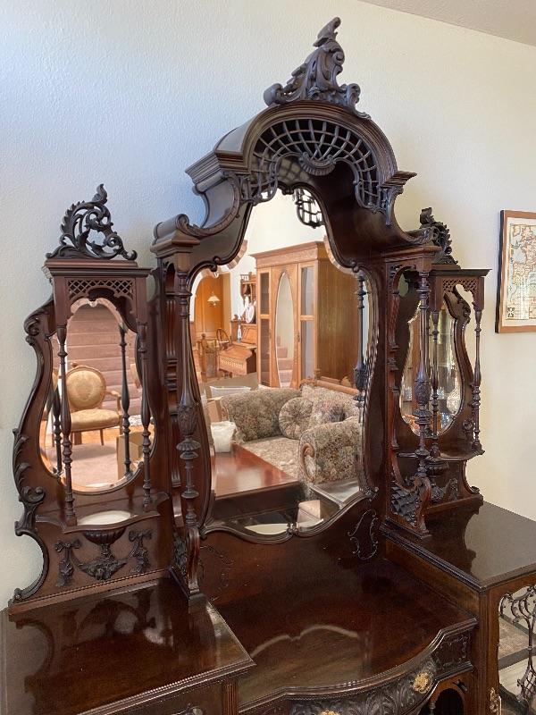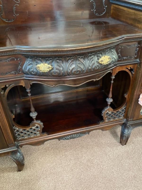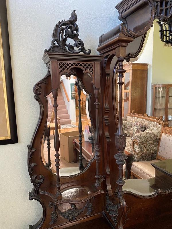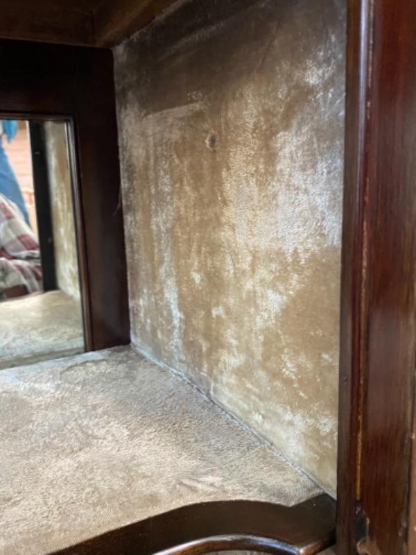 Beautiful mahogany wood cabinet. Antique Victorian/ Gothic piece of furniture. Ornate details from top to bottom. Mirrored back. Locking glass cabinets are cream/beige colored velvet lined. Great as a display cabinet or vanity table. A few very minor dings, no major damage.