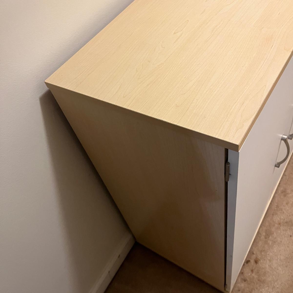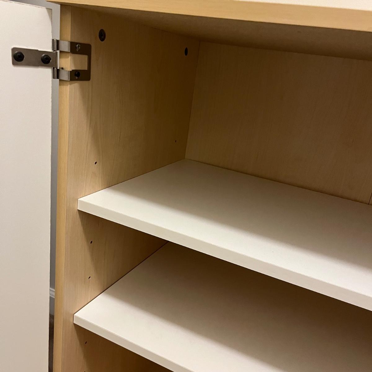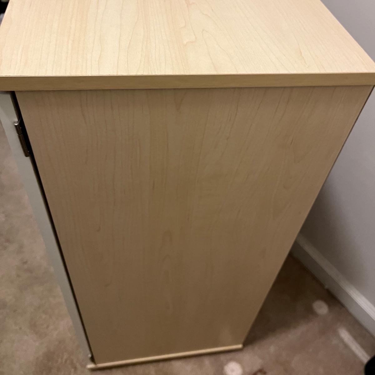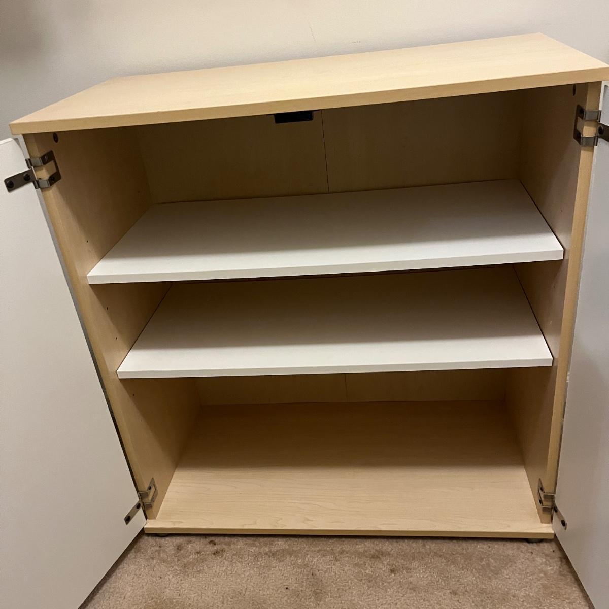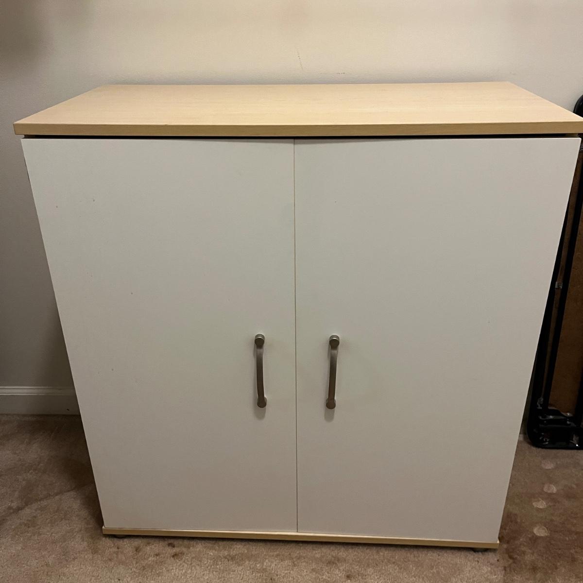 Lot includes a cabinet with two adjustable shelves. Cabinet measures 31” x 15” x 33”H and appears to be pressed wood.