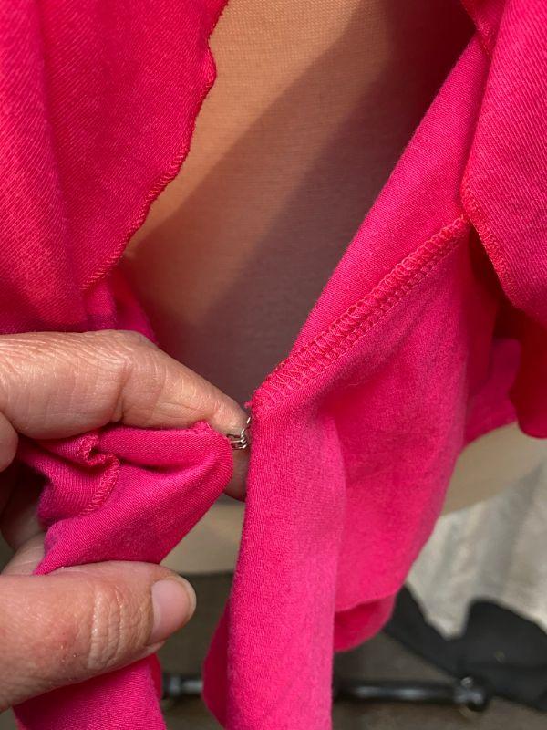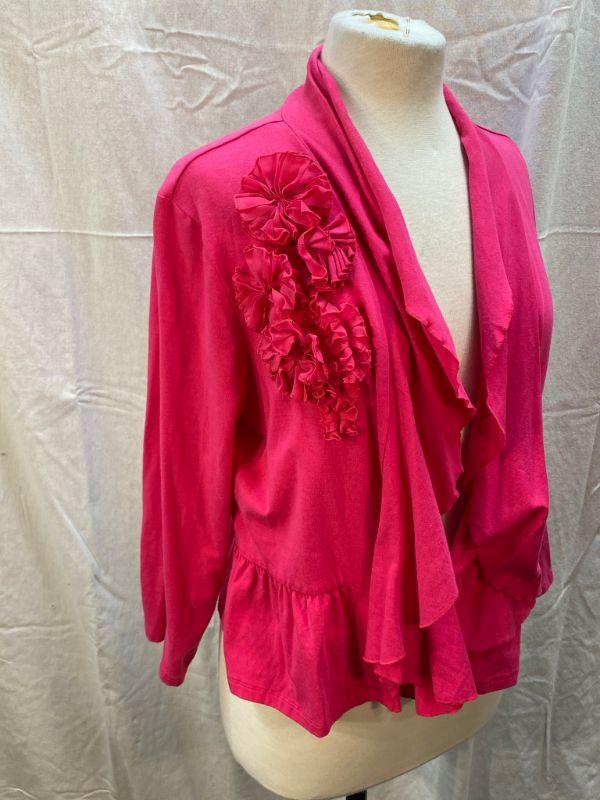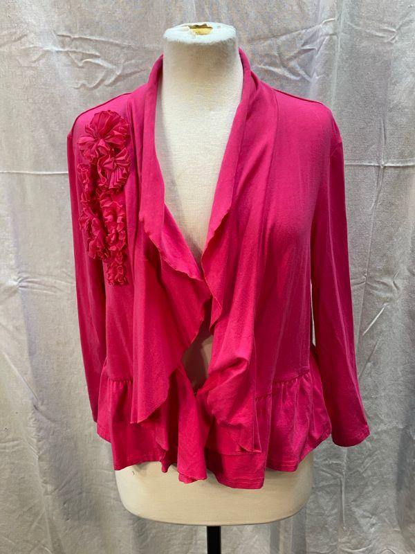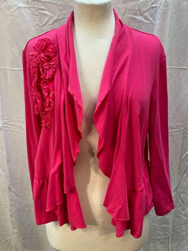 Cable & Gauge hot pink ruffled edge shrug sweater. Single hook and eye closure. Has some flower detail on the right side. Size Xl. Good condition.