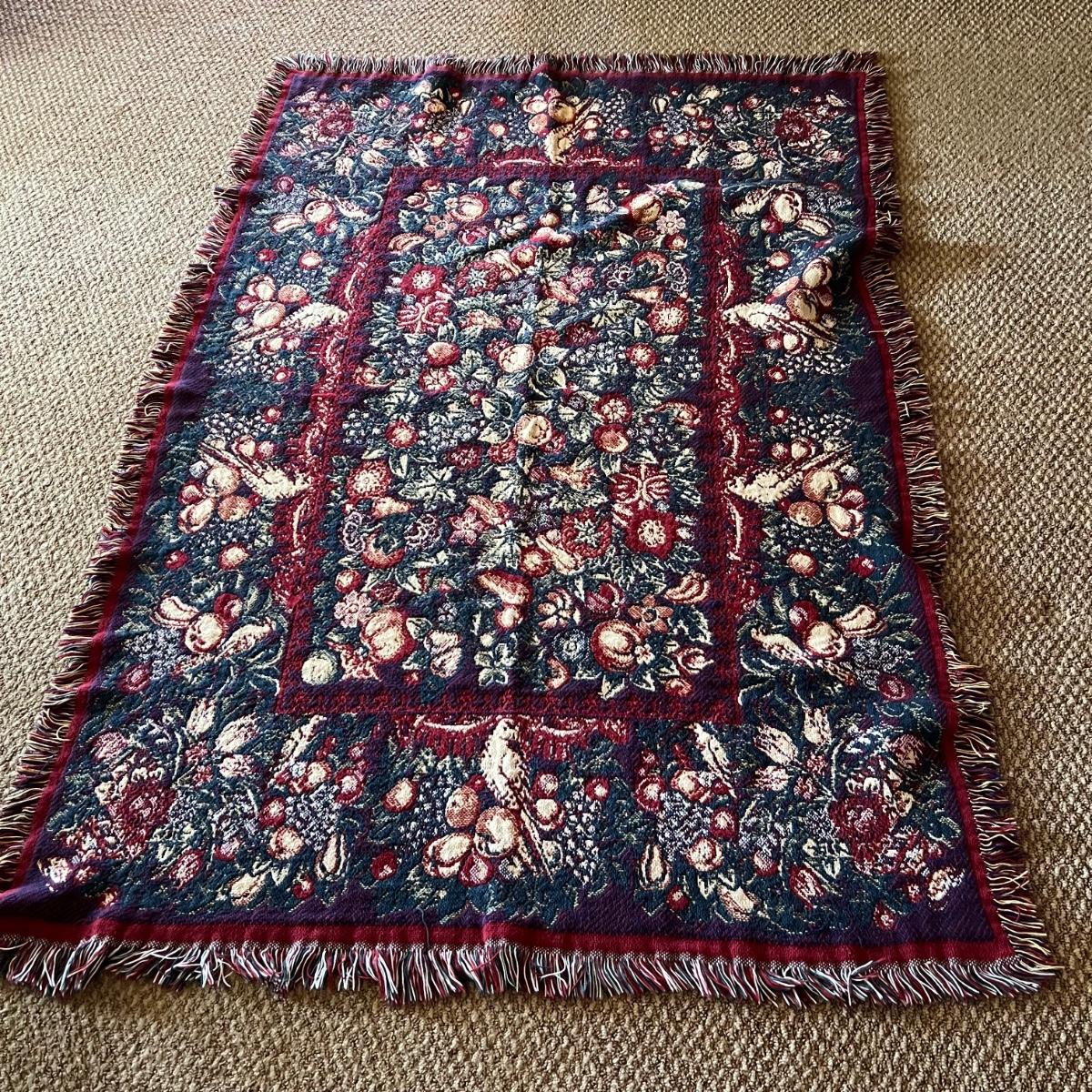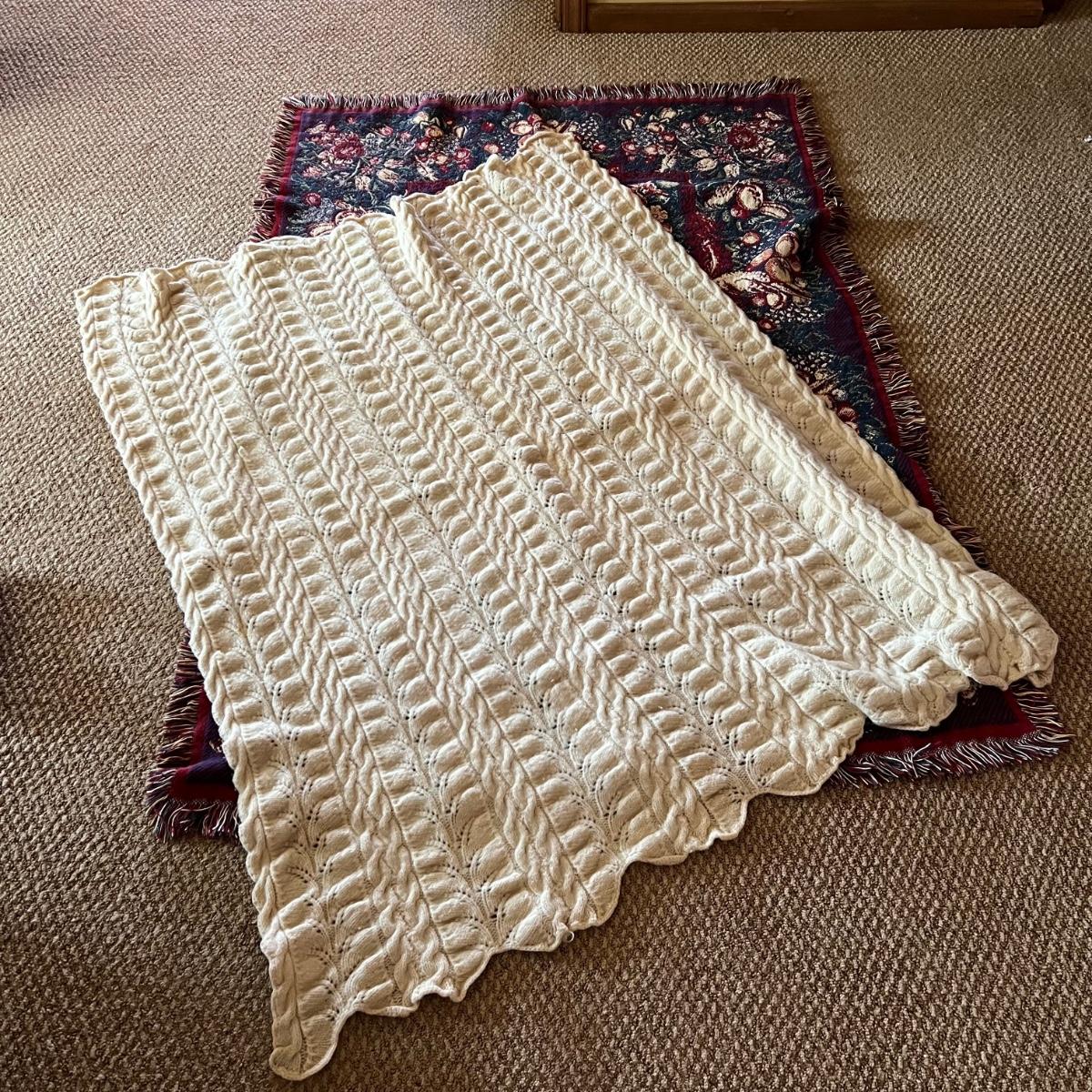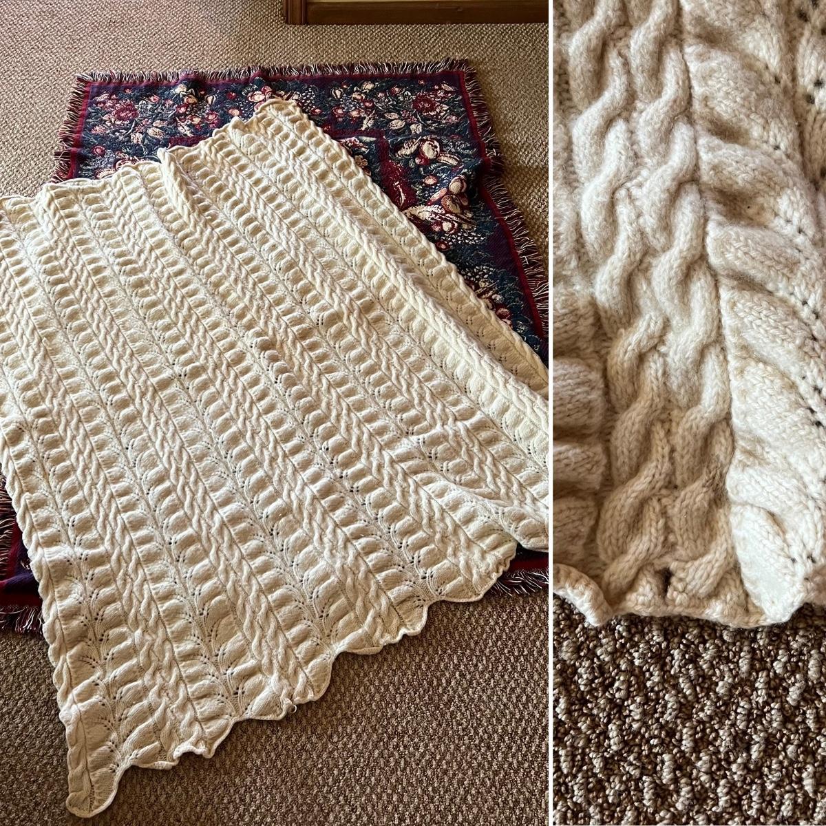 Two throw blankets similar in size. The cable knit blanket appears to be real wool and measures 44” x 58”. It has a loose thread, see pic. The woven blanket has a fringe. No labels on either item.