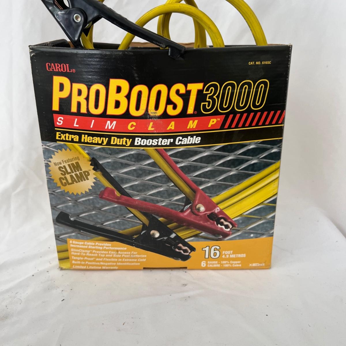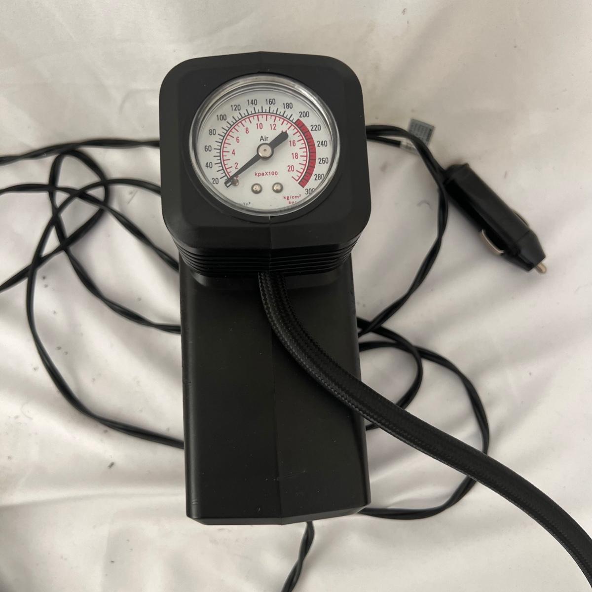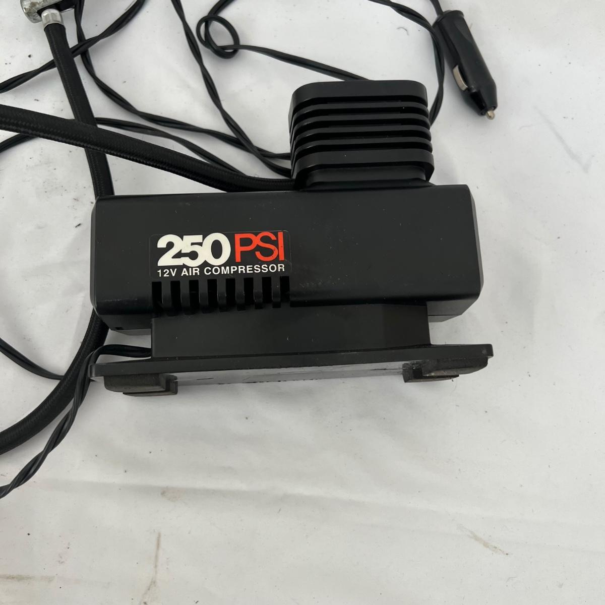 A 250 psi 12 V cigarette lighter powered compressor. Slim clamp 16 foot jumper cables. Cable chains that fit SAE class “S” car radial and bias ply tires. Mak steel toe size 10.5 men’s boots.