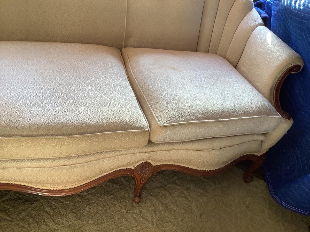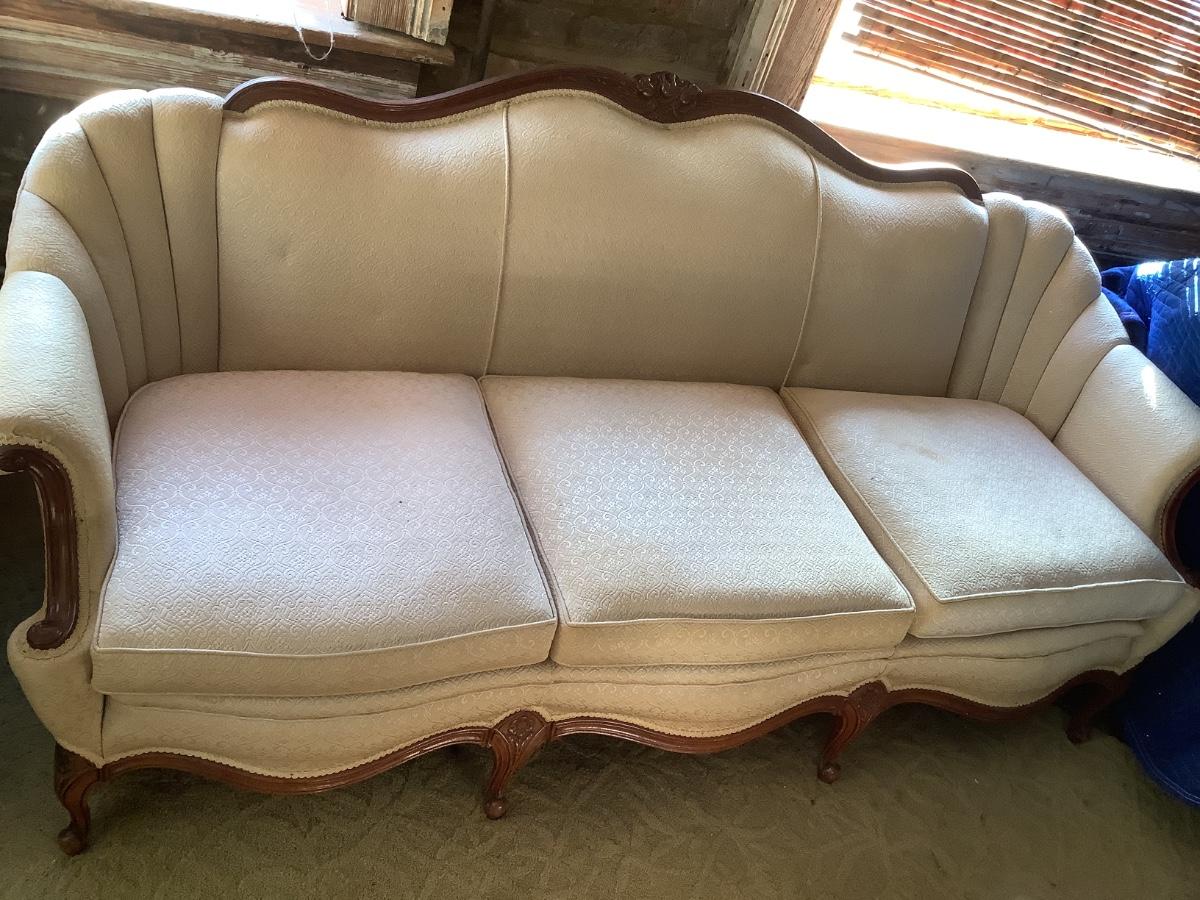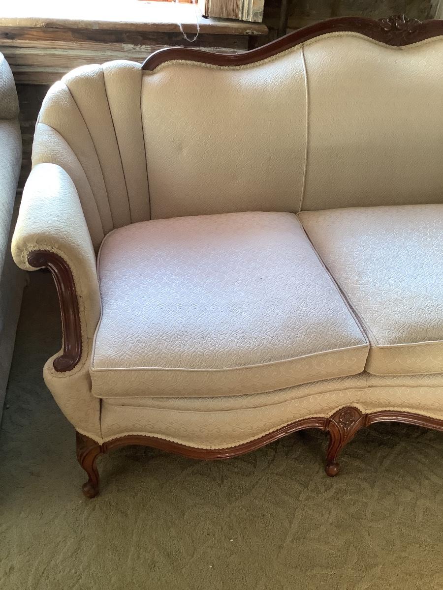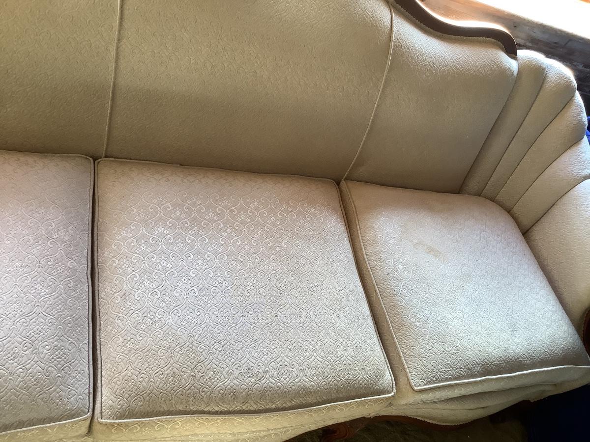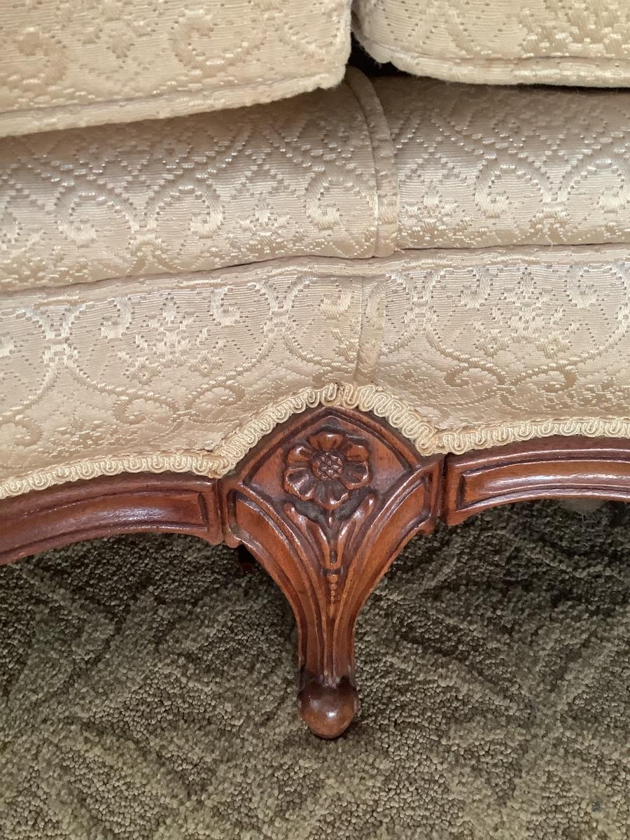 Cabriole Sofa accent wood in good condition, cushions could use a little cleaning otherwise in good condition