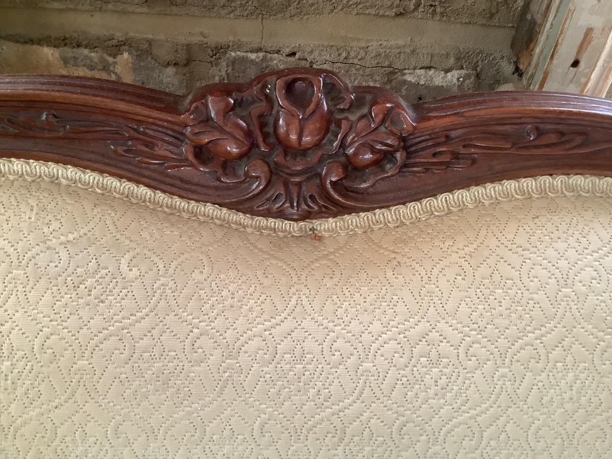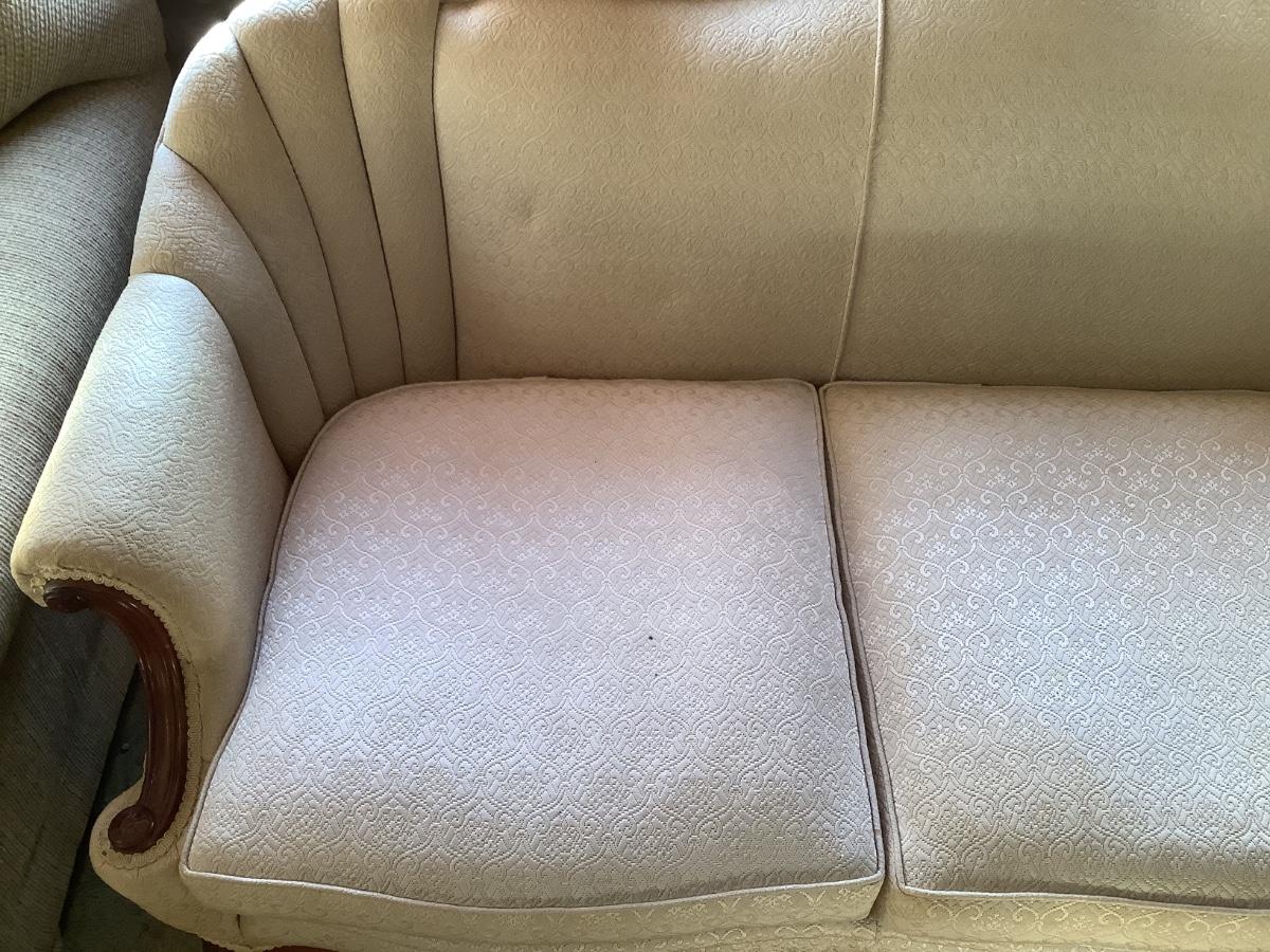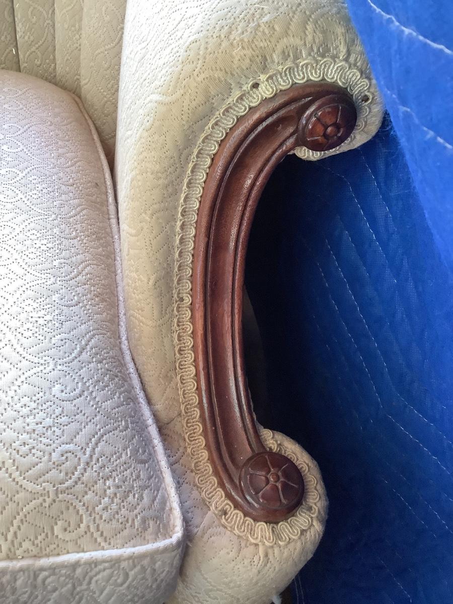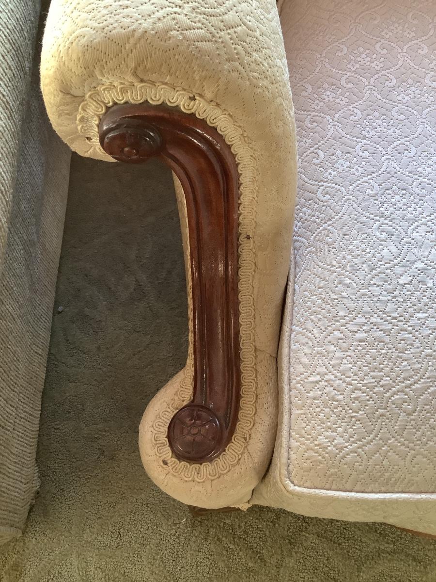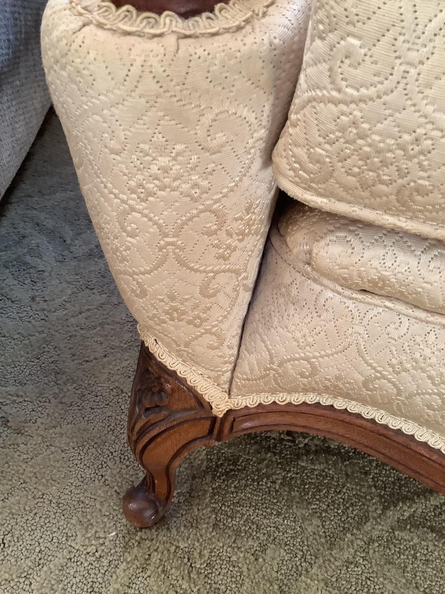 Cabriole Sofa accent wood in good condition, cushions could use a little cleaning otherwise in good condition