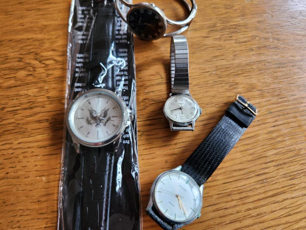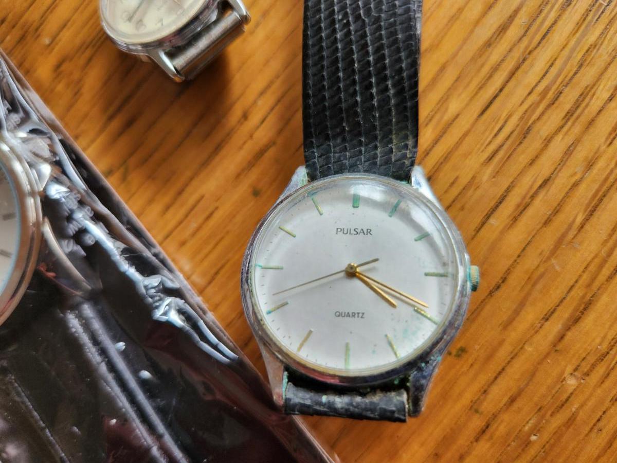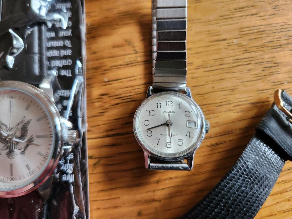 This auction lot is for a Cache of Watches found in the dresser draw of our last estate. The cache includes a nifty Tri-faceted Crystal Dunhill, Swiss Made Stainless Steel Ladies Watch, A new in package "Fashion" Watch, no makers name or marking but a nifty eagle represents on the watch face. Also included is a well-worn Pulsar Quartz watch, a Acqua Watch made in the Phillipines and a stylish Genova Platinum with a Japan movement. All five watches as a group for one bid.