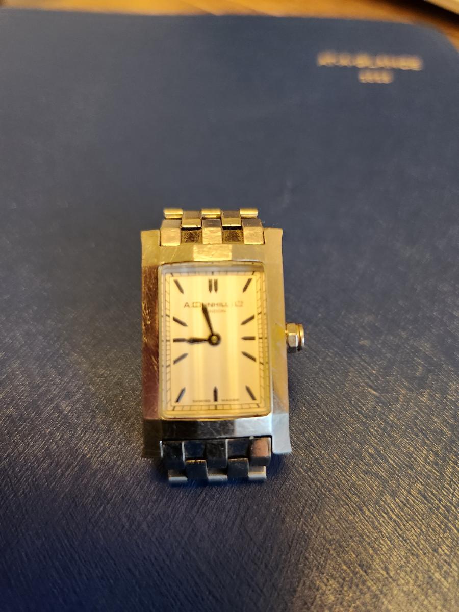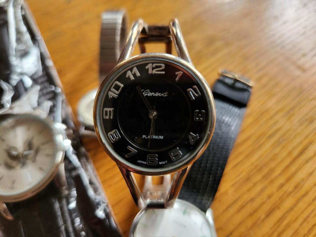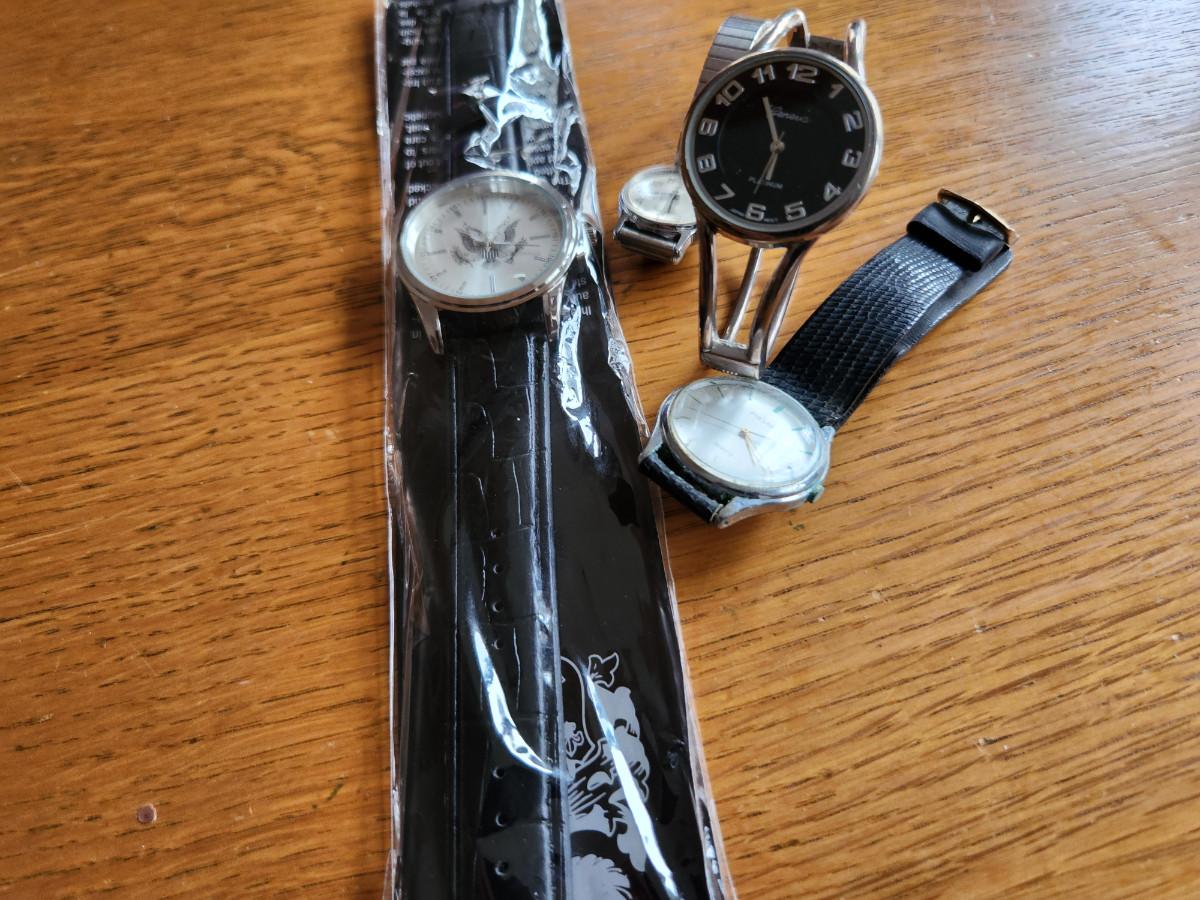 This auction lot is for a Cache of Watches found in the dresser draw of our last estate. The cache includes a nifty Tri-faceted Crystal Dunhill, Swiss Made Stainless Steel Ladies Watch, A new in package "Fashion" Watch, no makers name or marking but a nifty eagle represents on the watch face. Also included is a well-worn Pulsar Quartz watch, a Acqua Watch made in the Phillipines and a stylish Genova Platinum with a Japan movement. All five watches as a group for one bid.