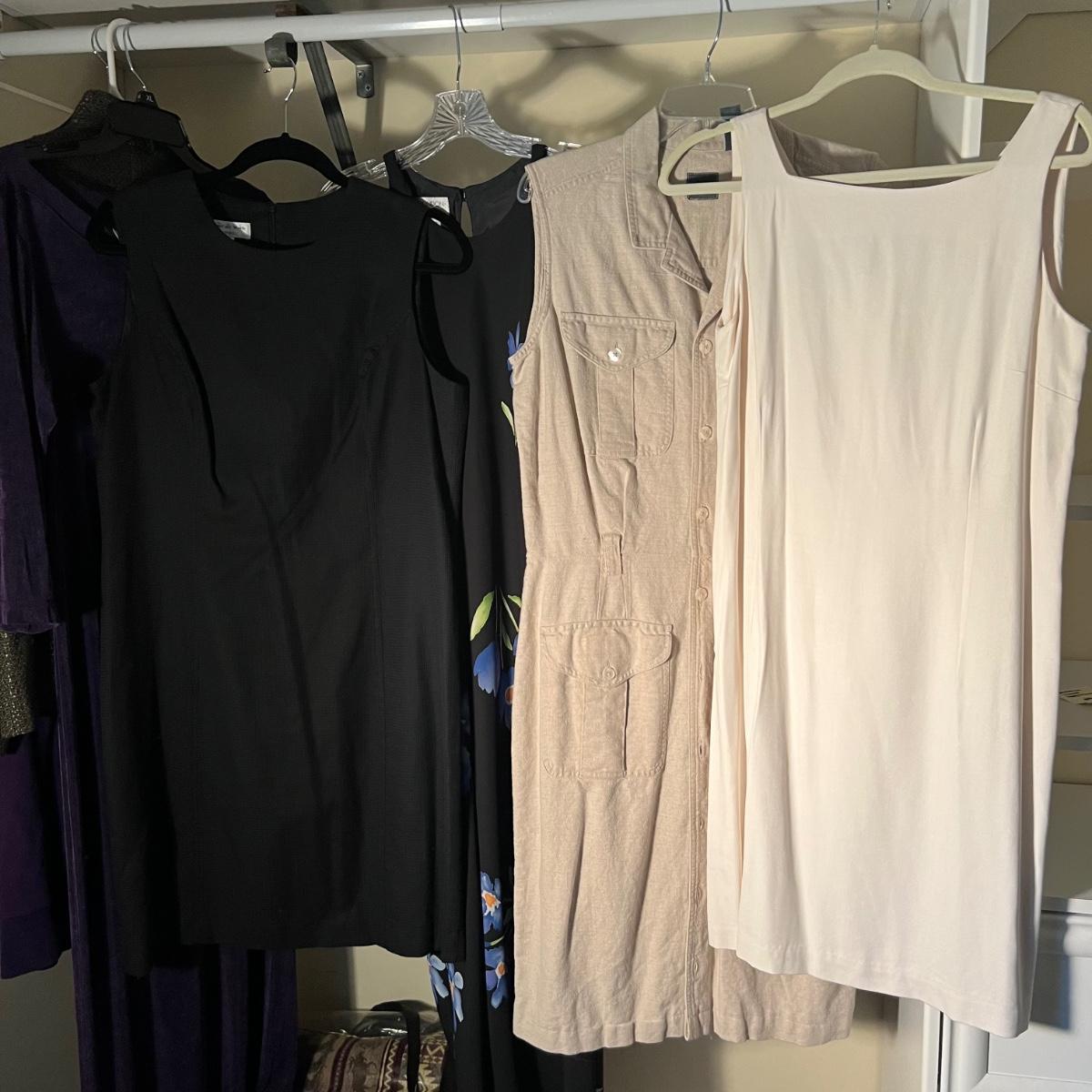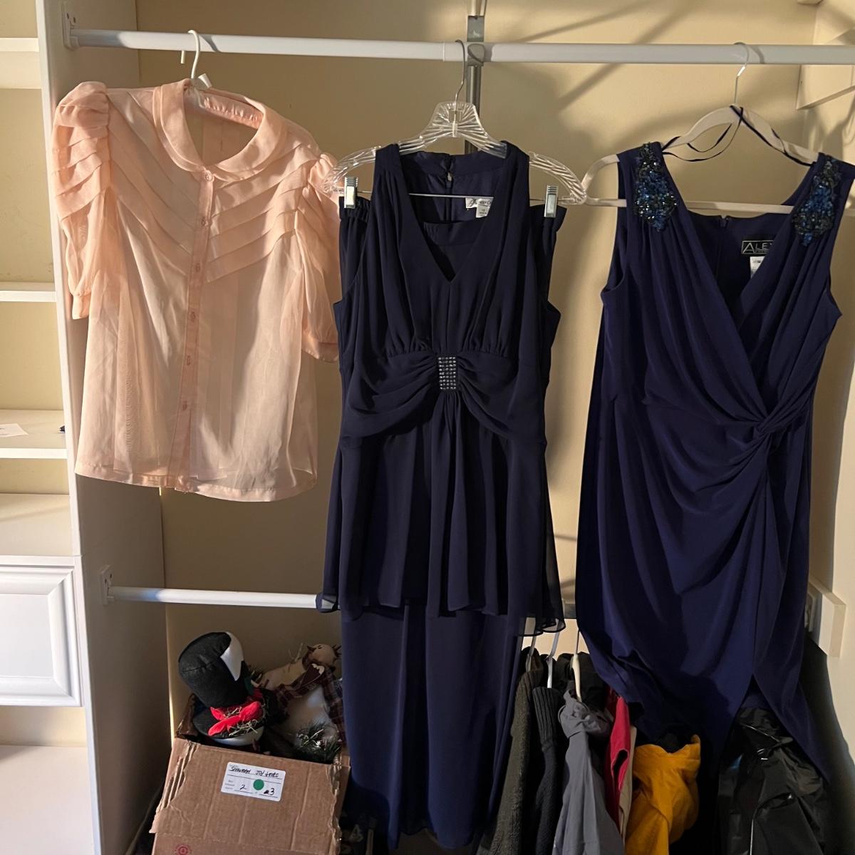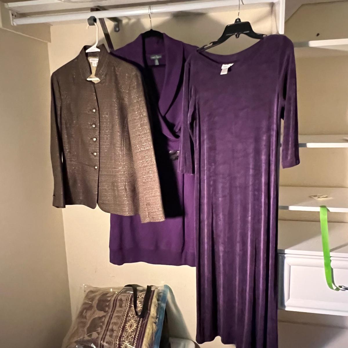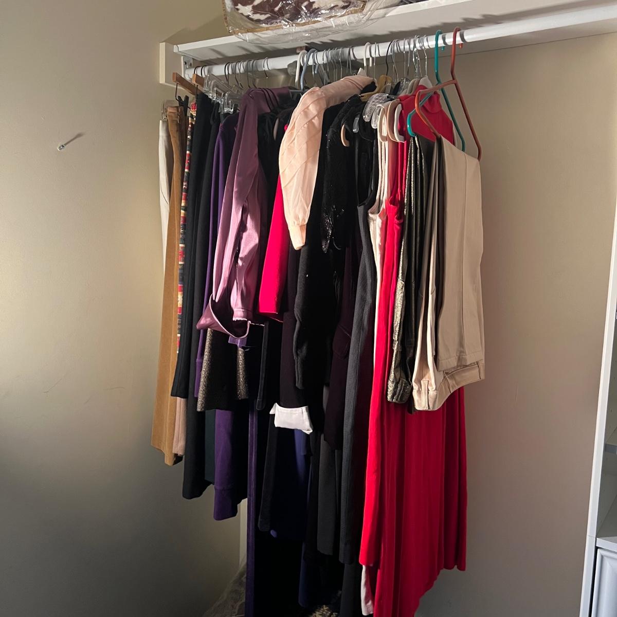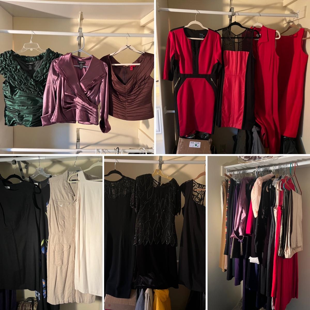 A large assortment of women’s clothing that includes evening wear to pretty summer dressers, satin pants and smart skirts. Sizes vary from small through to large. See pics for brands and sizes. Approximately two pairs of pants, eight skirts, jacket and over 15 dresses that includes a couple of two-piece outfits.