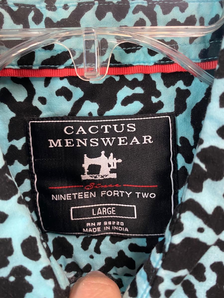Cactus Menswear retro style pattern button front shirt. Teal blue and black with watermelons. Size large, good condition.
