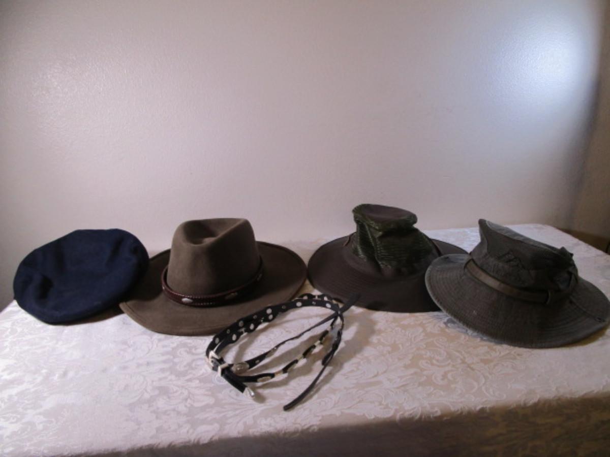 Stetson Cowboy hat size 7-5/8, two extra hat bands, newsboy hat, two fishing hats