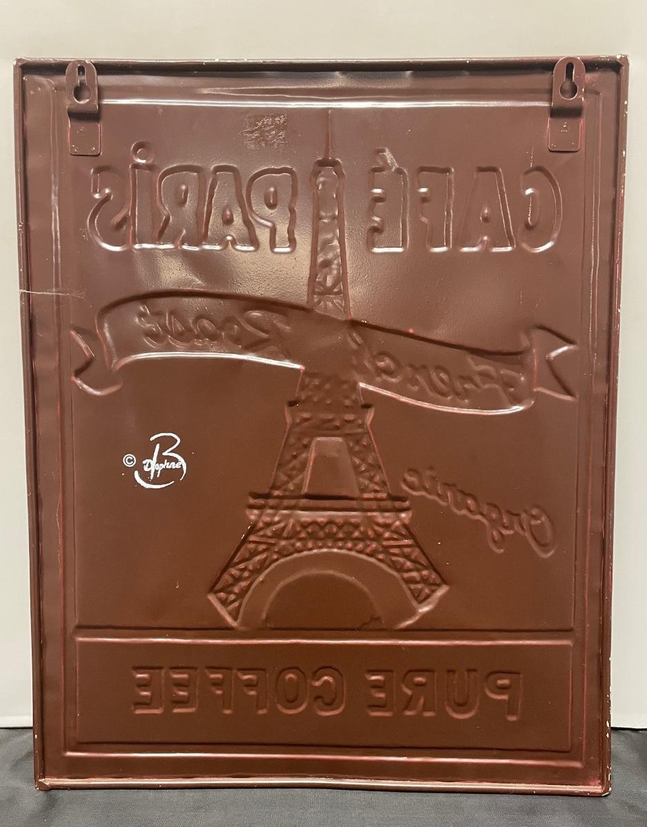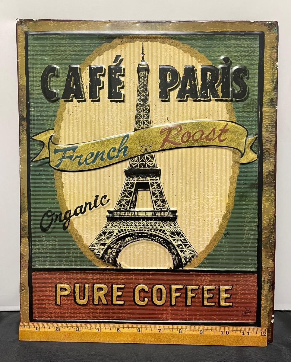 This item is in great condition. The front is supposed to appear roughed up. It is approximately 12.5” long and about 16.5” tall. The front reads: “Café Paris French Roast Organic Pure Coffee.” The sign has raised pictures so it looks and feels cooler. There is two things on the back to help for hanging the sign.