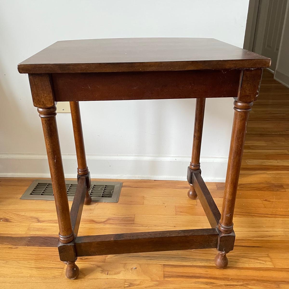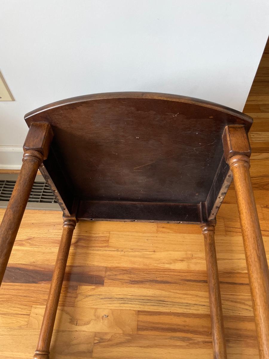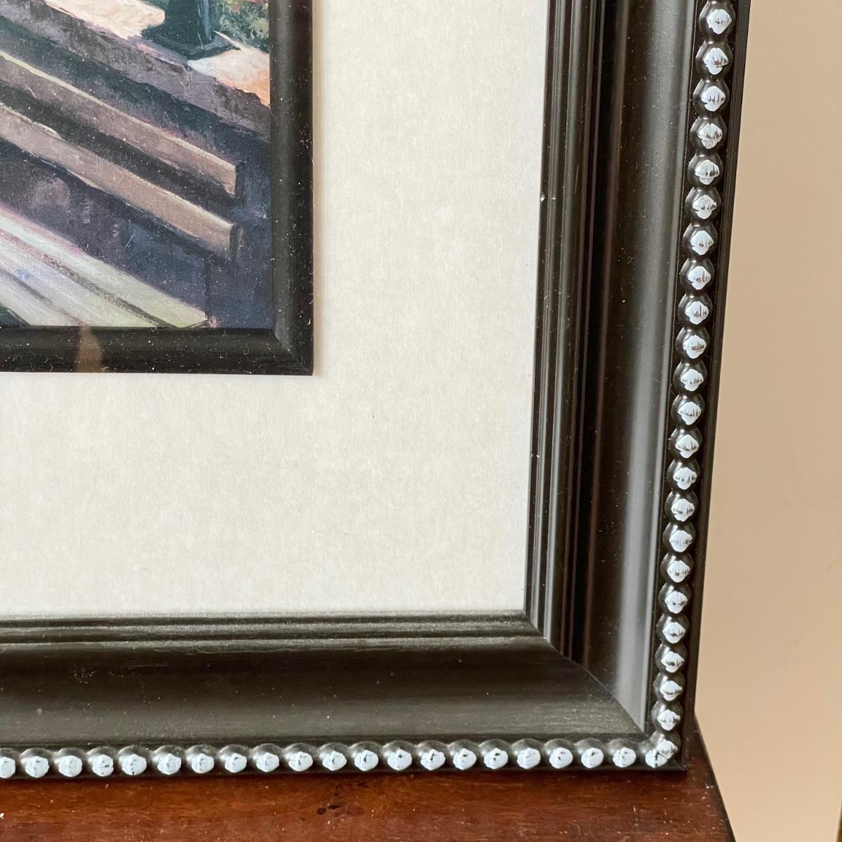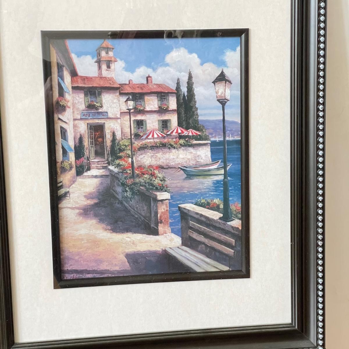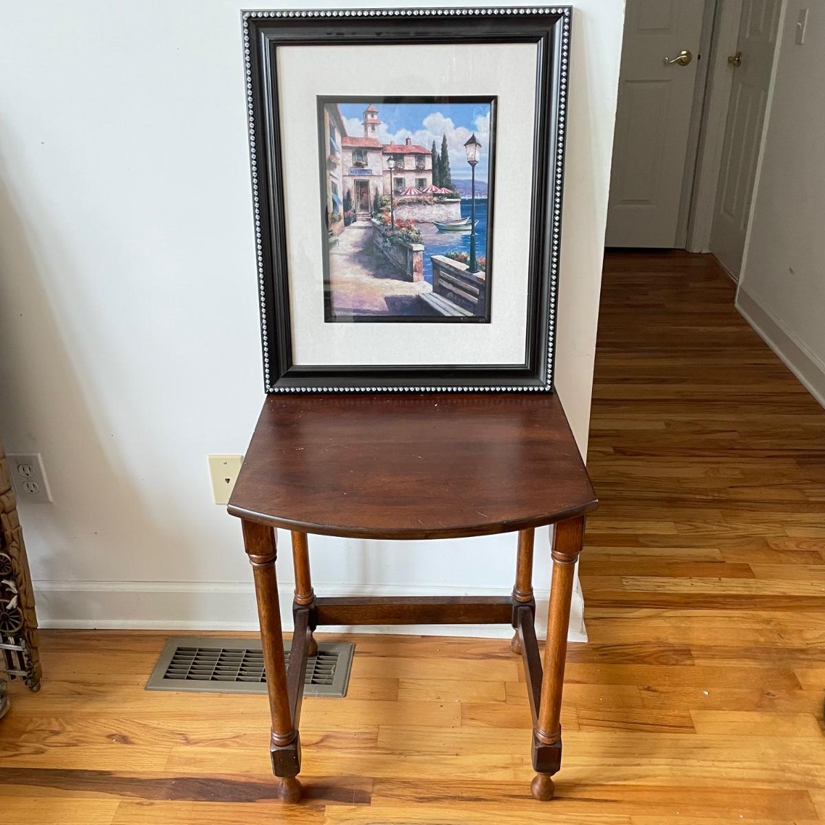 Nicely modern side table, it appears to be the top of a nesting set, but it is offered solo with a framed cafe art. The table measures 20” x 18.5” x 24” with dark wood grains and the legs have nice designs as well. The top shows some blemishes. See images. The art appears to be a cafe in a Mediterranean region, no known signature. The wood frame is painted black and silver, it measures 19.5” x 23.5”. Local pick up only.