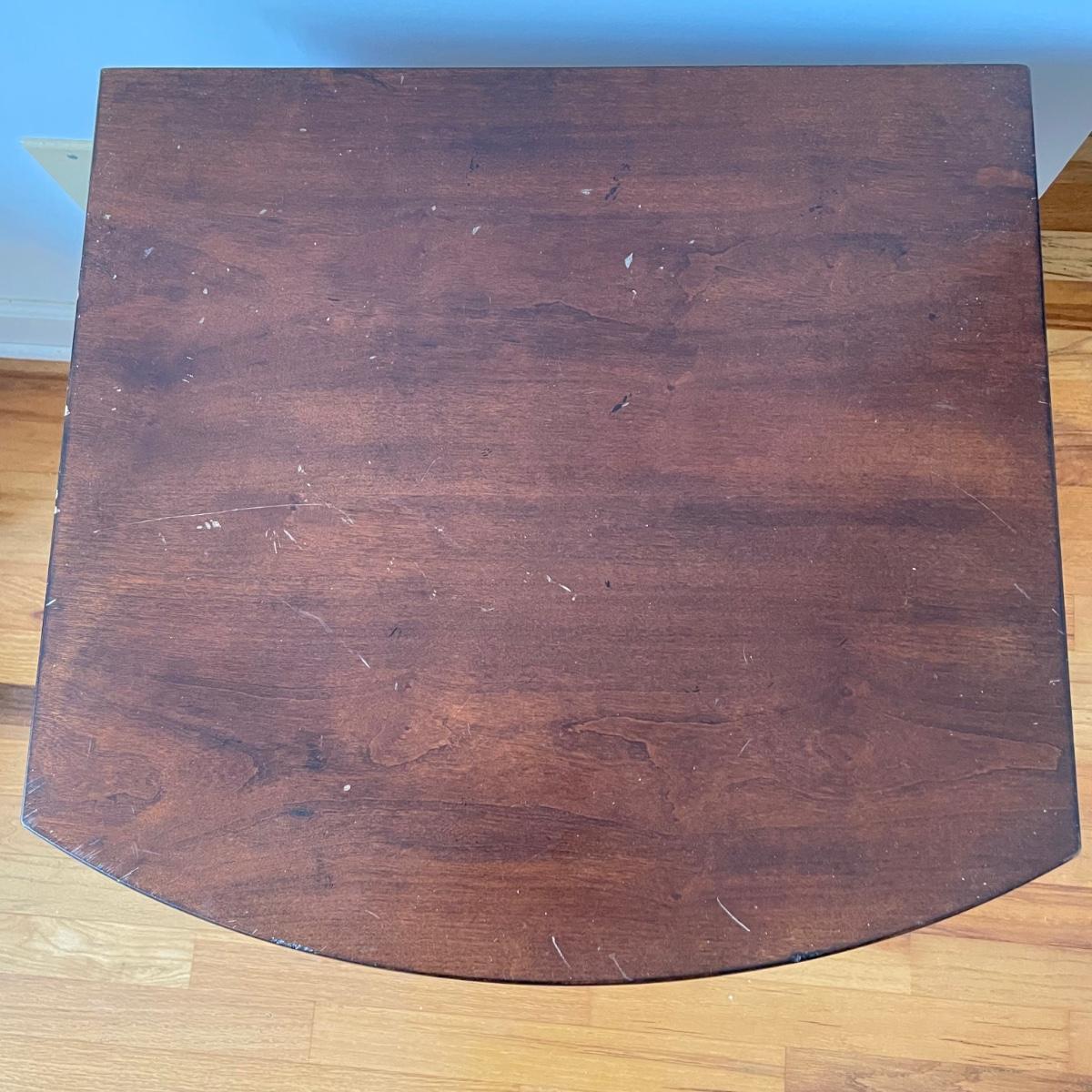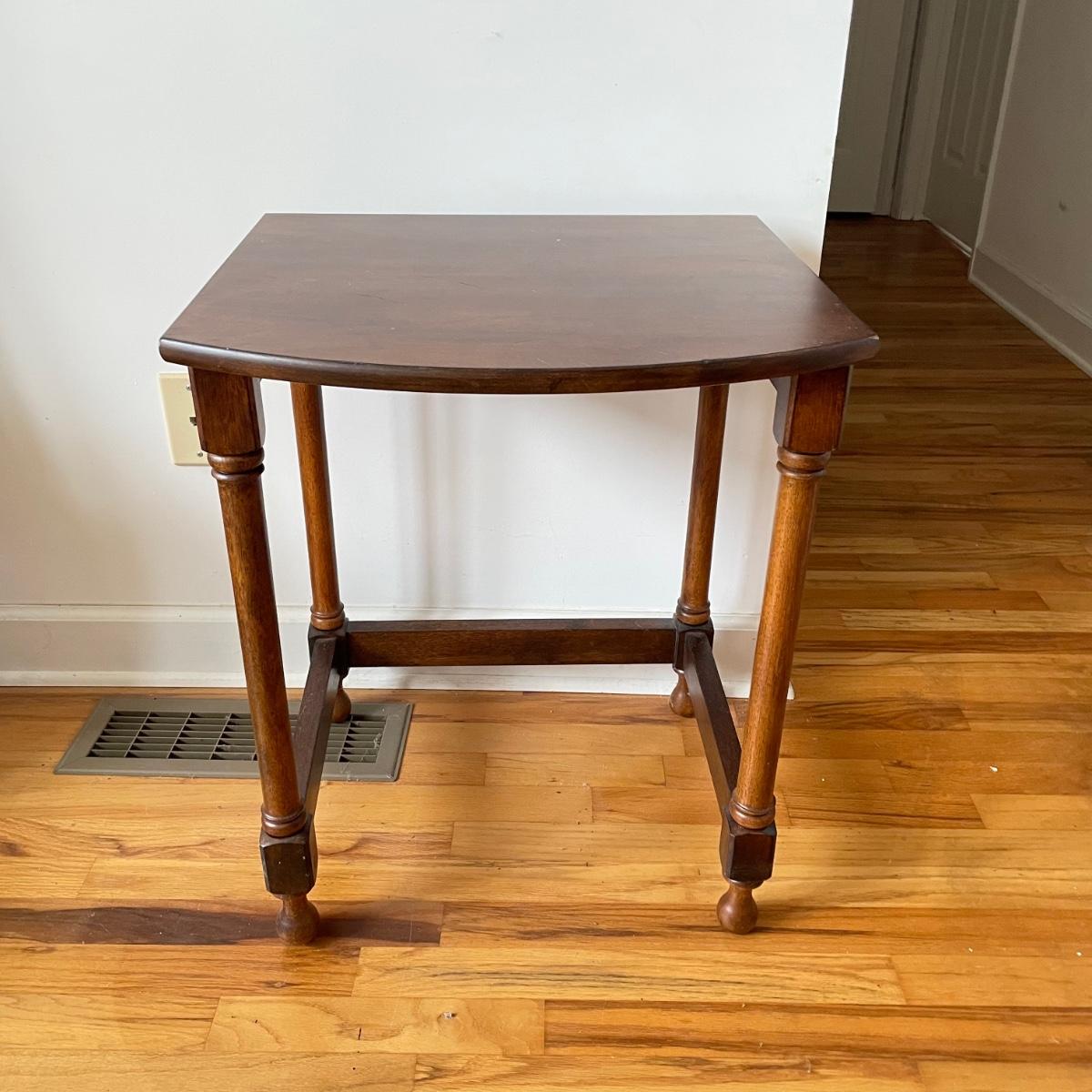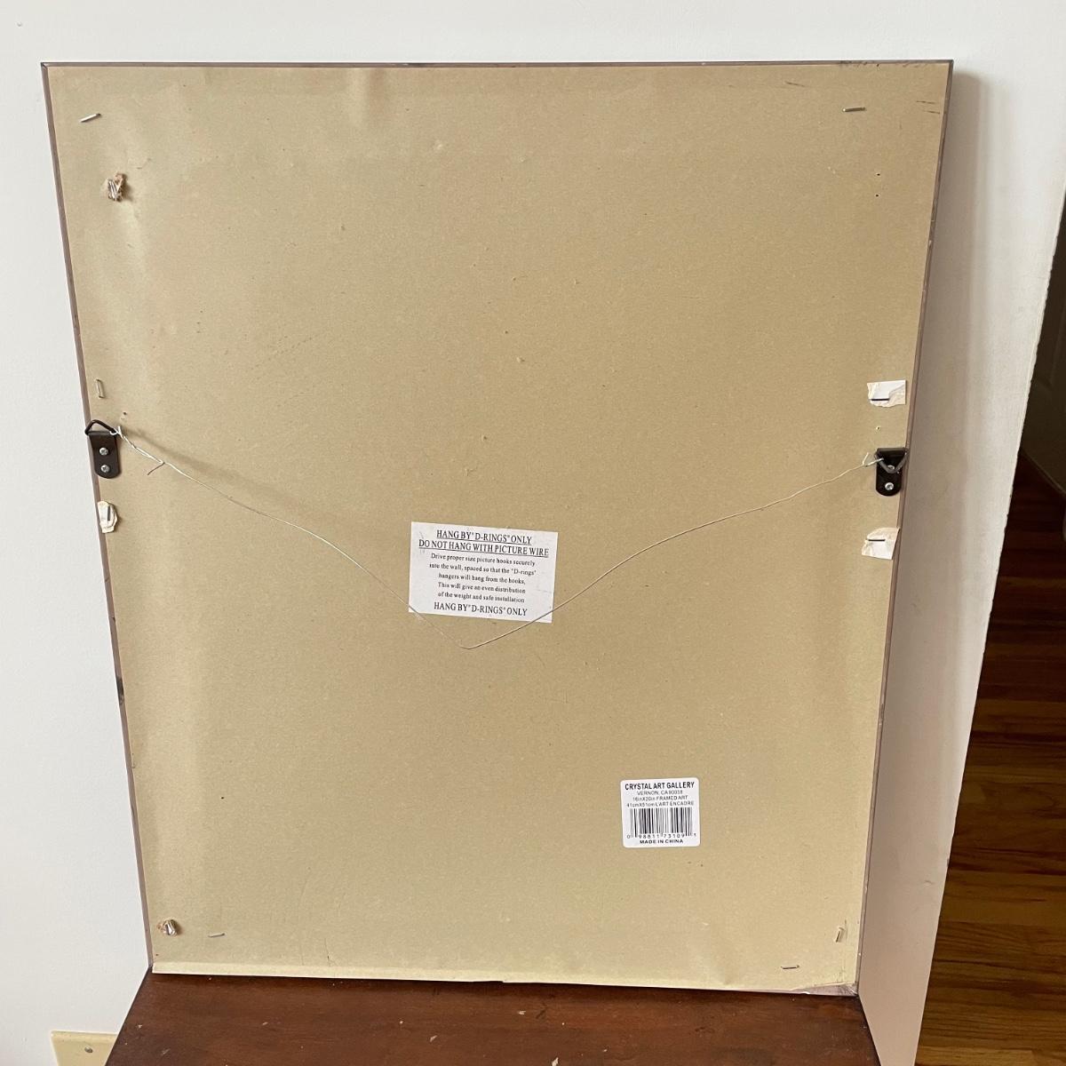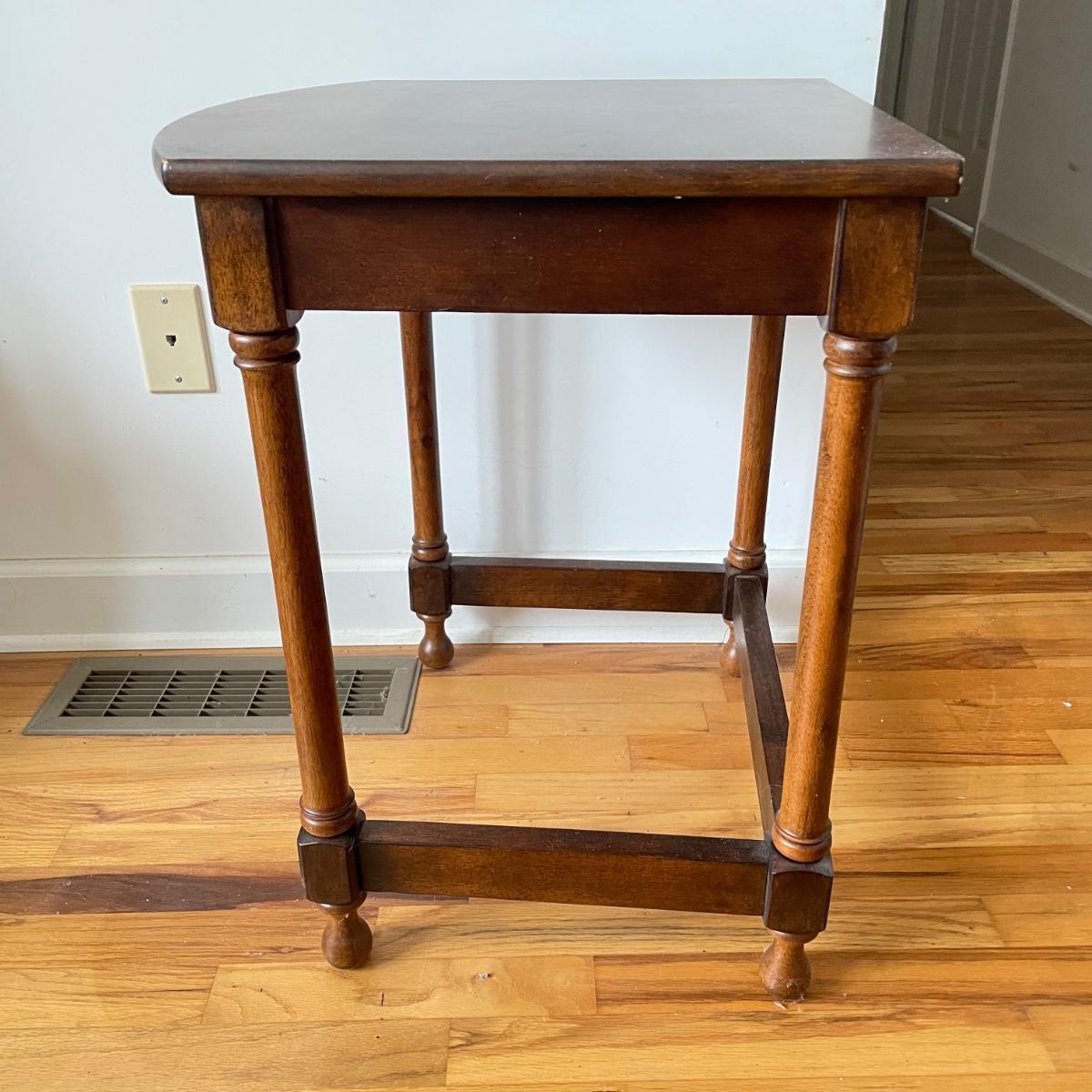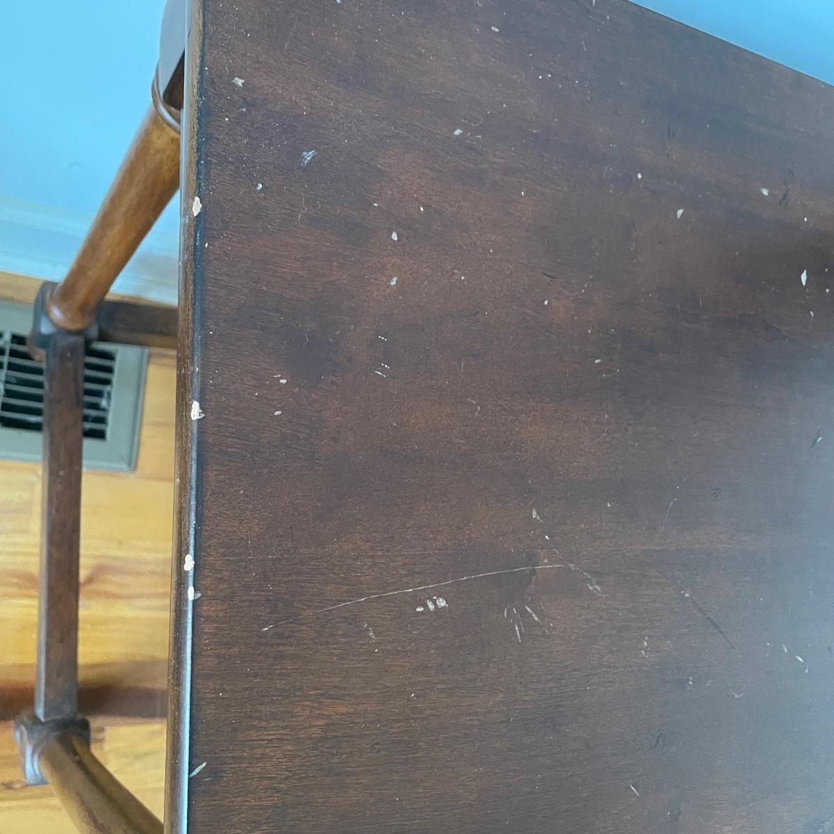 Nicely modern side table, it appears to be the top of a nesting set, but it is offered solo with a framed cafe art. The table measures 20” x 18.5” x 24” with dark wood grains and the legs have nice designs as well. The top shows some blemishes. See images. The art appears to be a cafe in a Mediterranean region, no known signature. The wood frame is painted black and silver, it measures 19.5” x 23.5”. Local pick up only.