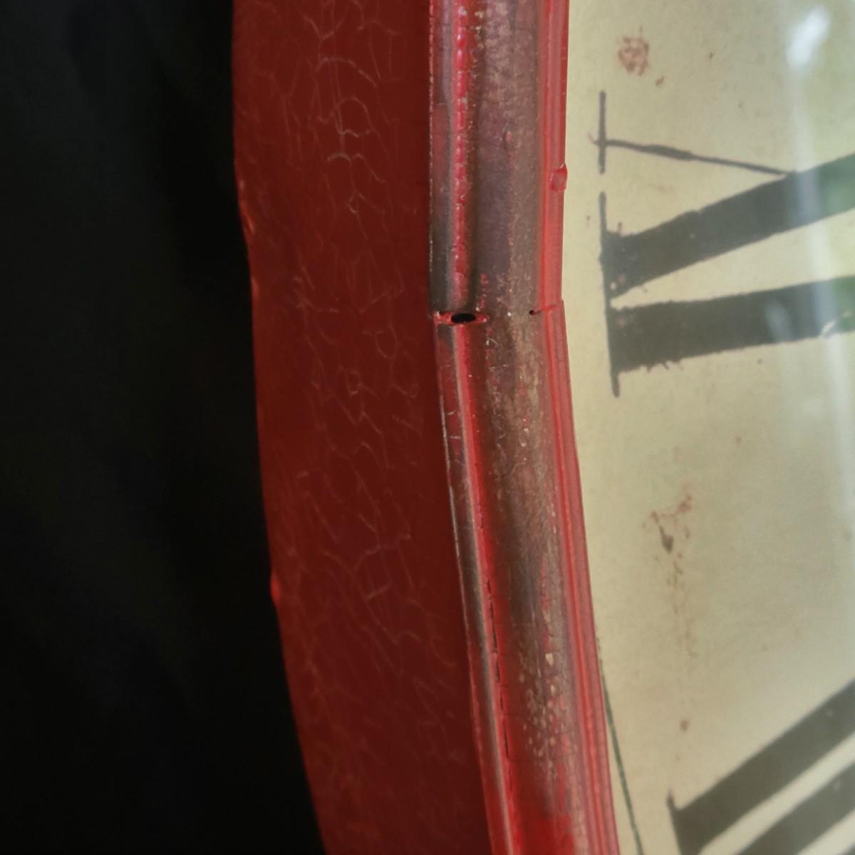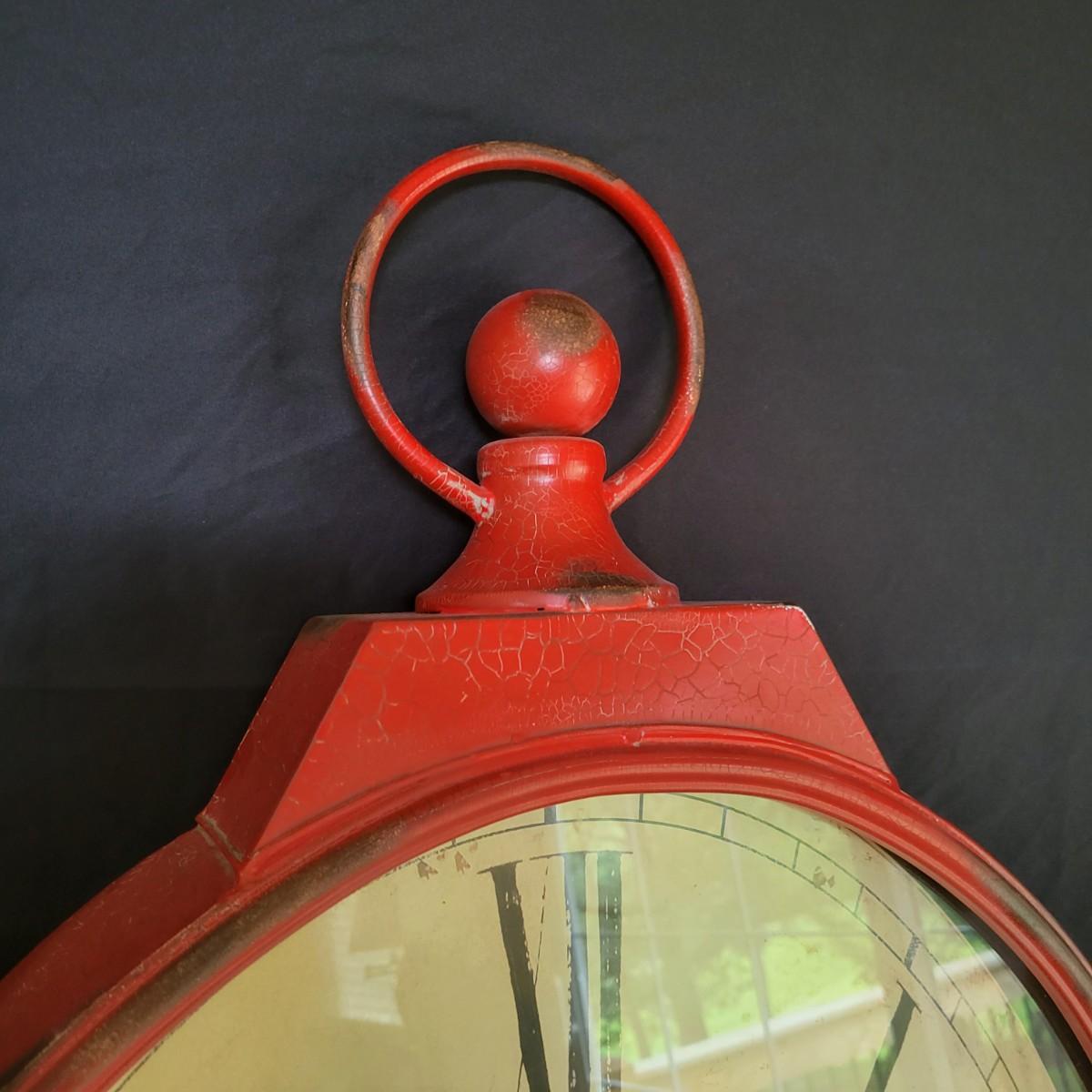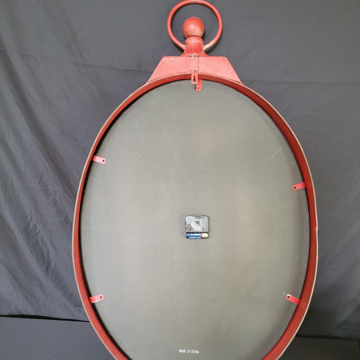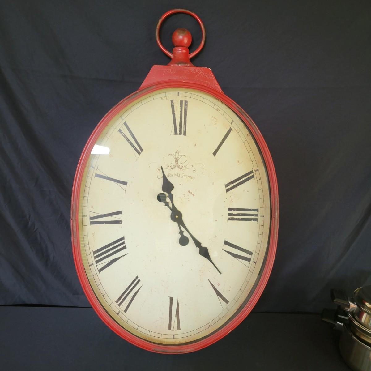 A decorative wall clock from Pier 1 that is stamped Cafe de Margeurites. It has a antiqued red finish with a battery powered clock. It measures approximately 22" x 4" x 37"H. Local pickup only