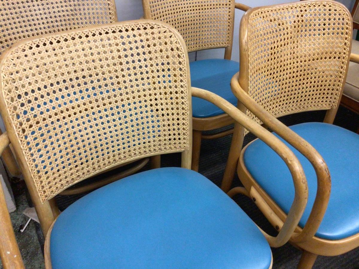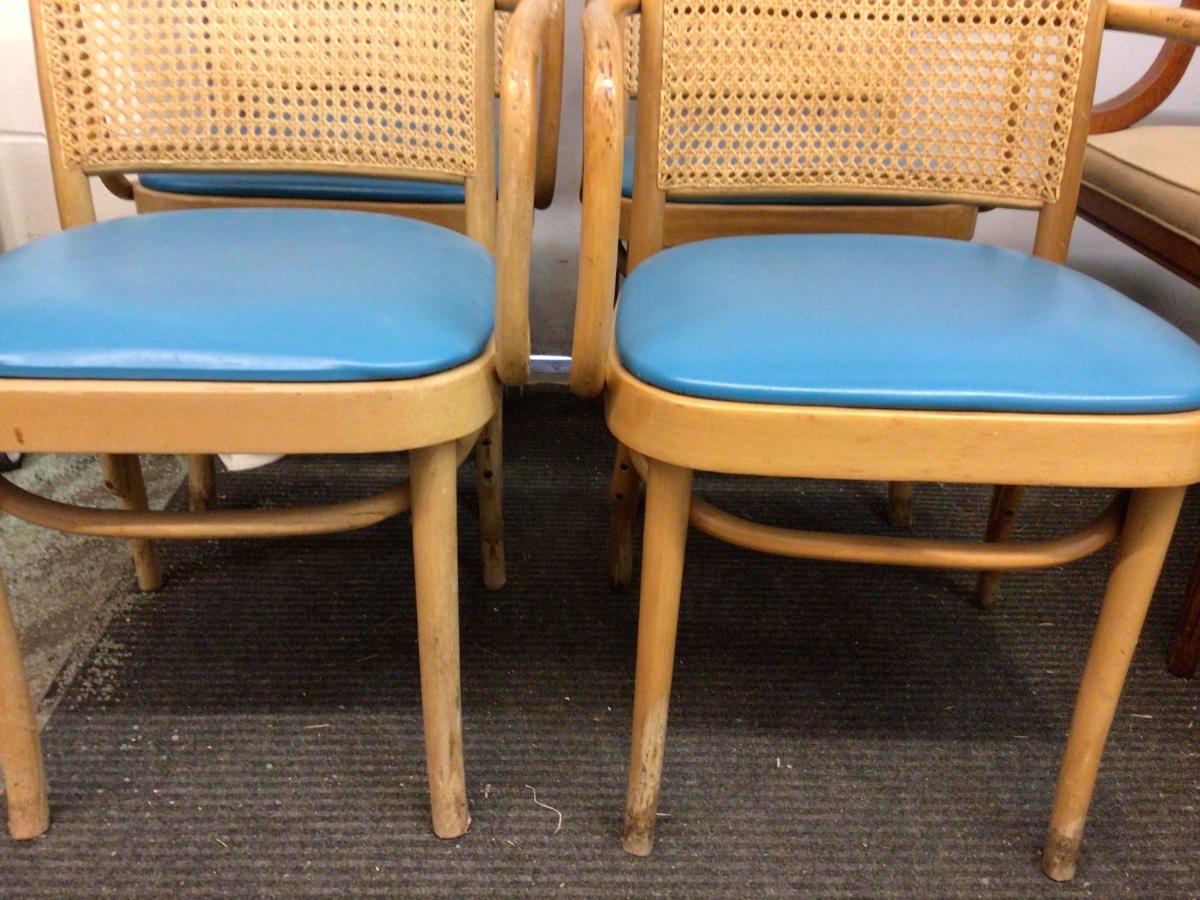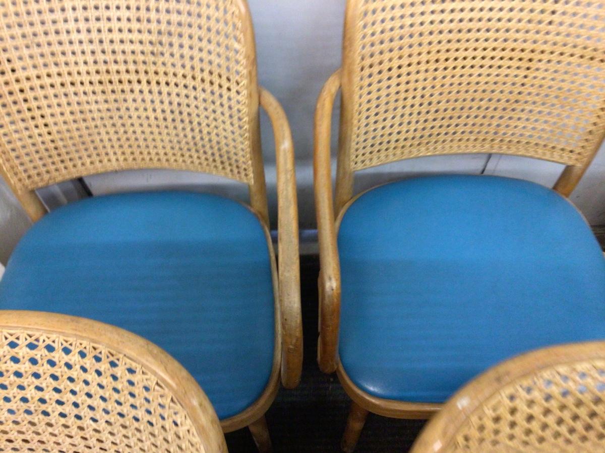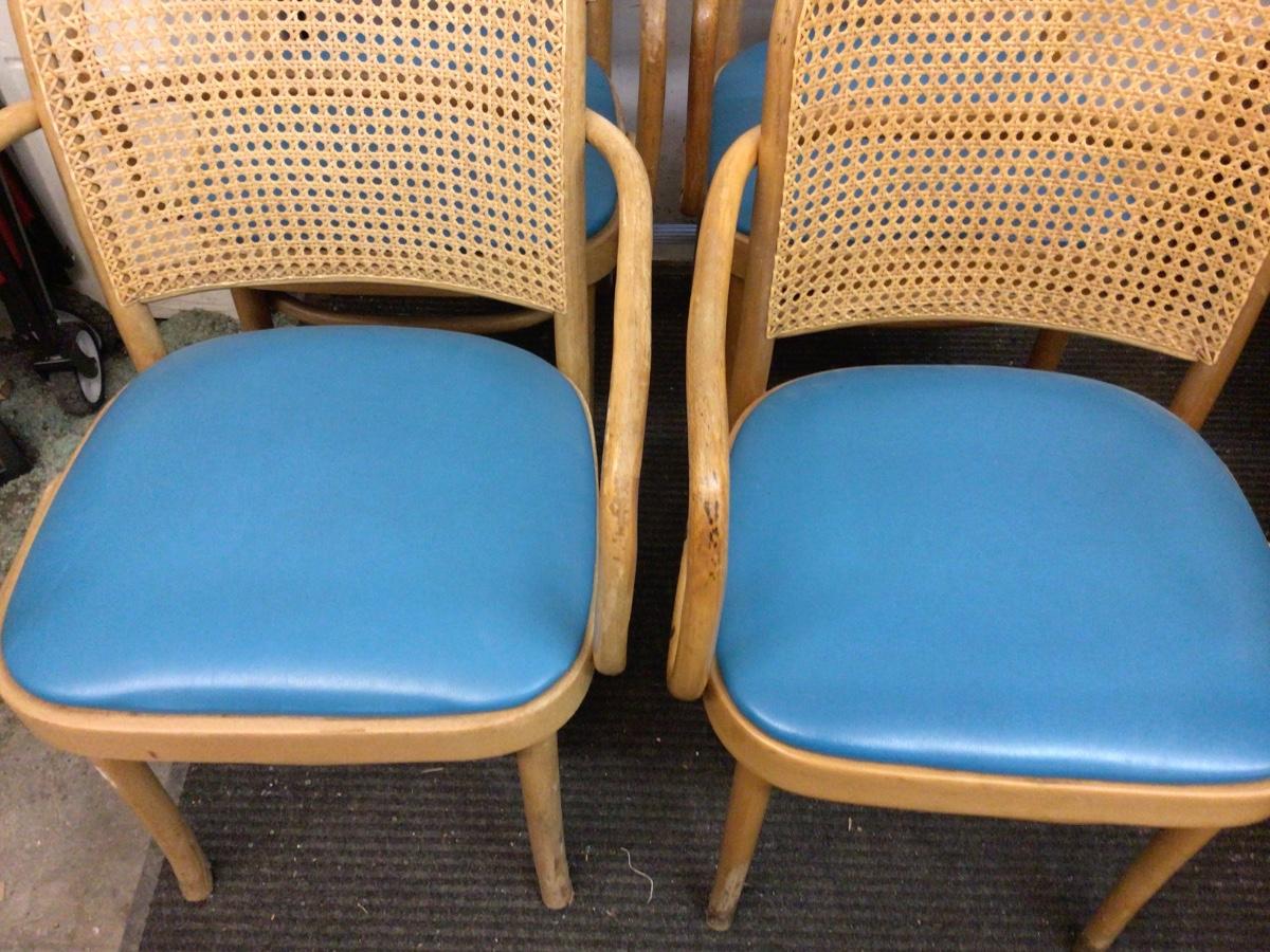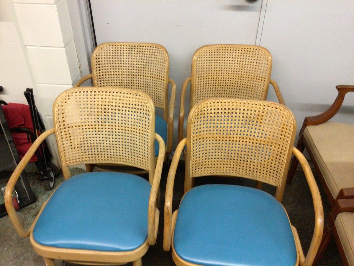 These are a great set of four Cain backed blue cushion chairs. The seats do not have any rips or holes. In really good condition very sturdy. Nice set.