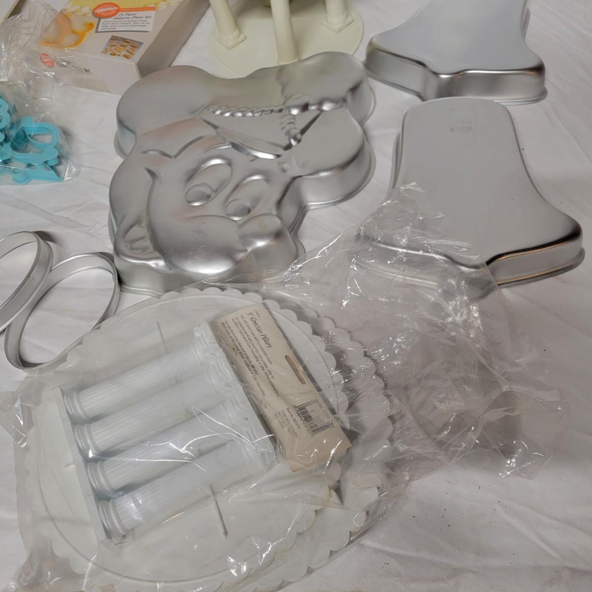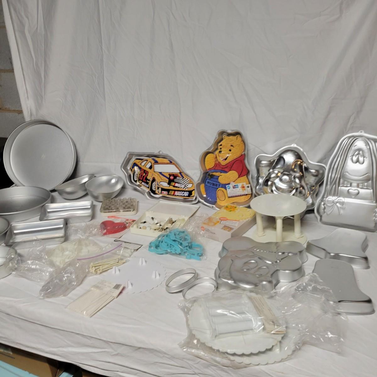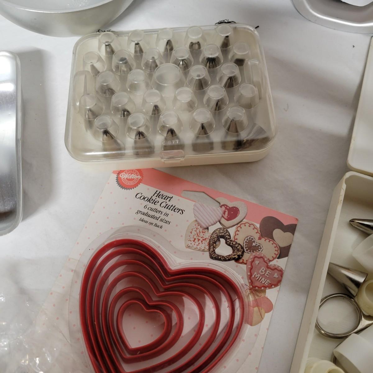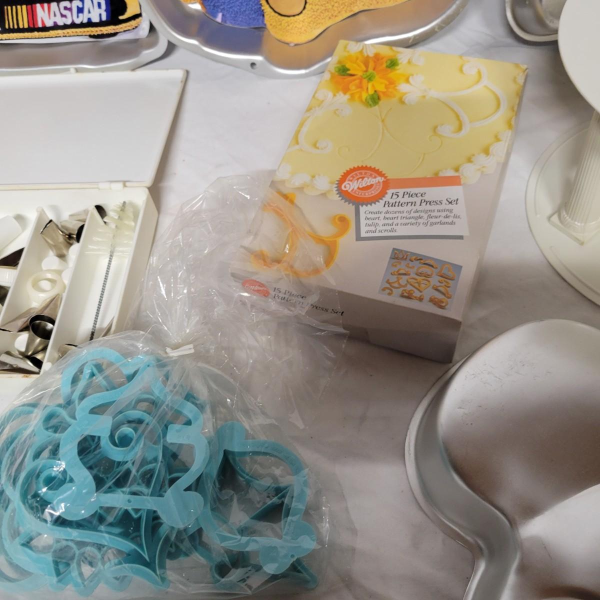 An assortment of cake decorating supplies that includes Wilton cake molds and pans, piping tips, pattern press sets and more. The largest cake pan measures approximately 14.5"D x 2"H. Local pickup only