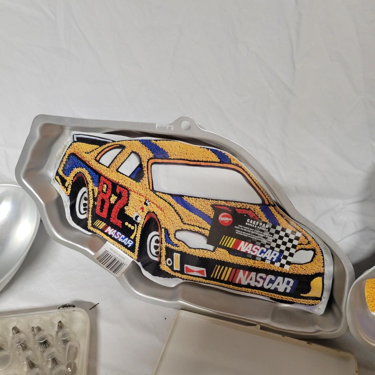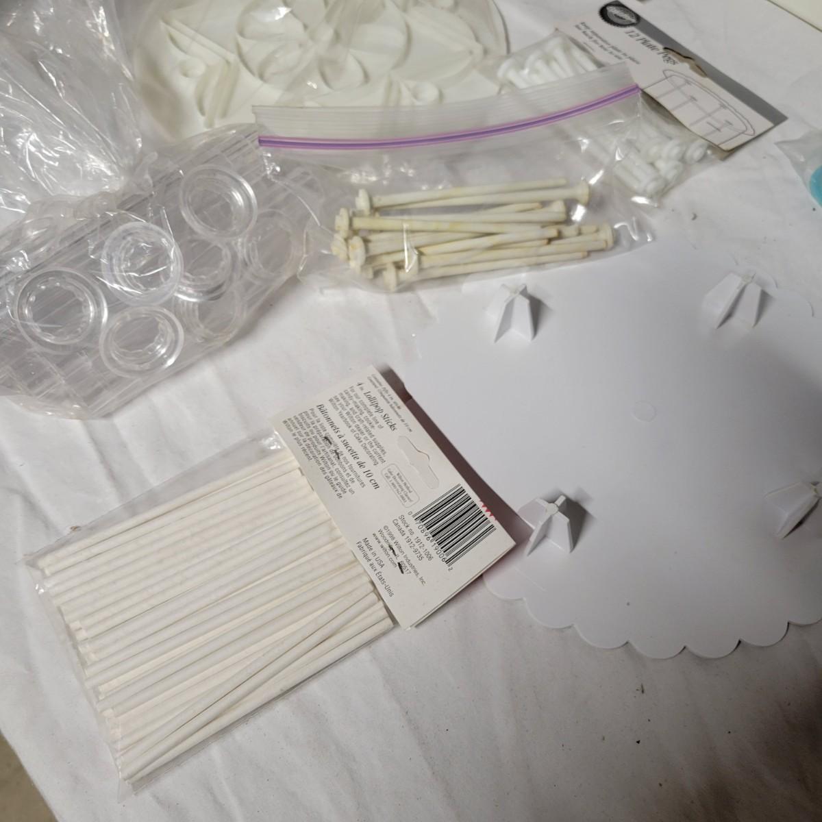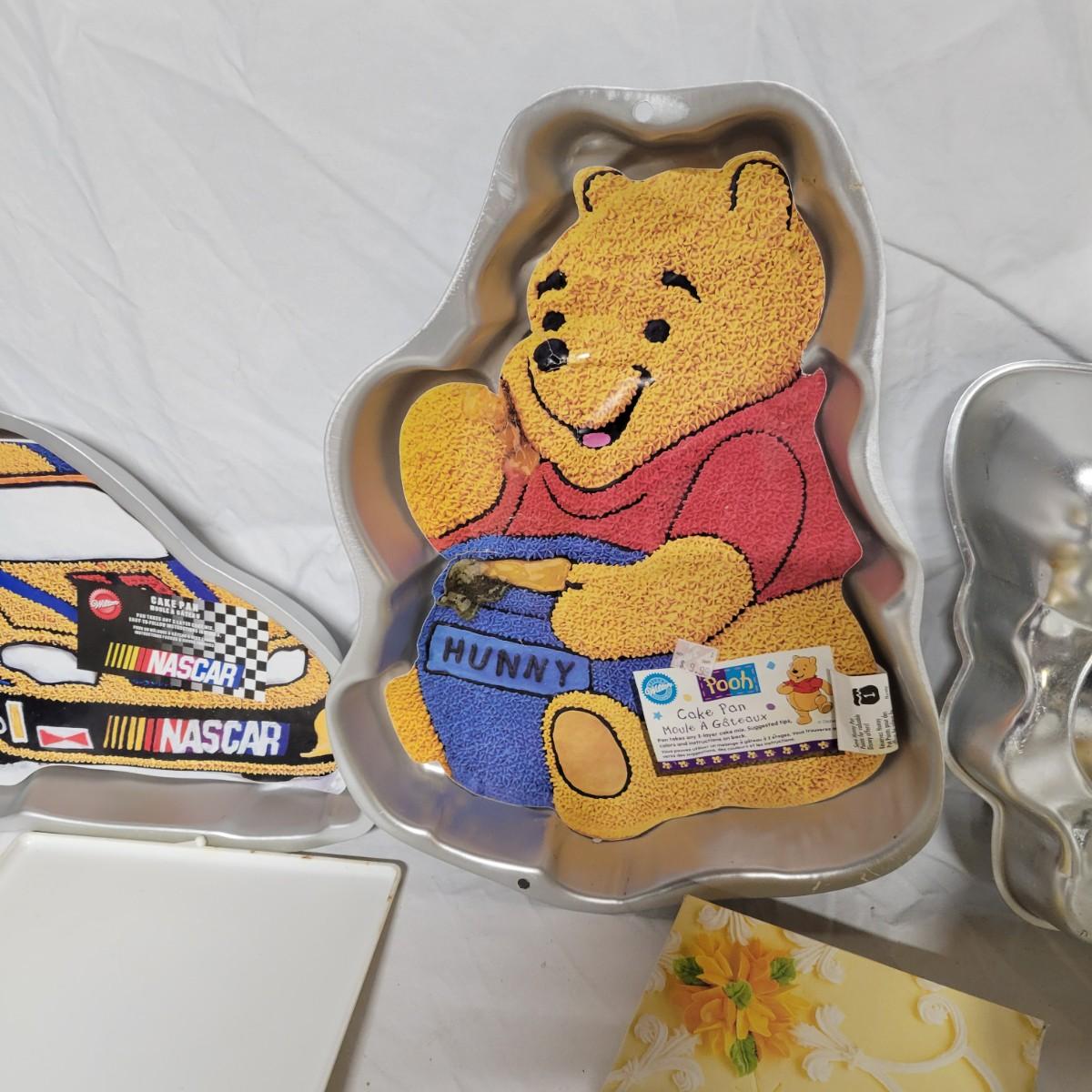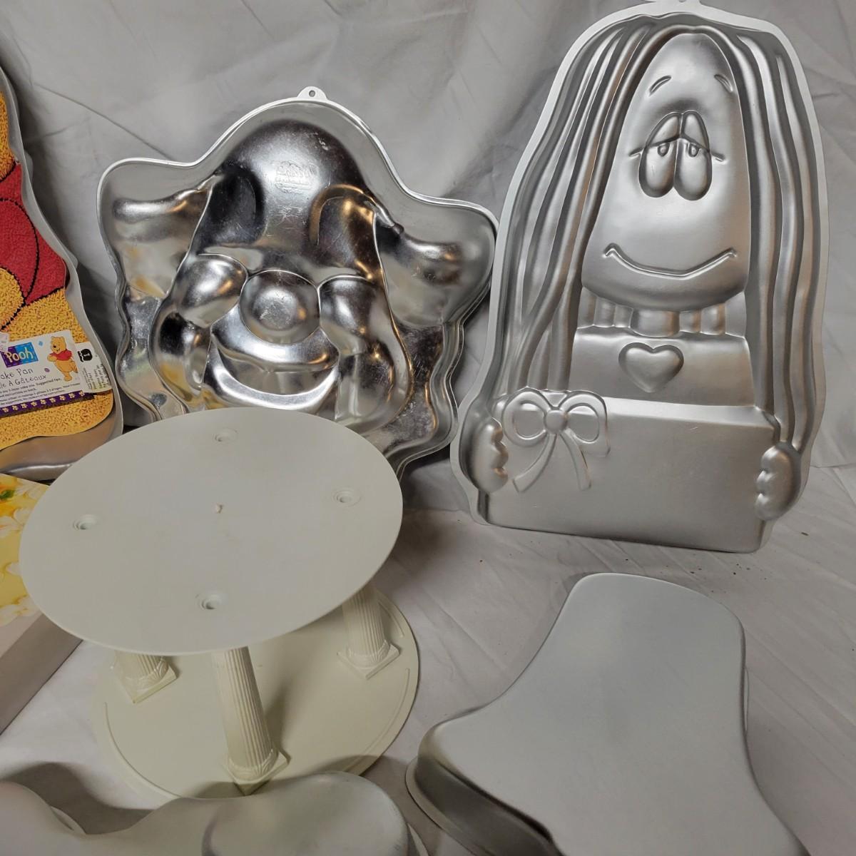 An assortment of cake decorating supplies that includes Wilton cake molds and pans, piping tips, pattern press sets and more. The largest cake pan measures approximately 14.5"D x 2"H. Local pickup only