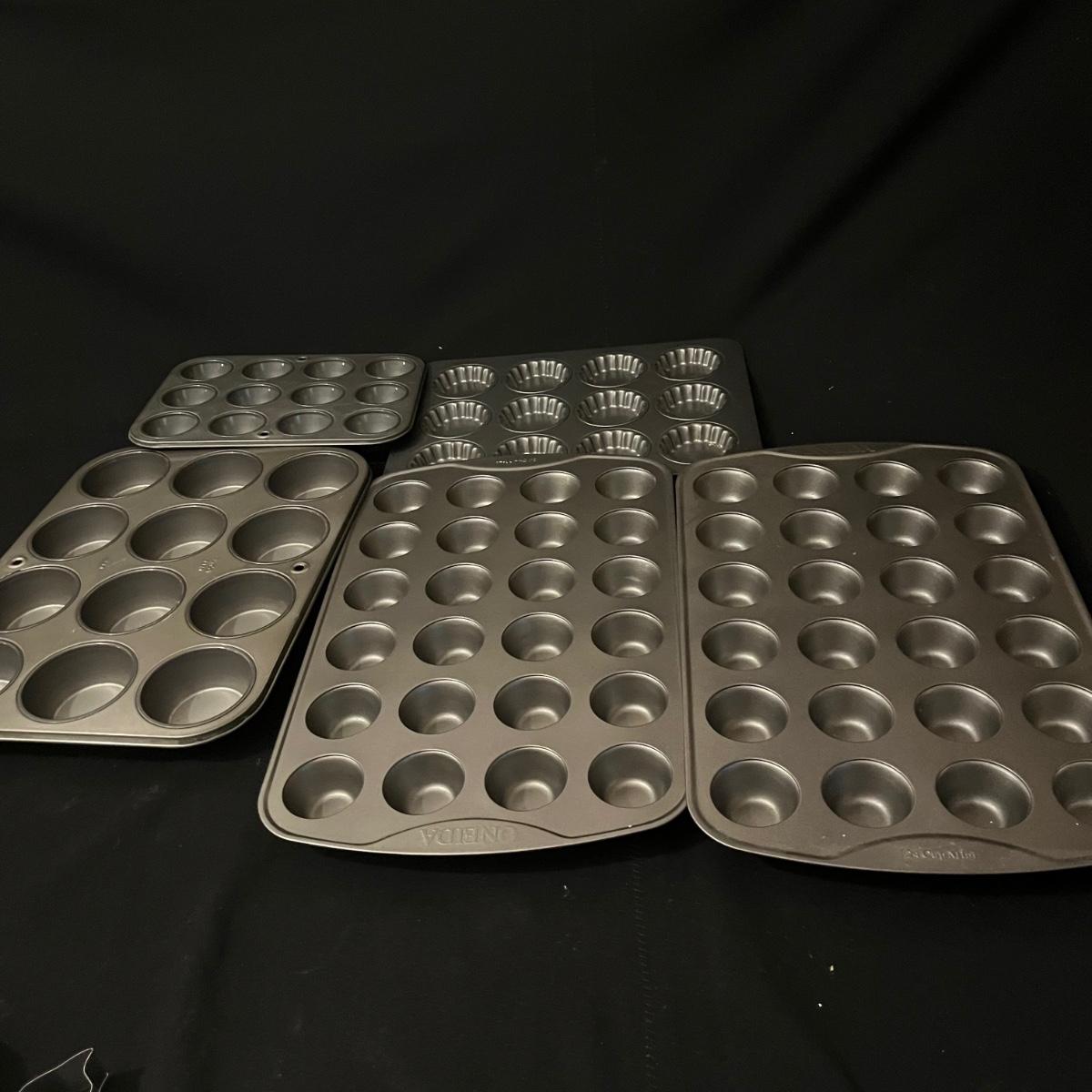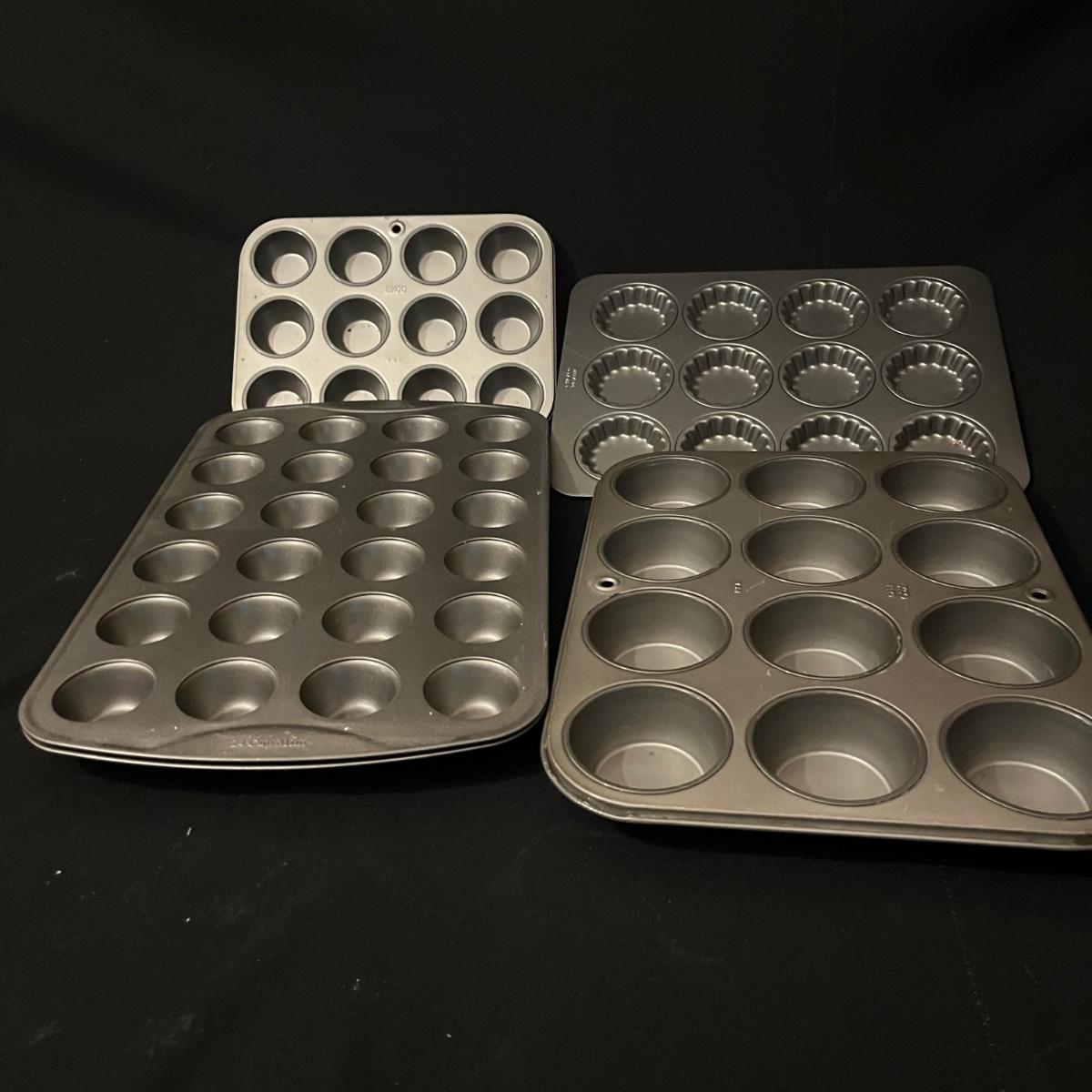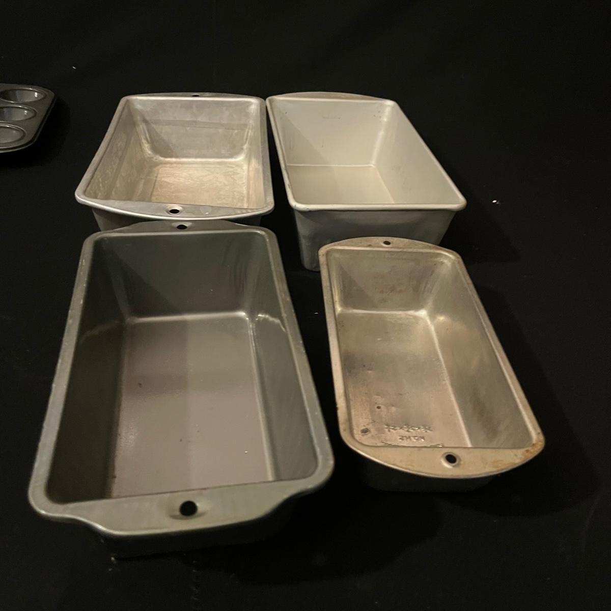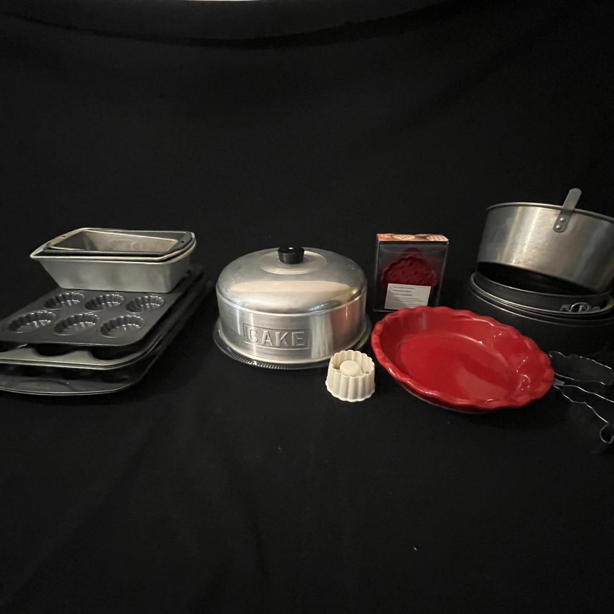 Lot includes a metal cake holder with glass bottom, Emile Henry ceramic pie plate, Williams and Sonoma pocket pie mold, four bread pans four cupcake pans, tart pan, three cake pans and three cookie cutters.