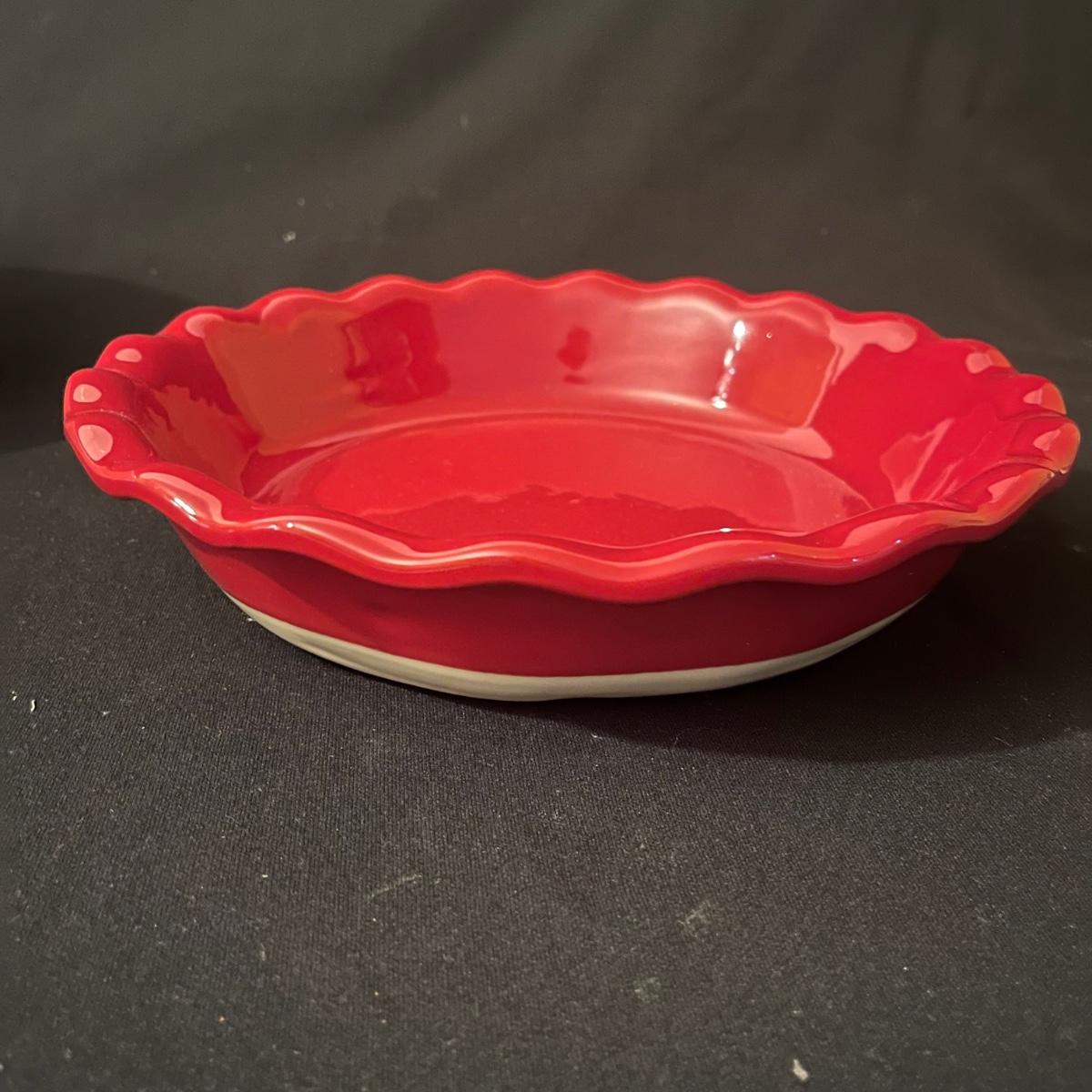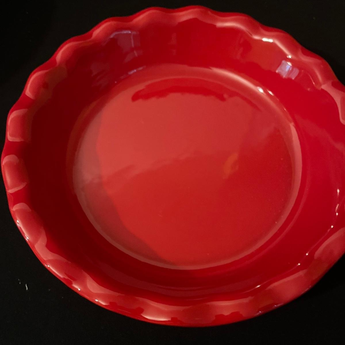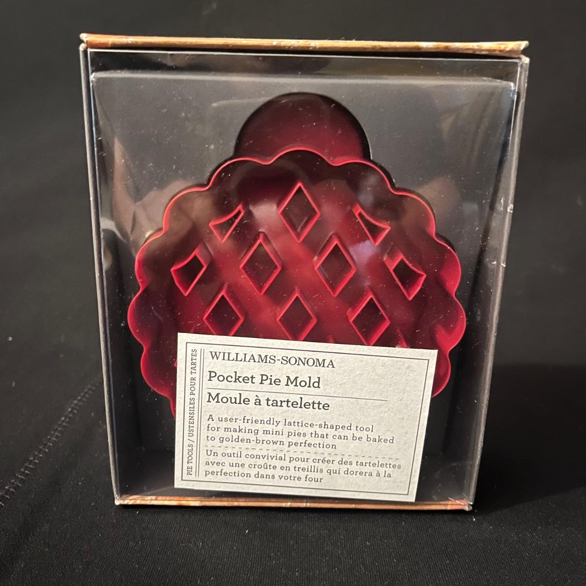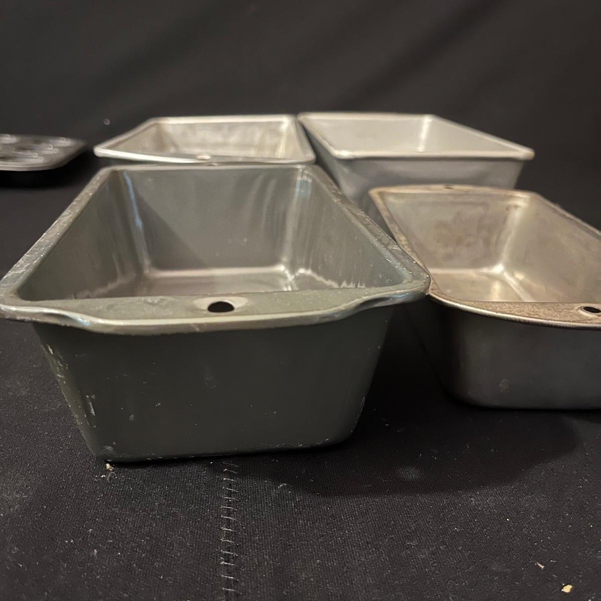 Lot includes a metal cake holder with glass bottom, Emile Henry ceramic pie plate, Williams and Sonoma pocket pie mold, four bread pans four cupcake pans, tart pan, three cake pans and three cookie cutters.