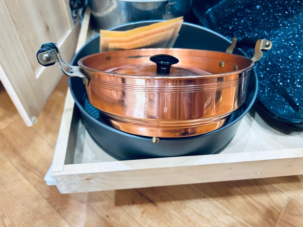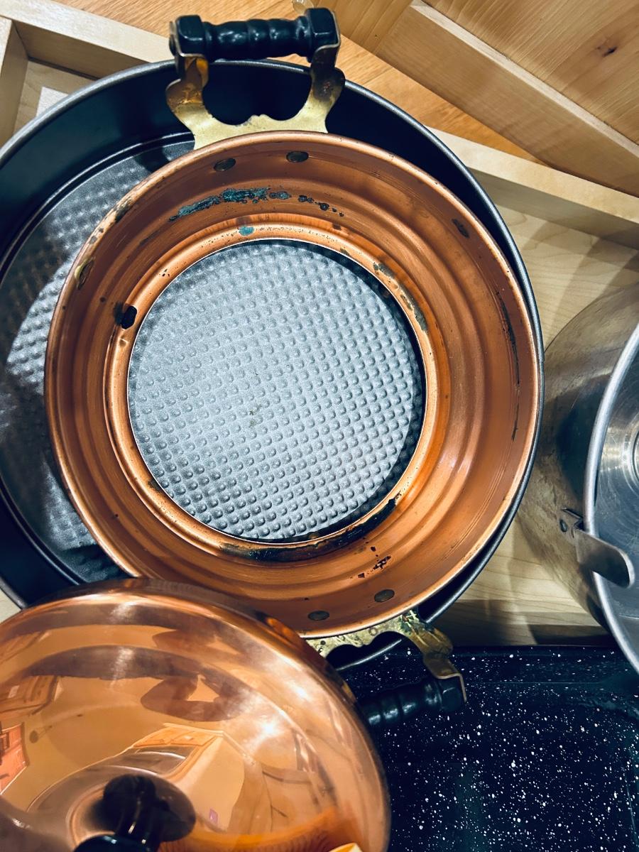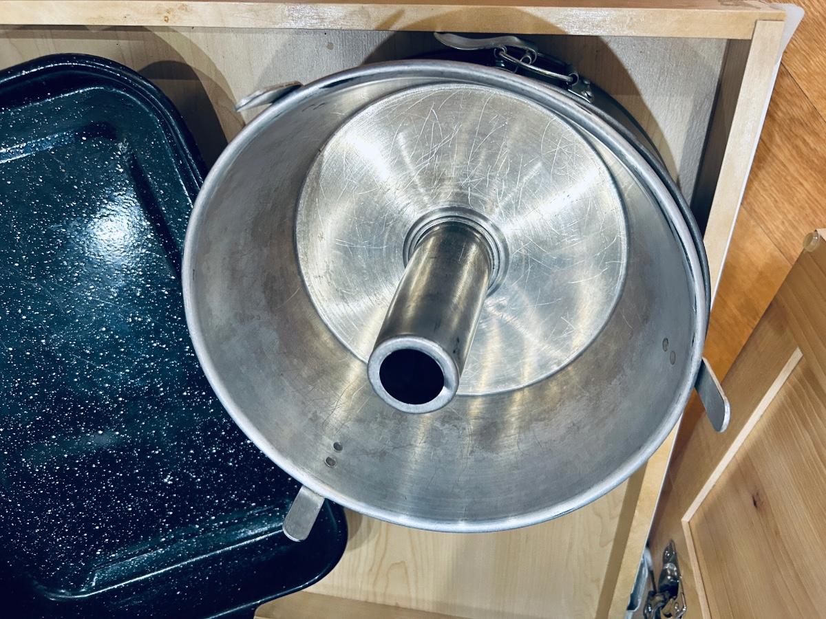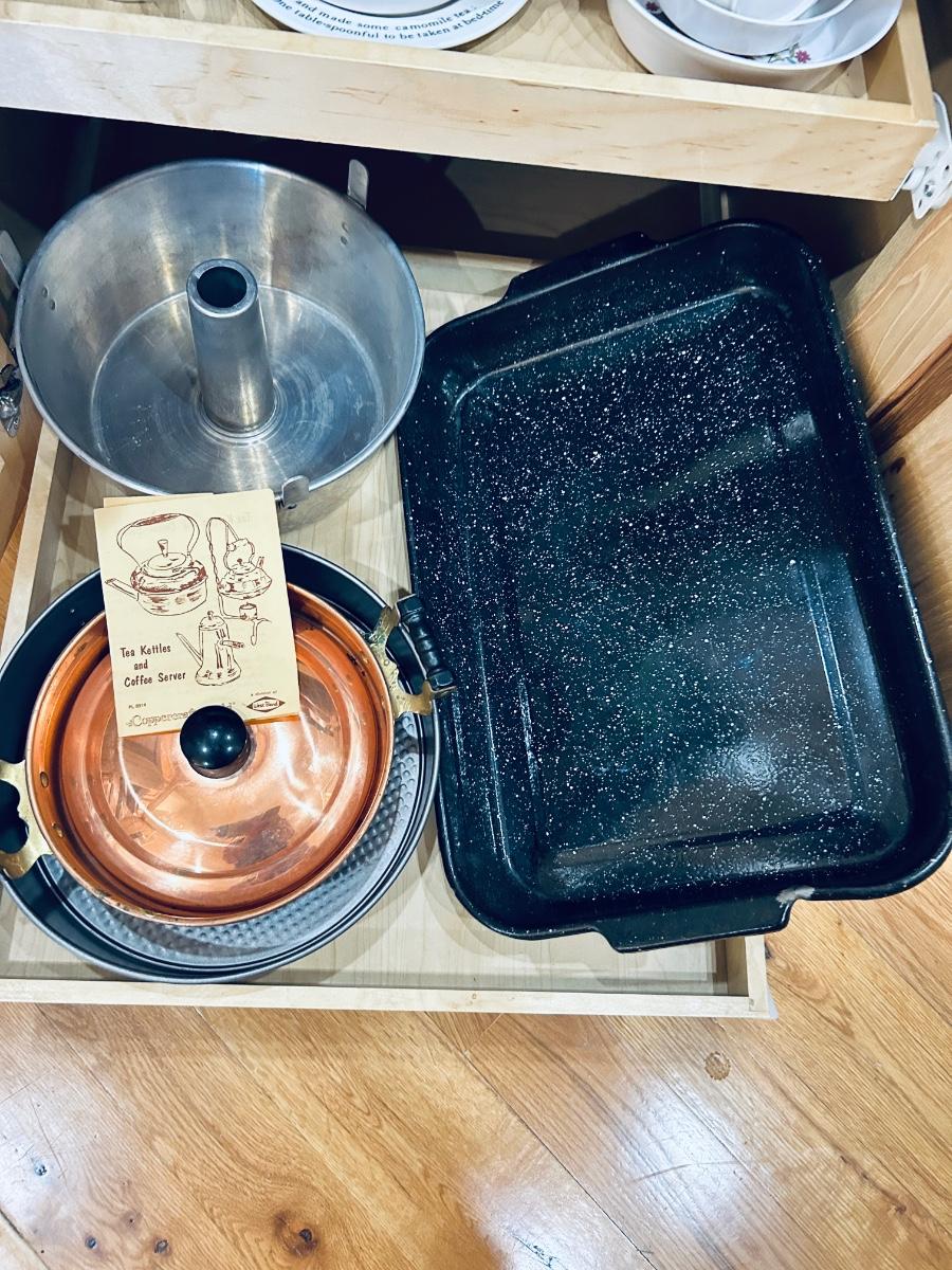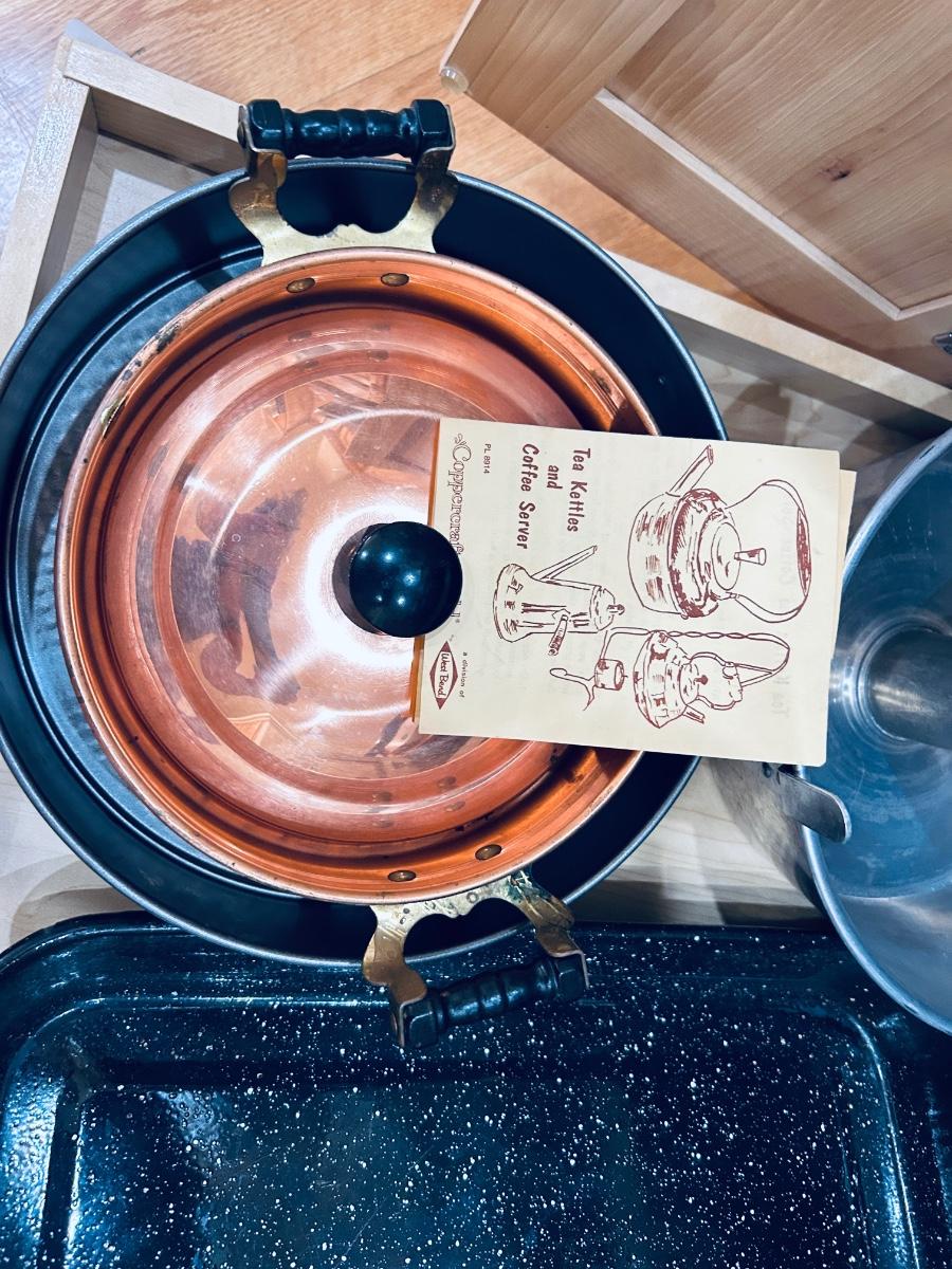 CAKE PAN, ROASTER PAN, COPPER KETTLE SERVER & A BUNT PAN