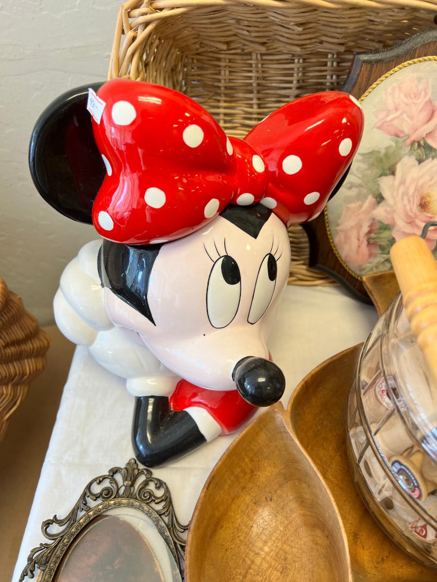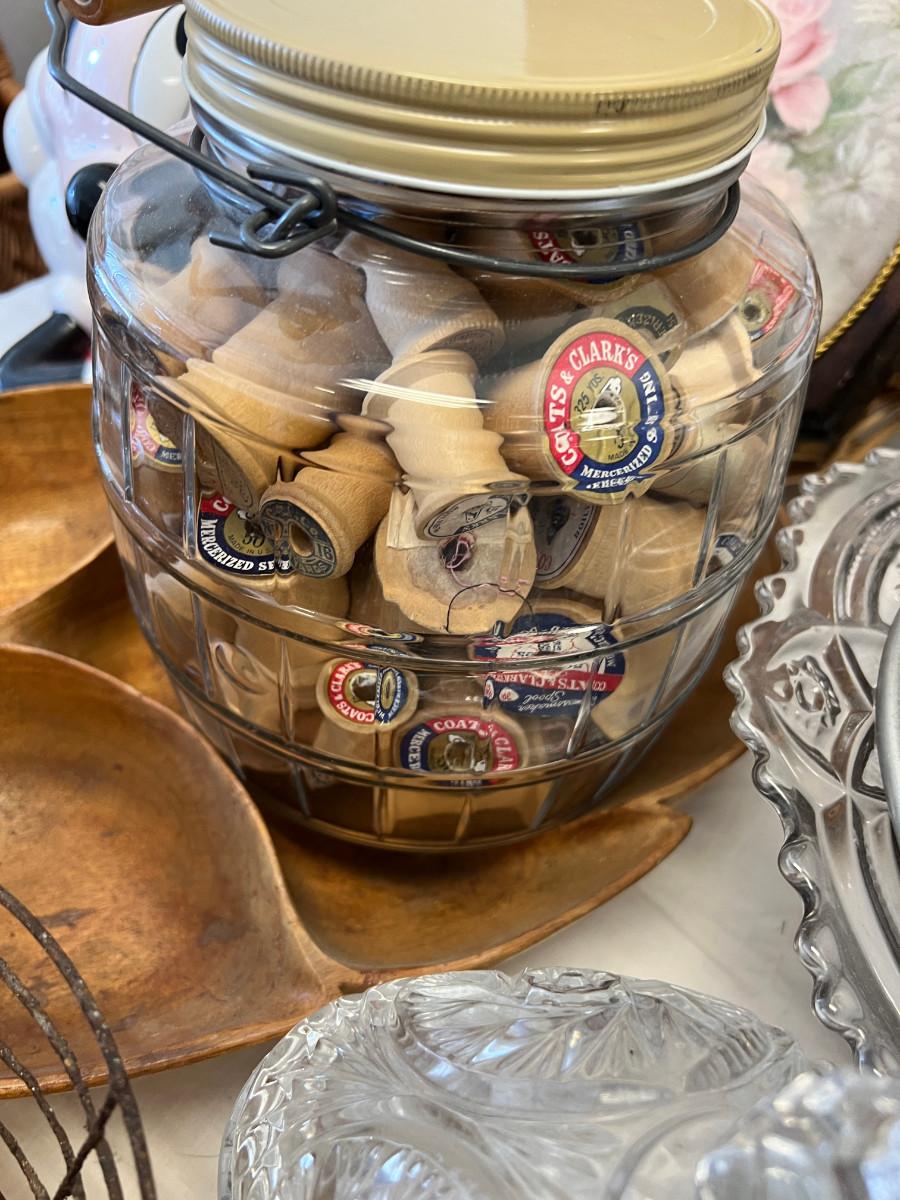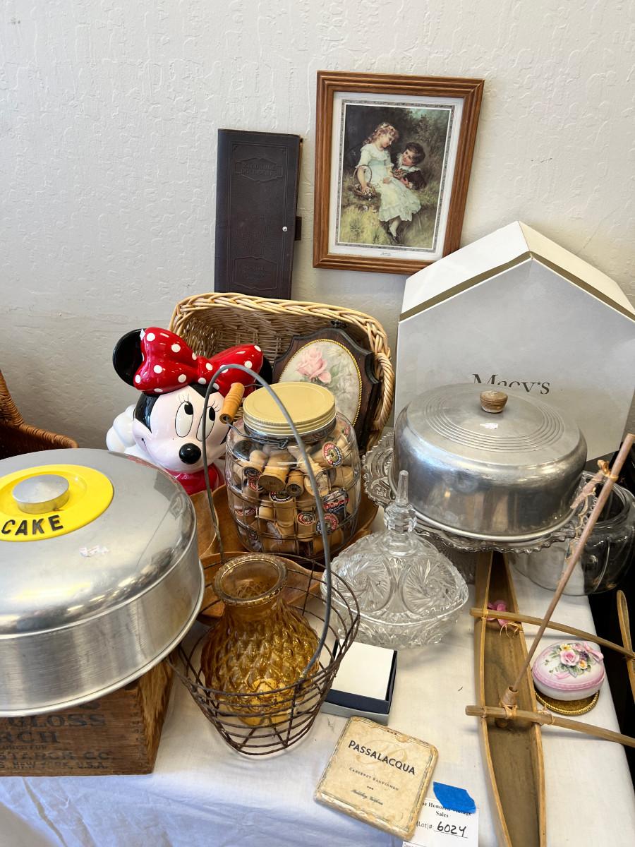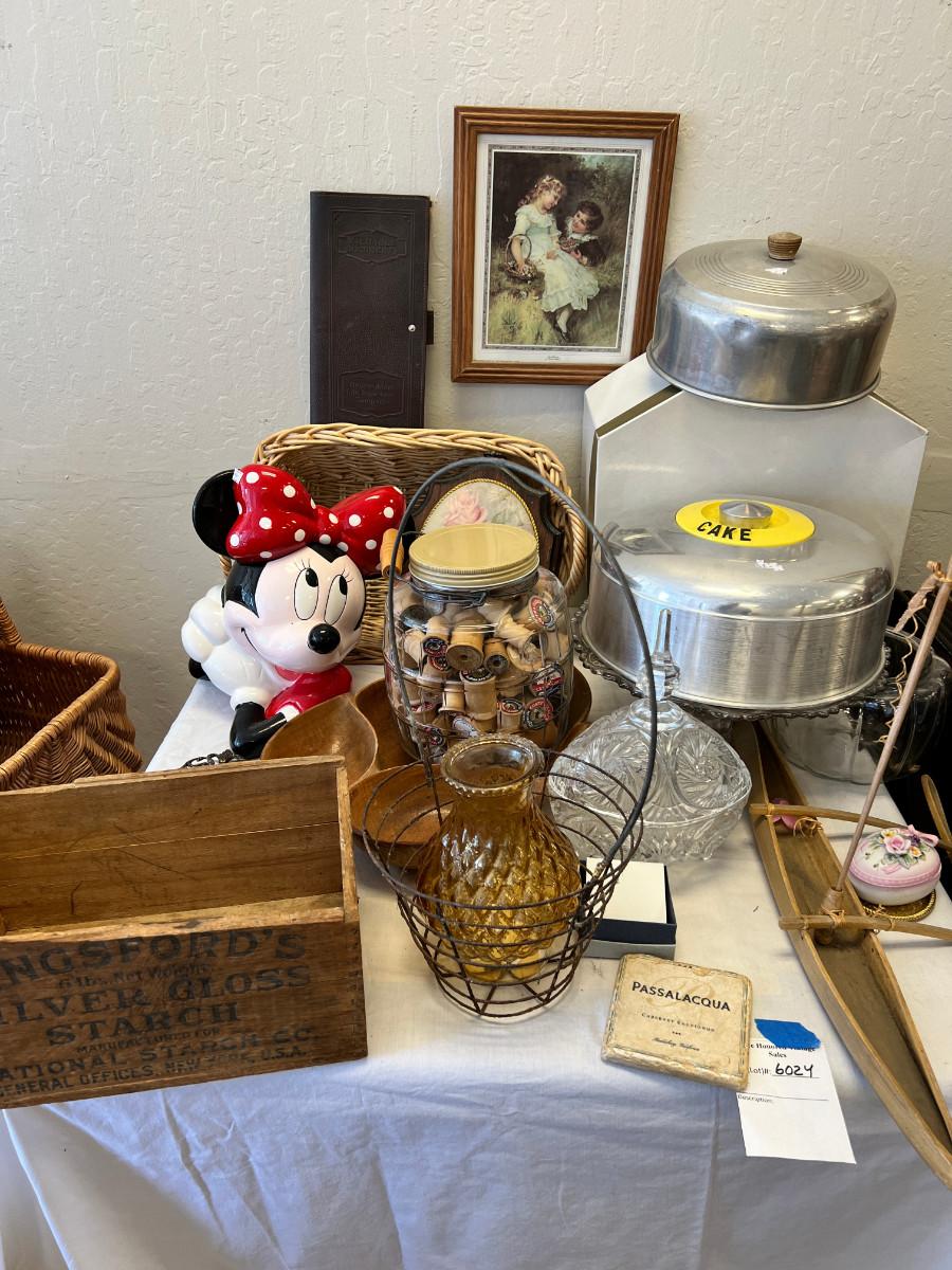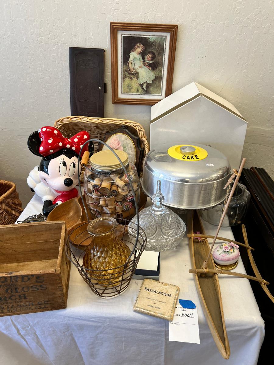 Vintage Home ranch box farmcor, Minnie Mouse cookie jar, in good shape, Pickle jar full of wooden spools, Candy dish, Monkey pod leaf tray, antique box baskets.