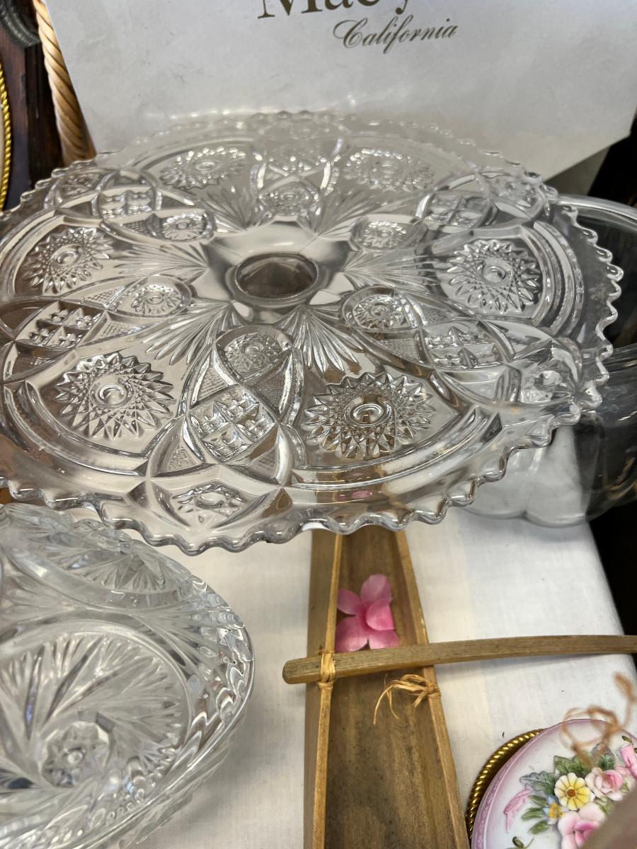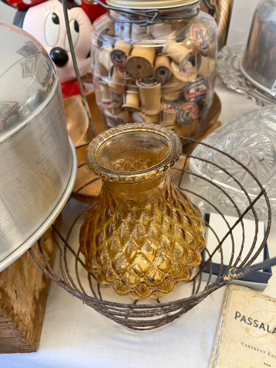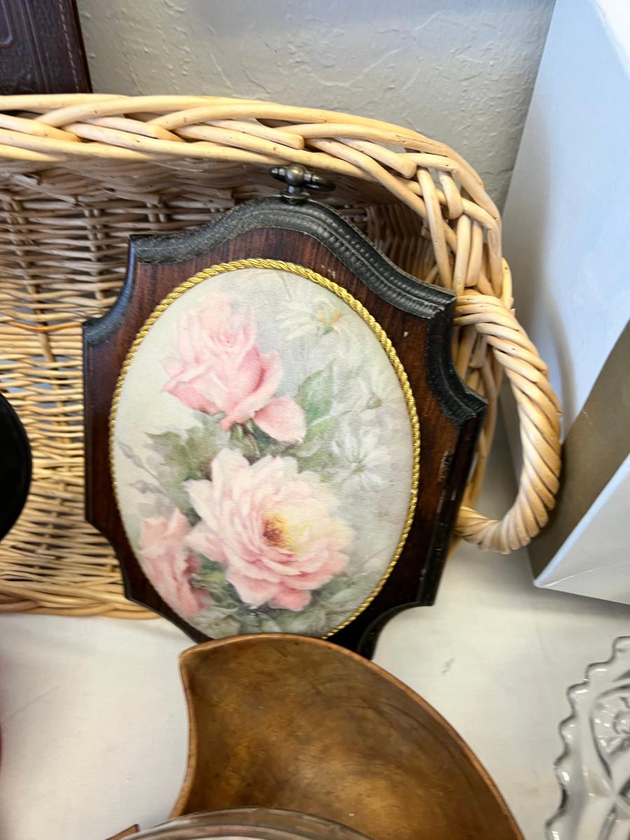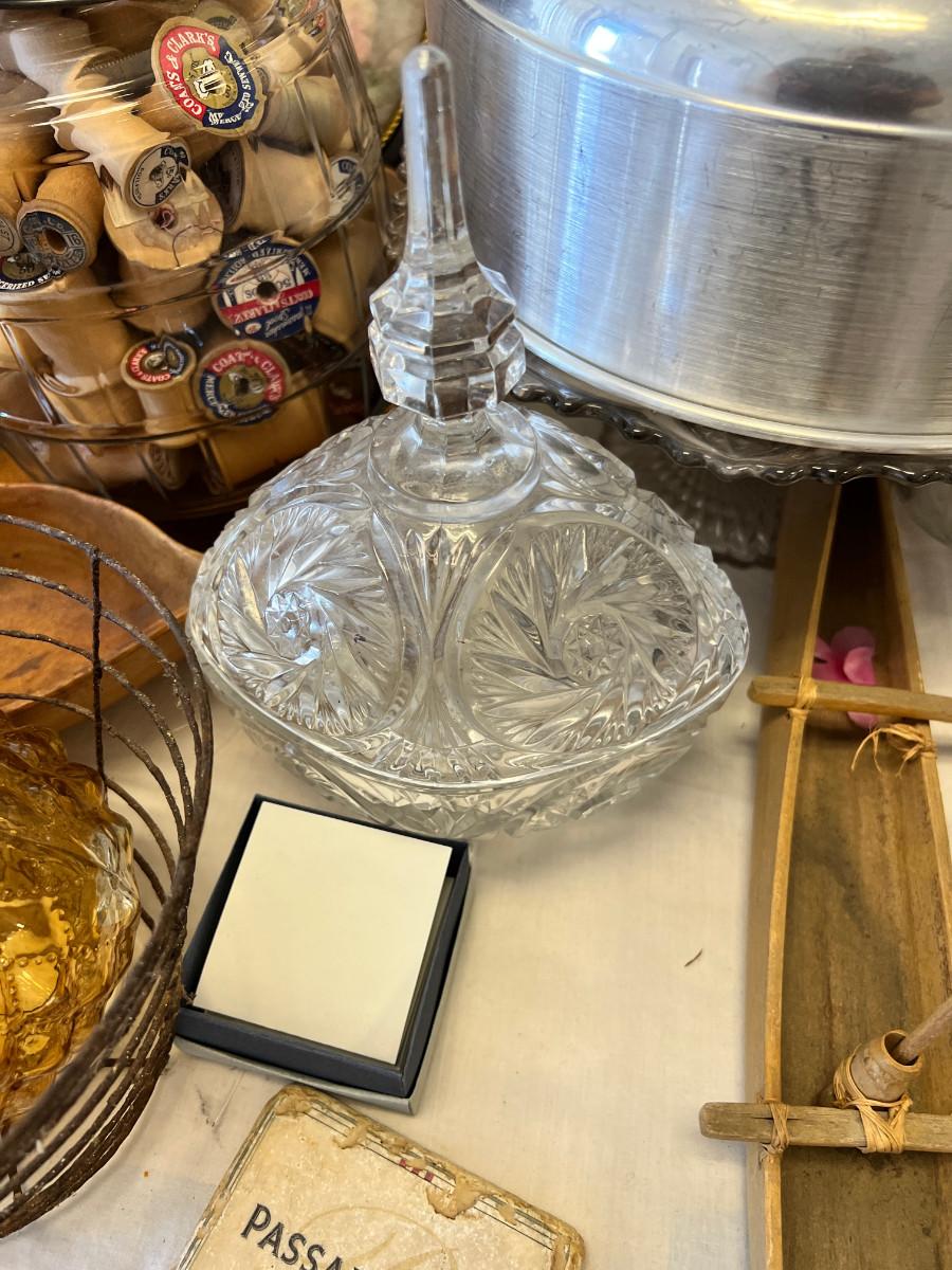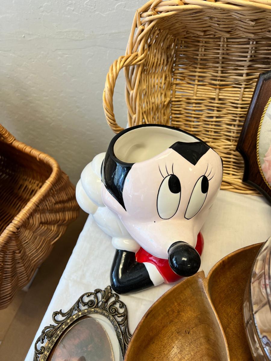 Vintage Home ranch box farmcor, Minnie Mouse cookie jar, in good shape, Pickle jar full of wooden spools, Candy dish, Monkey pod leaf tray, antique box baskets.