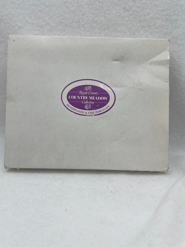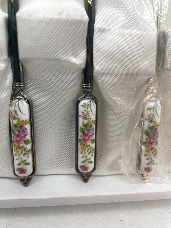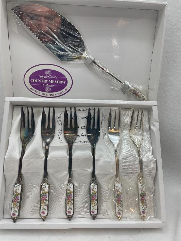 7pcs Country Meadow Silverplated Pastry/Dessert Set. Set contains 6 forks, 2 of which are in original wrapping, and Cake Server, in original wrapping. Floral porcelain Insert in each handle. Forks should polish up nicely.