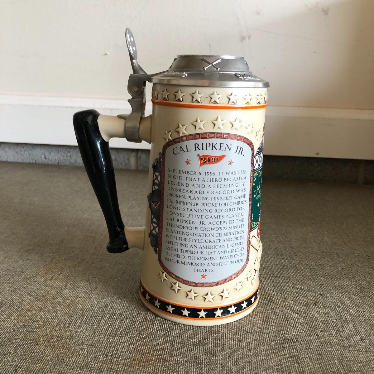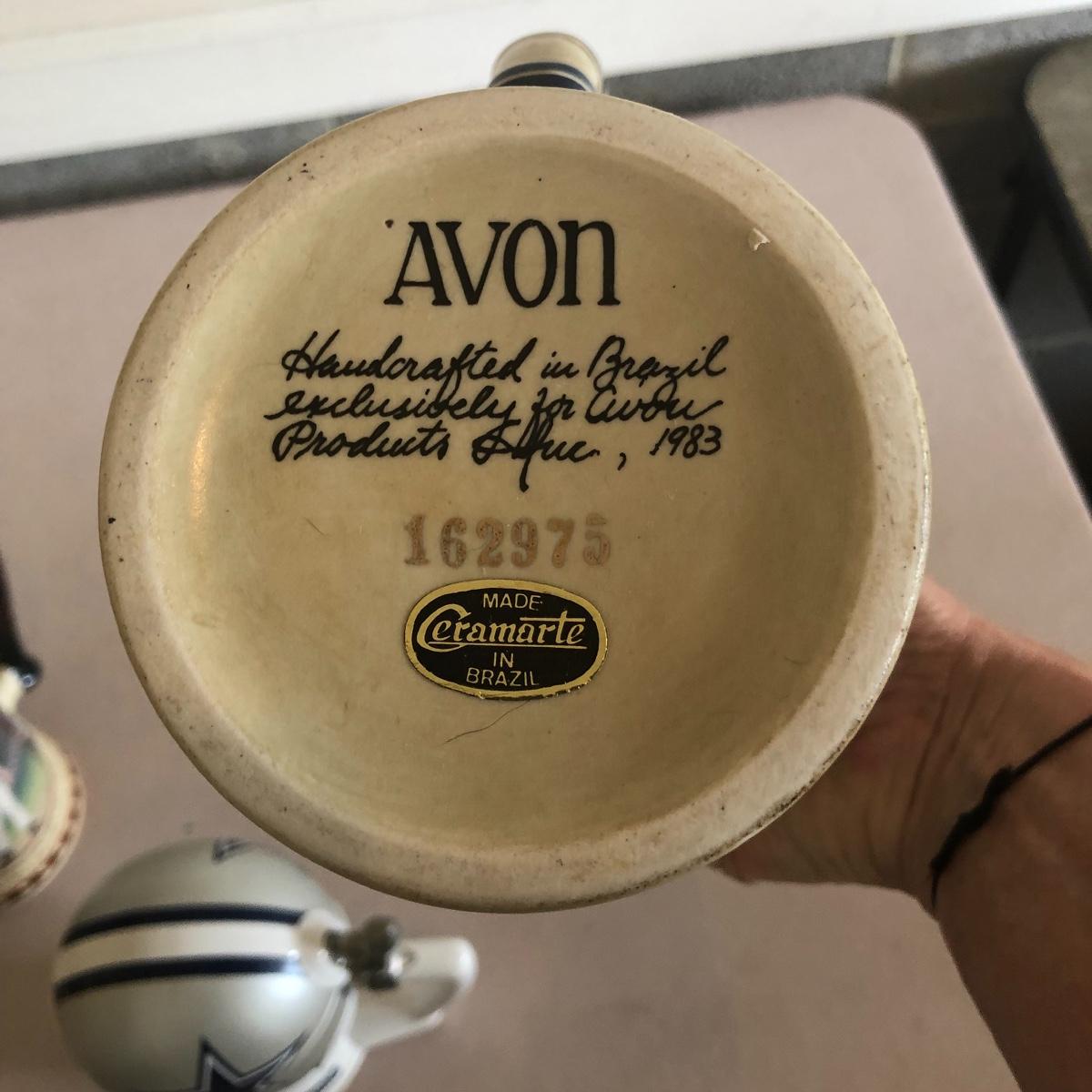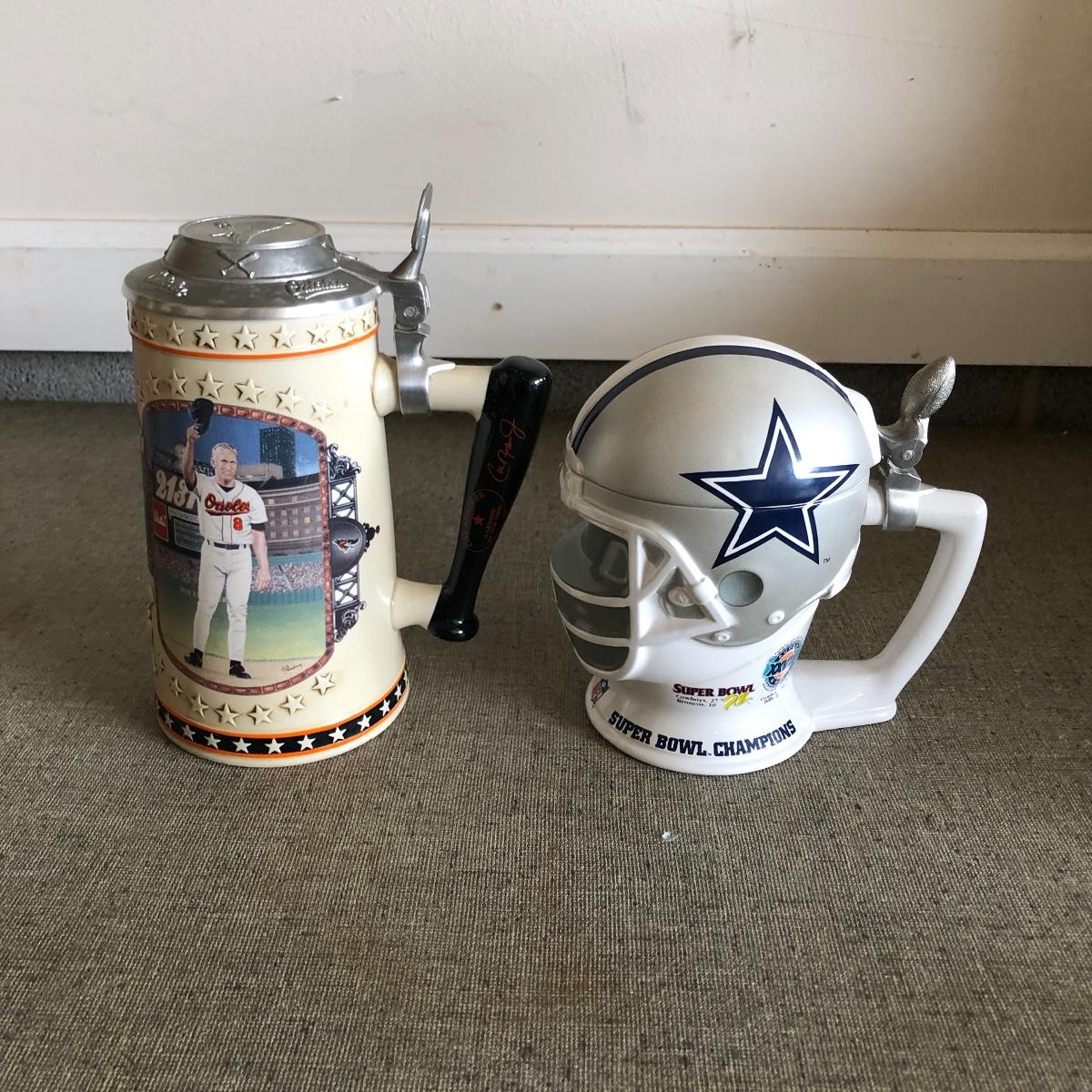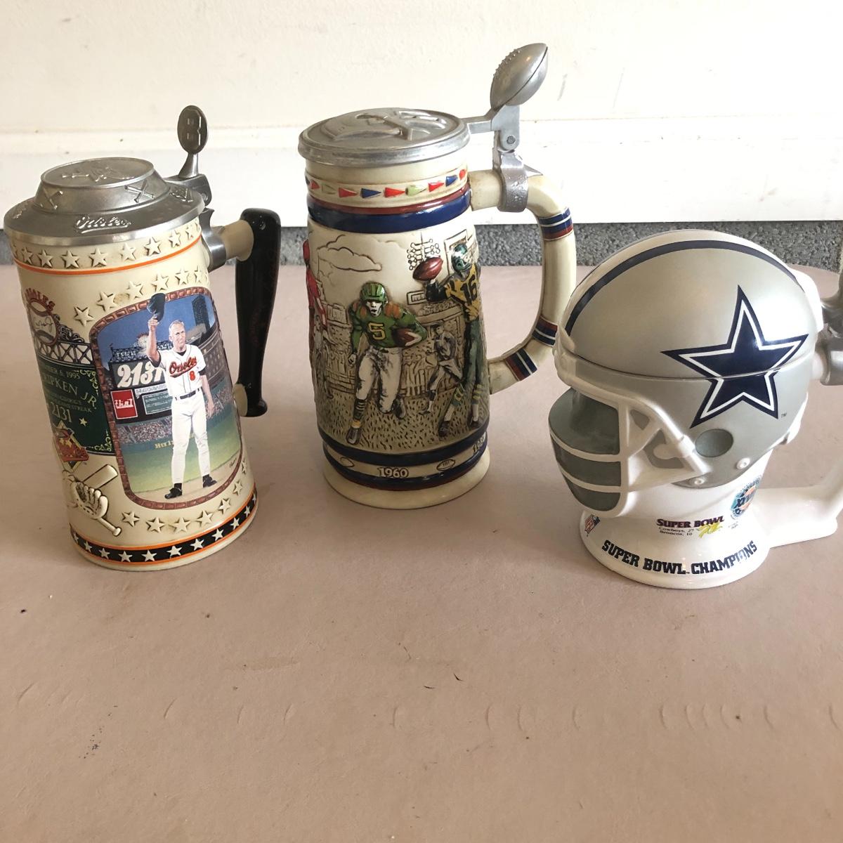Lot includes ceramic Cal Ripken commemorative Stein and a ceramic Dallas Cowboys Suber Bowl Champions Stein. Also includes a Avon football themed stein. Largest Stein measures 4”D x 8” tall.