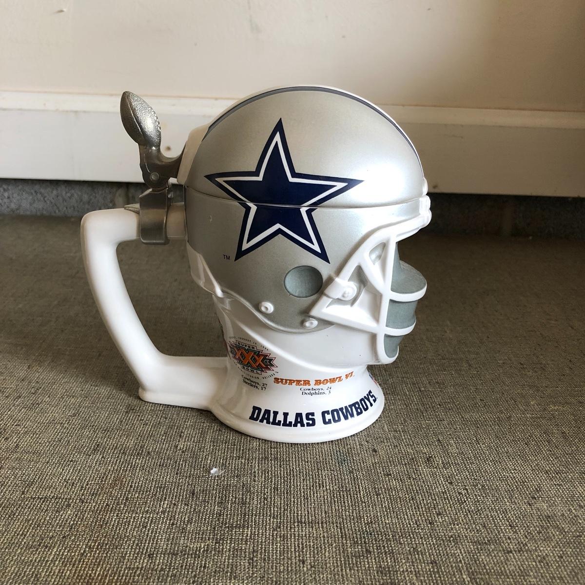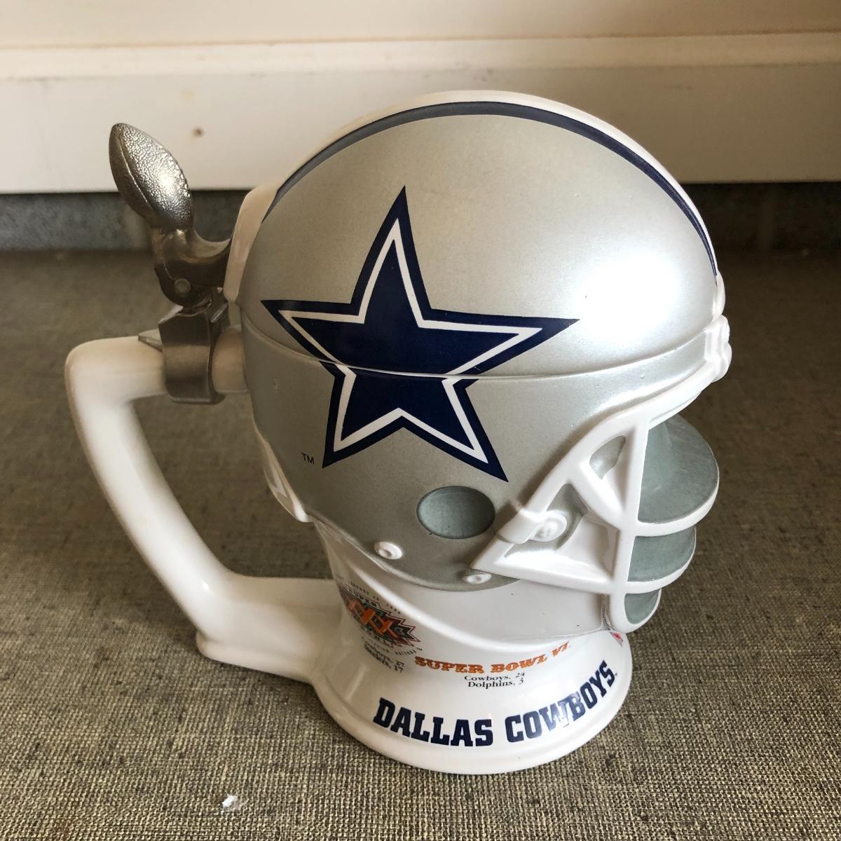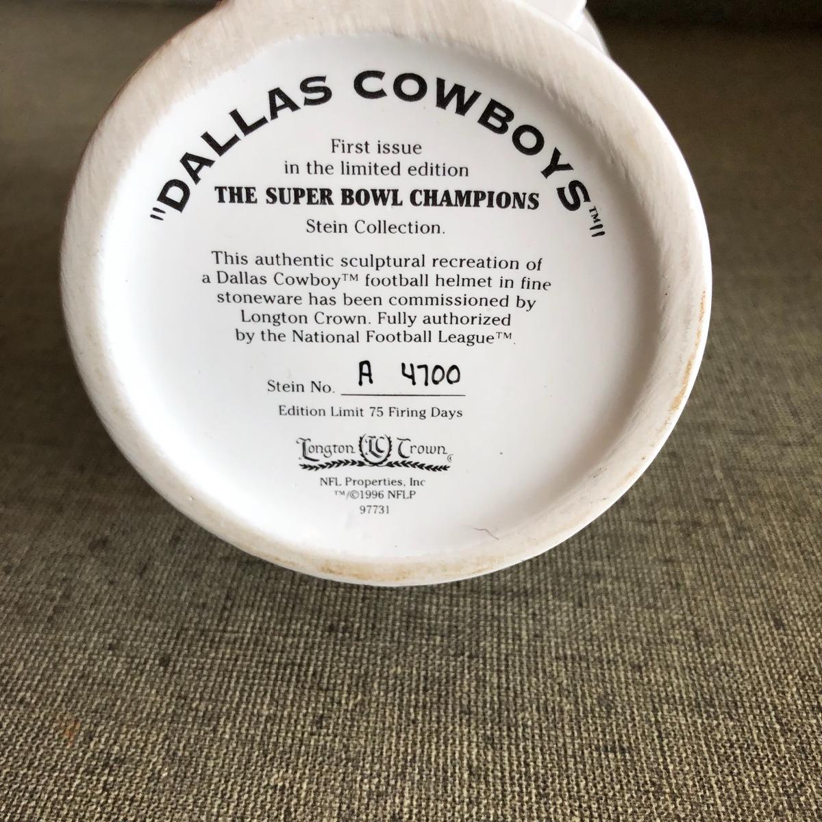 Lot includes ceramic Cal Ripken commemorative Stein and a ceramic Dallas Cowboys Suber Bowl Champions Stein. Also includes a Avon football themed stein. Largest Stein measures 4”D x 8” tall.