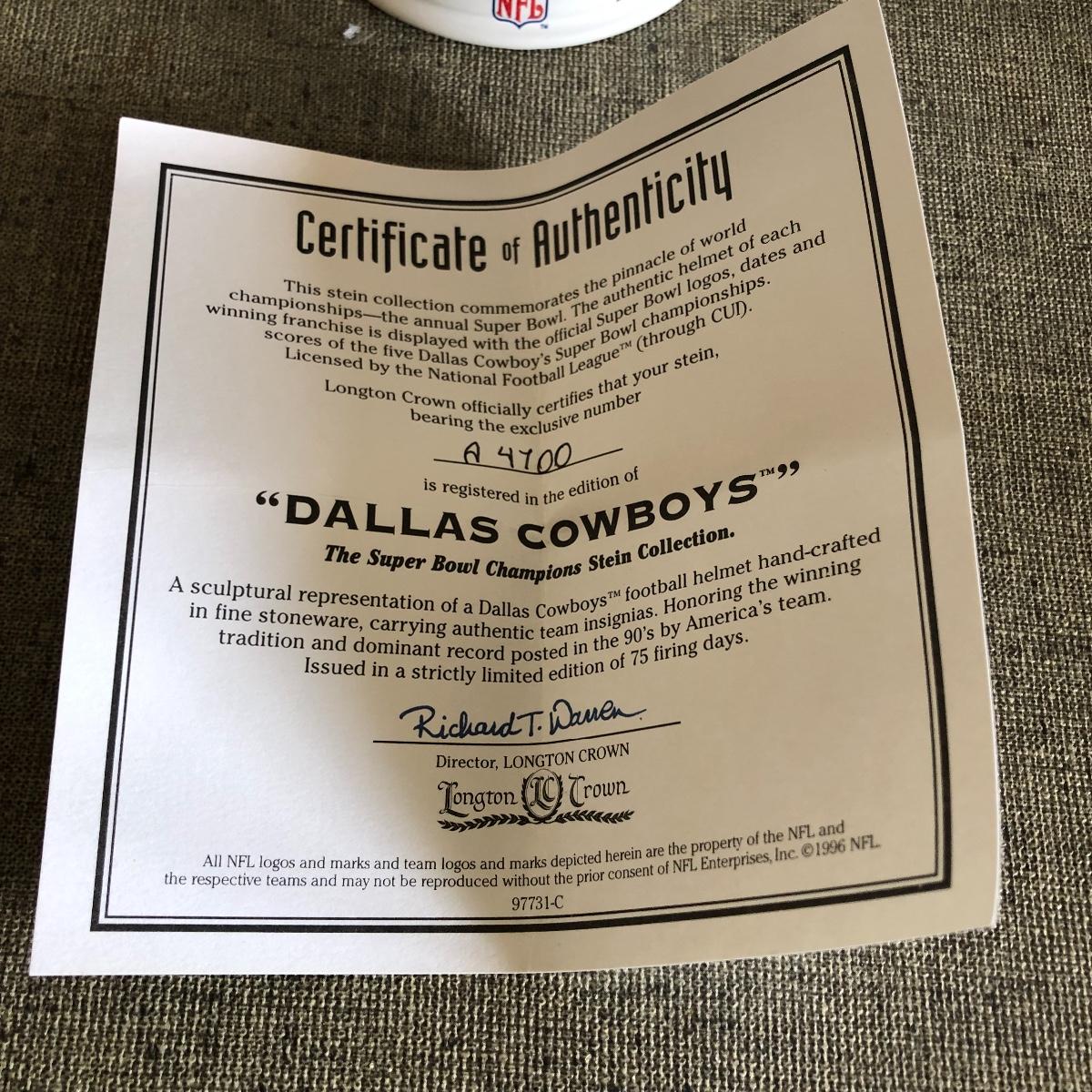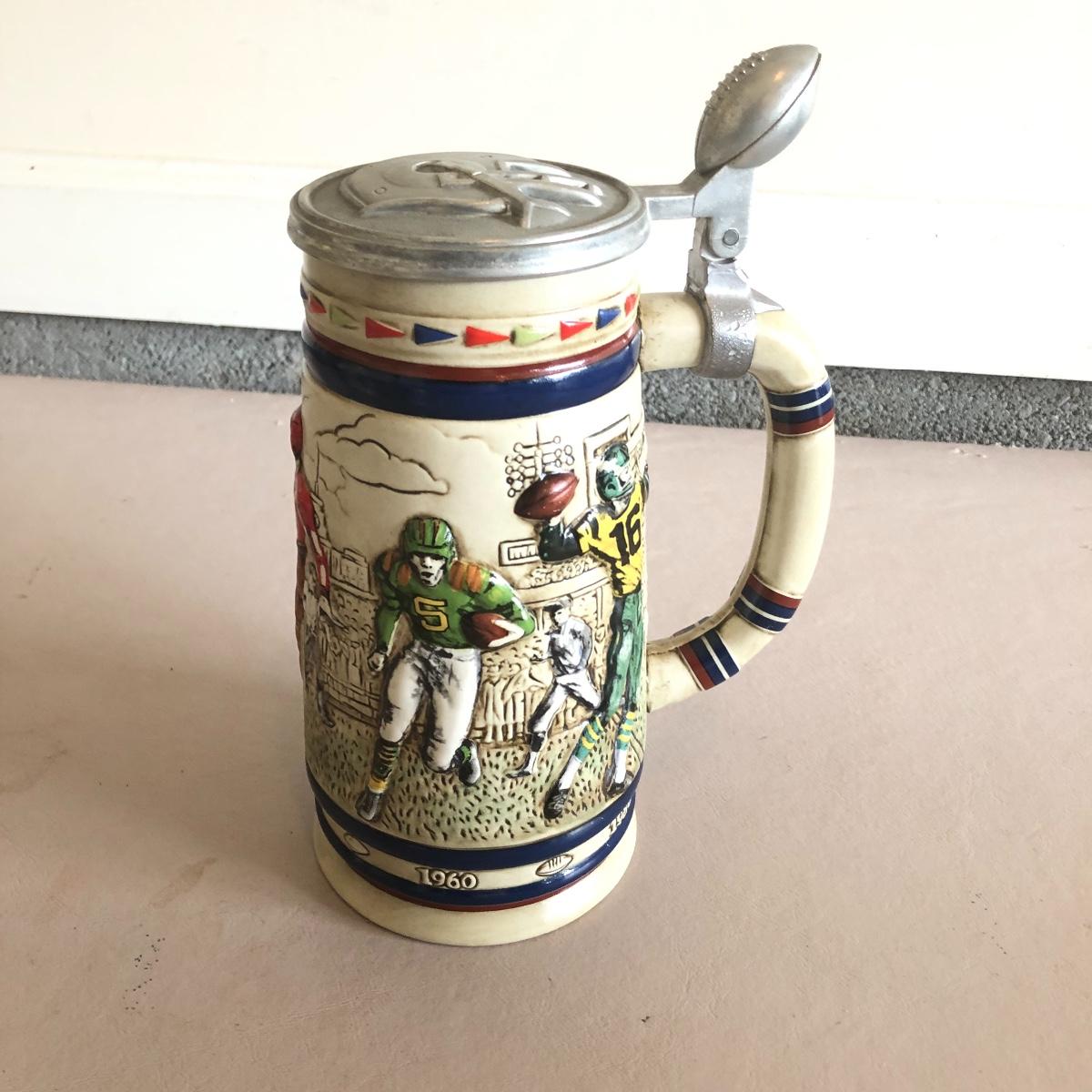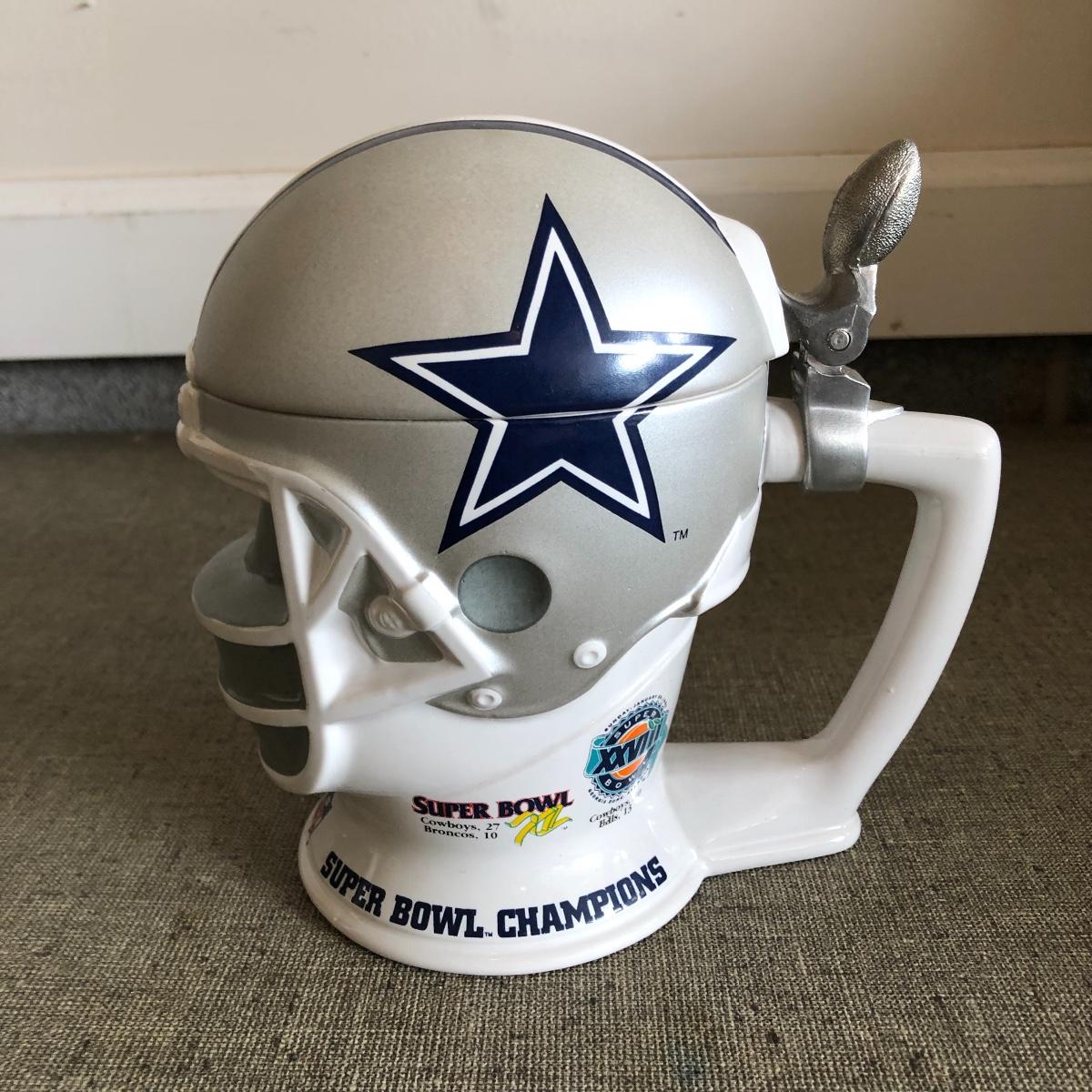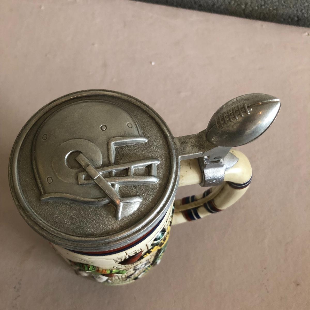 Lot includes ceramic Cal Ripken commemorative Stein and a ceramic Dallas Cowboys Suber Bowl Champions Stein. Also includes a Avon football themed stein. Largest Stein measures 4”D x 8” tall.