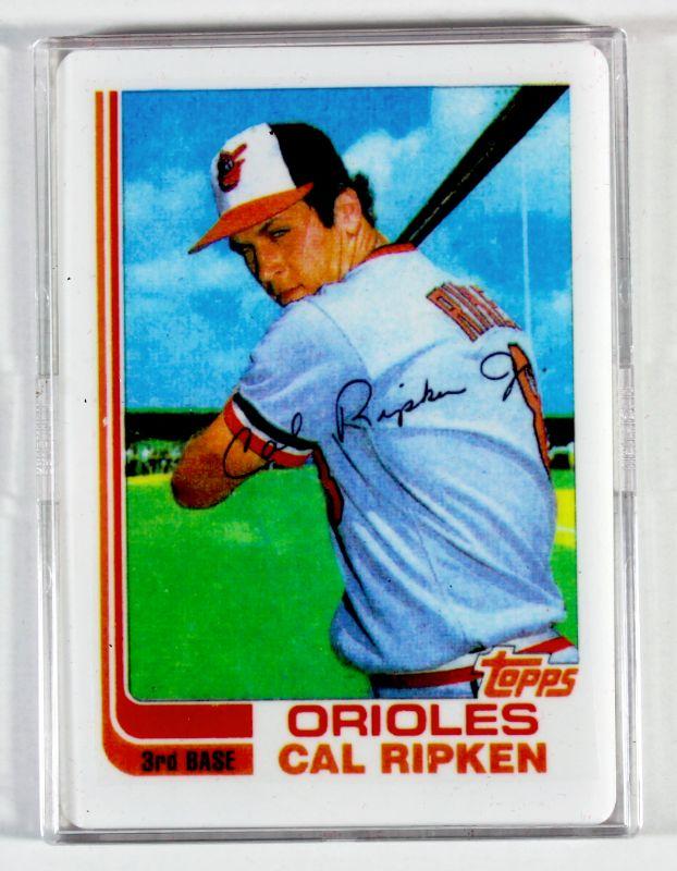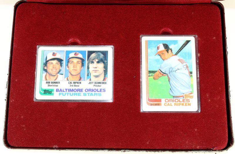 Rare Limited Edition Porcelain Baseball Cards Set featuring the 1982 Topps Cal Ripken Jr. Rookie Cards, each card seats in plastic protective holder and all comes in presentation case - please note that the case shows wear on the outside - the cards are Mint and in like new condition - see photos.