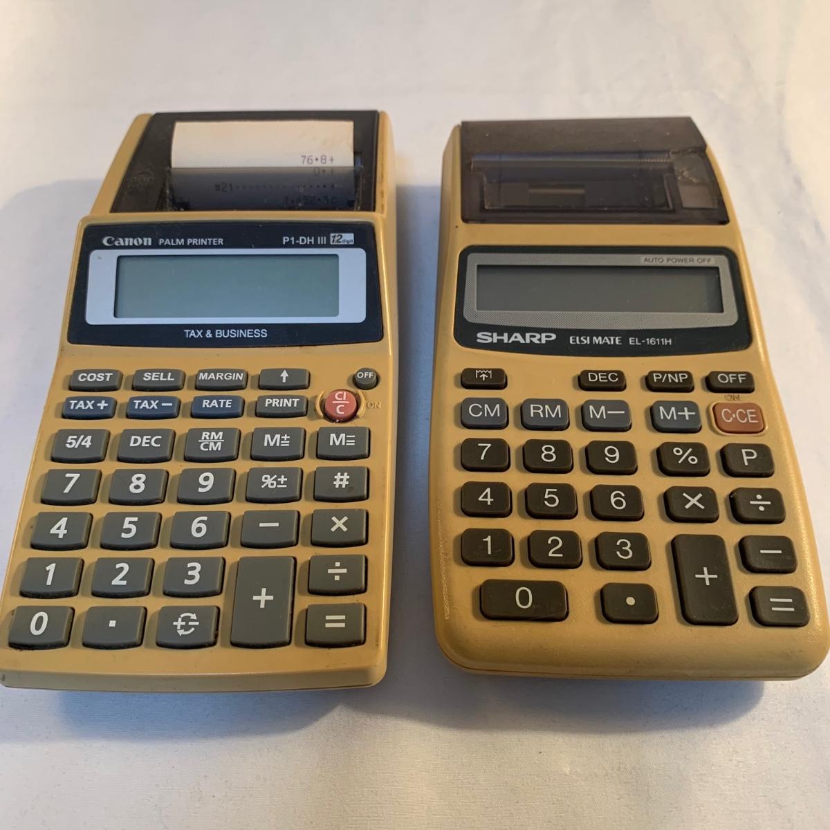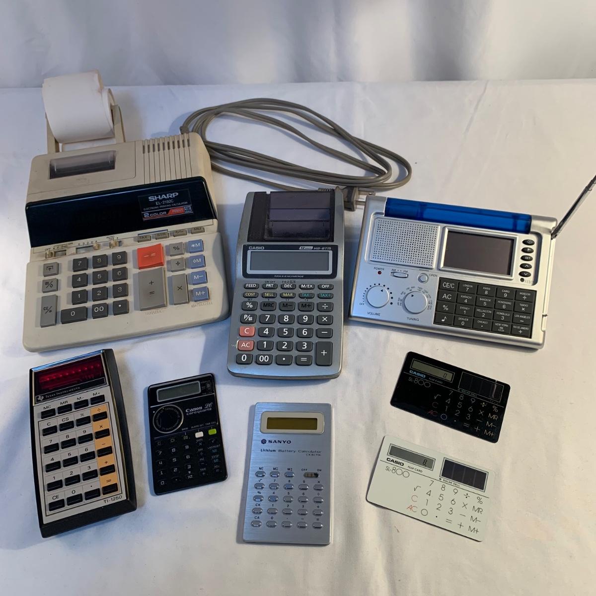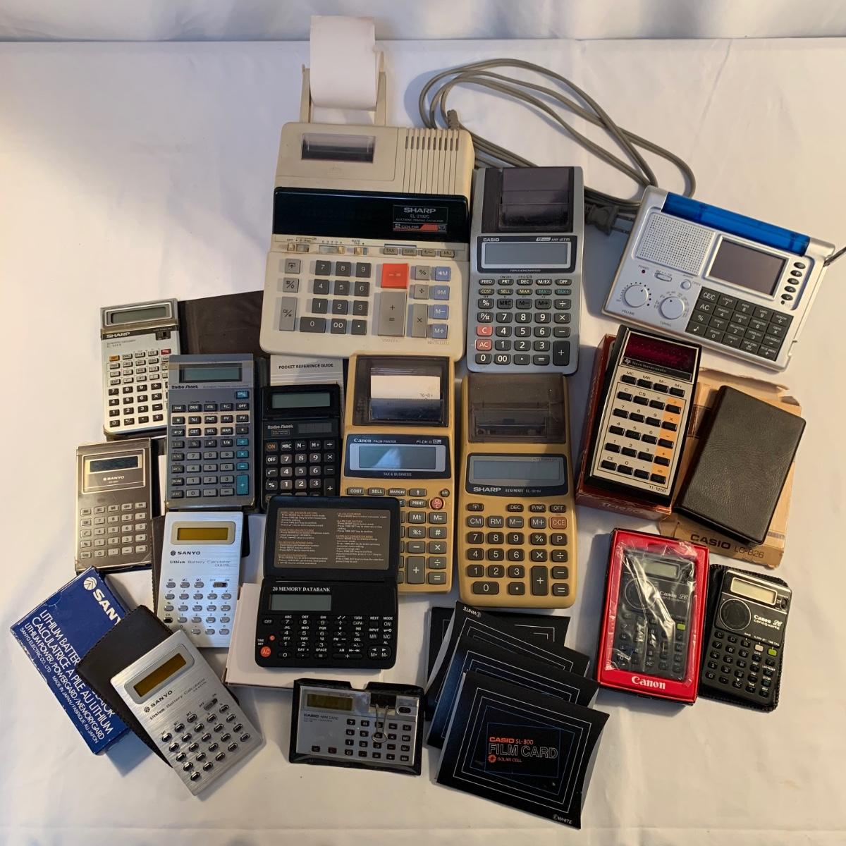 20+ calculators in this collection! Includes various printing calculators: a Sharp EL-2192C, a Sharp Elsi Mate EL-1611H, a Canon Palm Printer P1-DH III, and a Casio HR-8TM. One of the calculators is a radio! You’ll also find a Texas Instruments TI-1250 as well as various calculators from Sanyo, Sharp, Radio Shack, Casio, & Canon. Most are battery powered and need their batteries replaced. A few are solar powered. One (the Sharp EL-2192C) has an electric cord; it turned on when plugged in. Calculators range from good condition to like new.