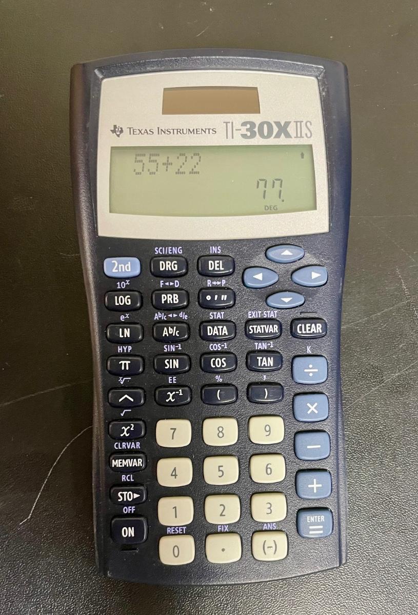 Texas Instruments solar-powered scientific calculator TI-30X IIS, handles fractions, mixed numbers, statistics, trigonometry, etc. HP-12C battery-powered financial calculator can calculate interest, loan payments, standard deviation, net present value (NPV), and many others. Both fully tested, work as expected.