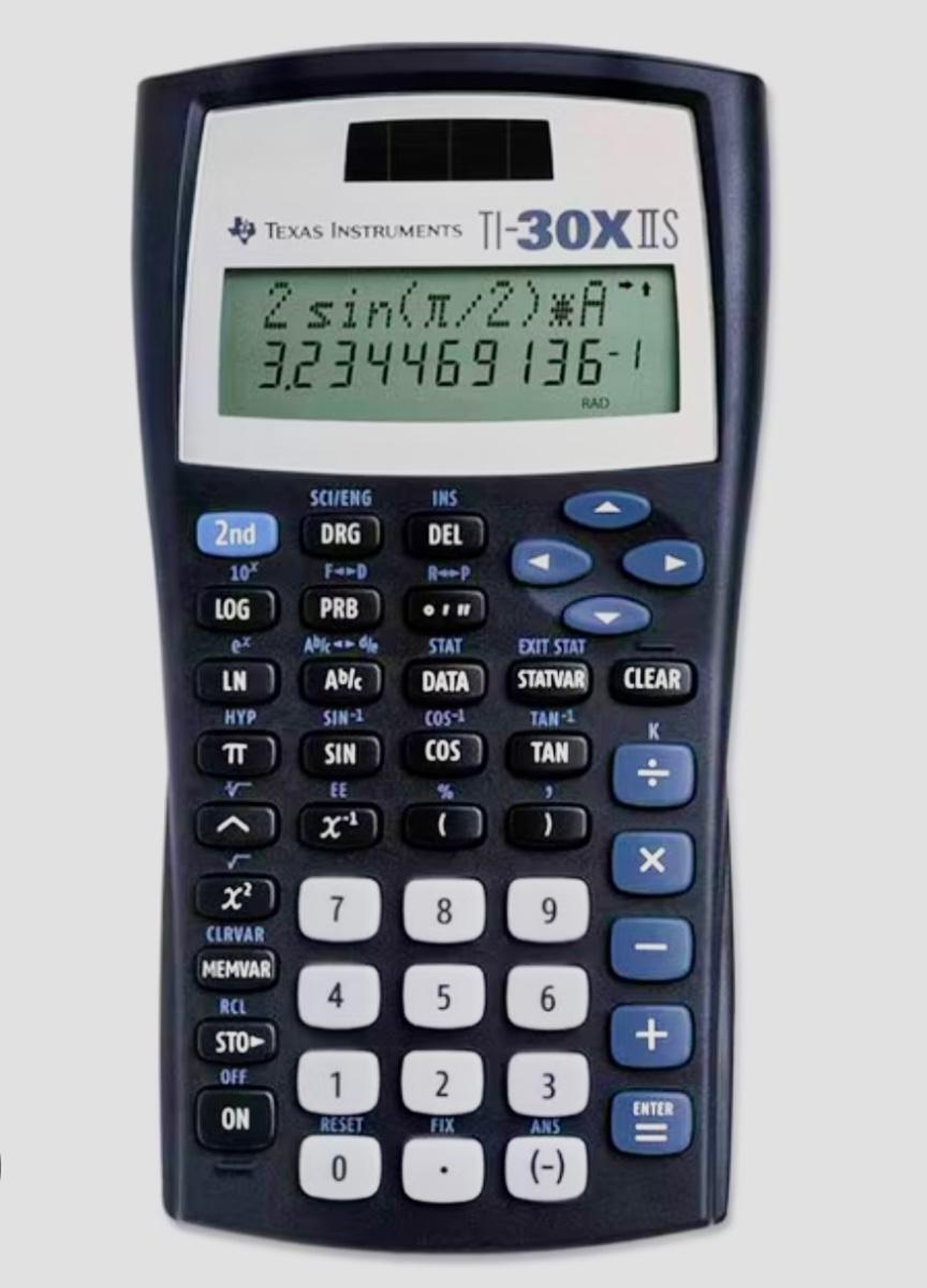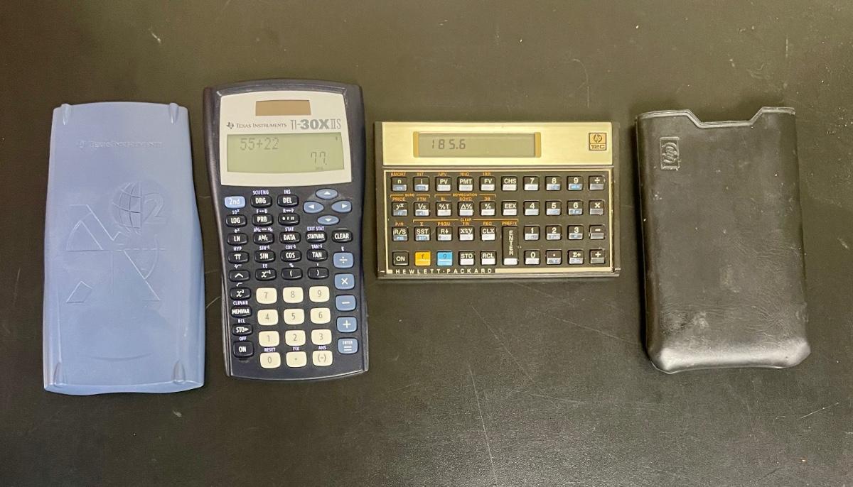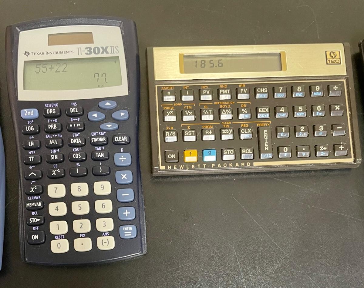 Texas Instruments solar-powered scientific calculator TI-30X IIS, handles fractions, mixed numbers, statistics, trigonometry, etc. HP-12C battery-powered financial calculator can calculate interest, loan payments, standard deviation, net present value (NPV), and many others. Both fully tested, work as expected.