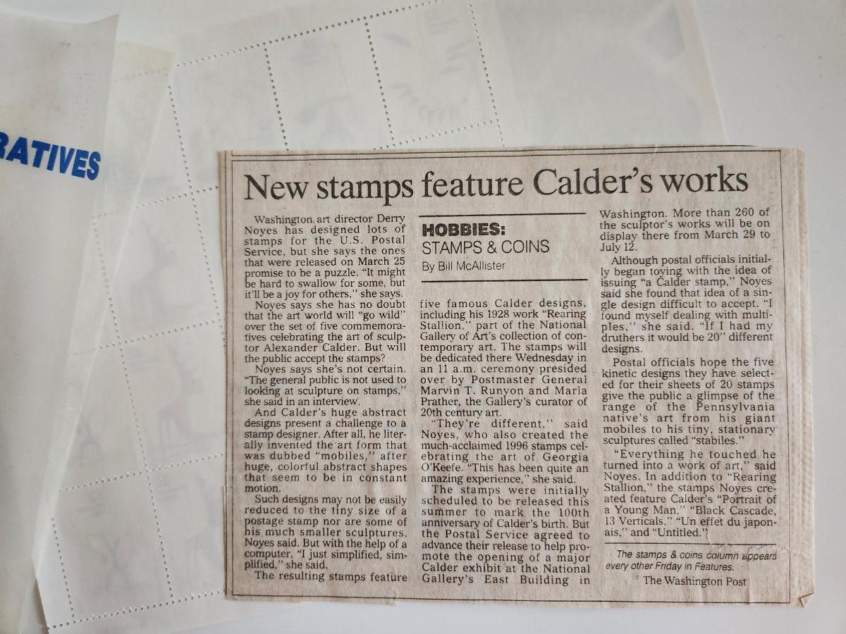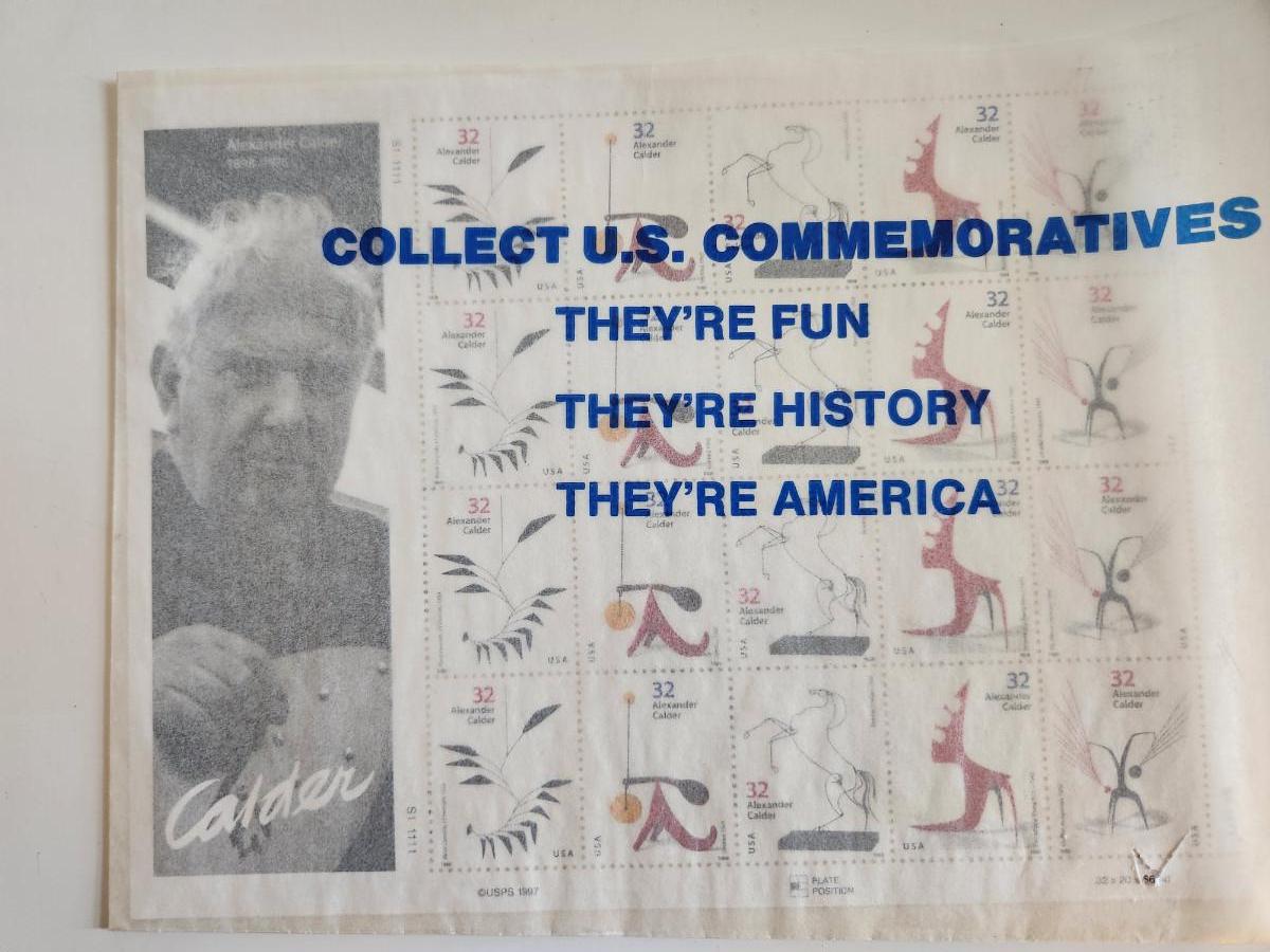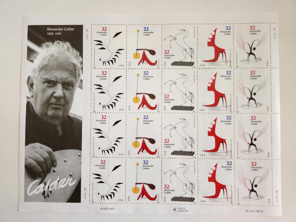 This lot is for a Calder Commemorative Stamp Plate. This stamp was designed and issued by the USPS in 1997. The plate holds 20 stamps with a postage value of 32 cents each. The total usable value is $6.40. The collector's value is up to you. Also includes a Washington Post newspaper article regarding the stamp.