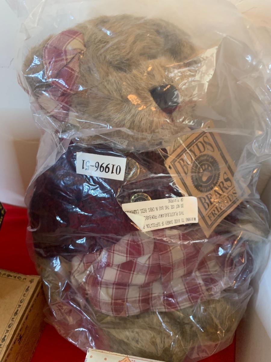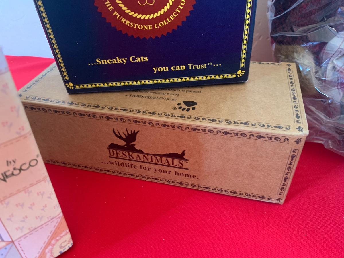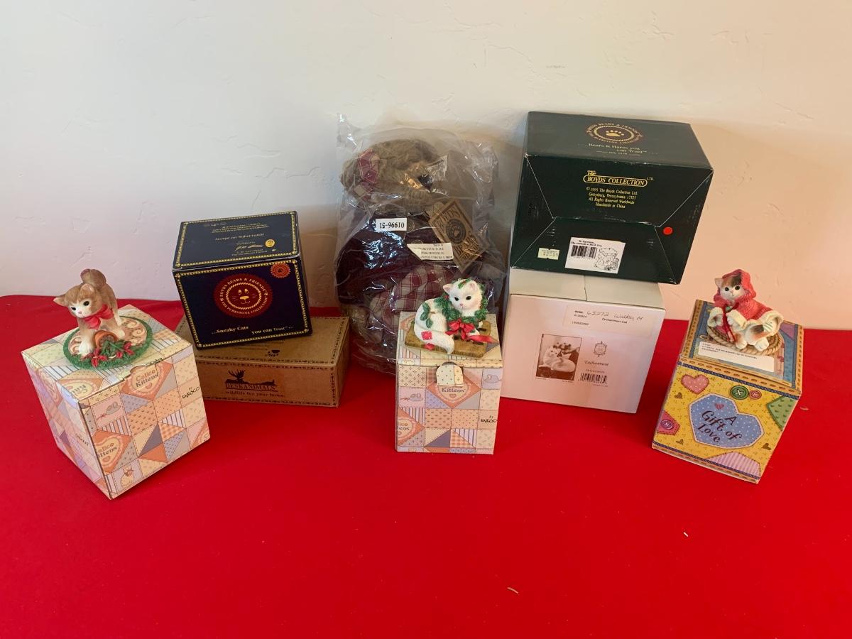 Lot includes collectible figurines including Calico Kittens, Boyd’s Bears, a desk animal and a BB stuffy. All in like new condition in original packaging.