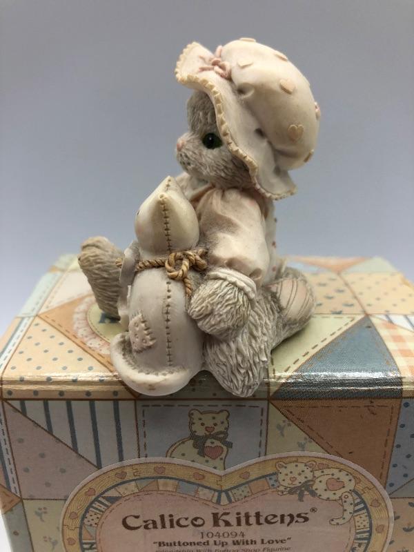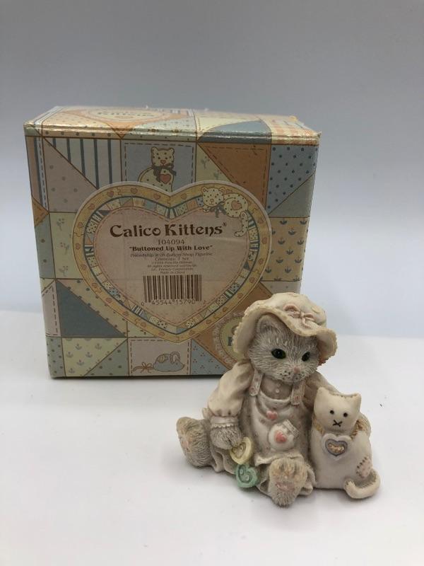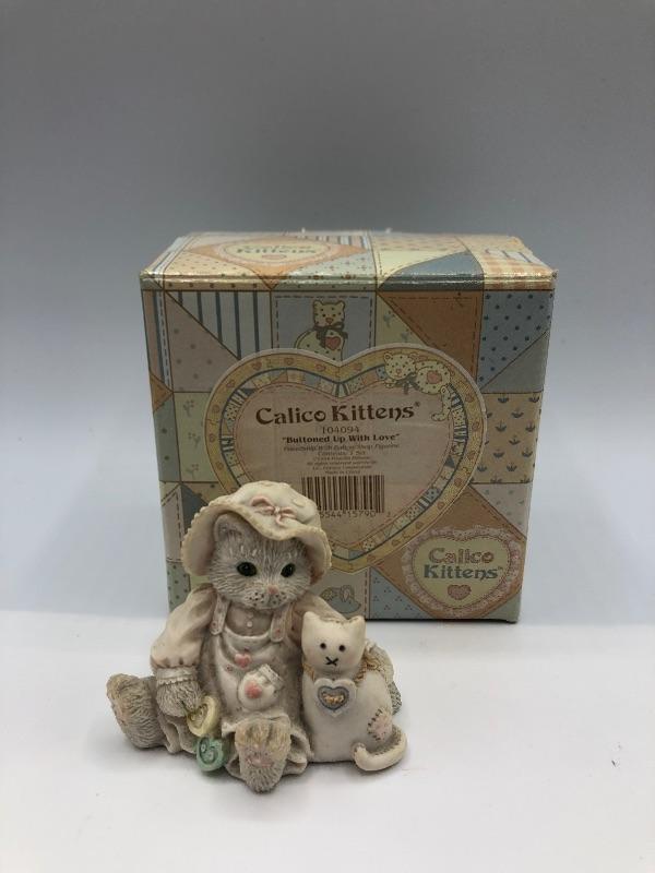Calico Kittens cat figurine "Buttoned Up With Love". Comes with original box. Good Condition.
