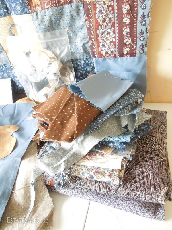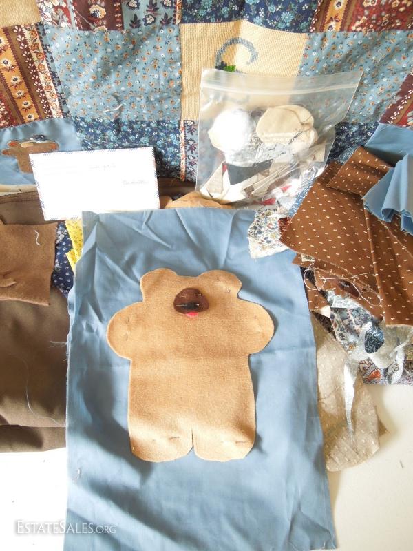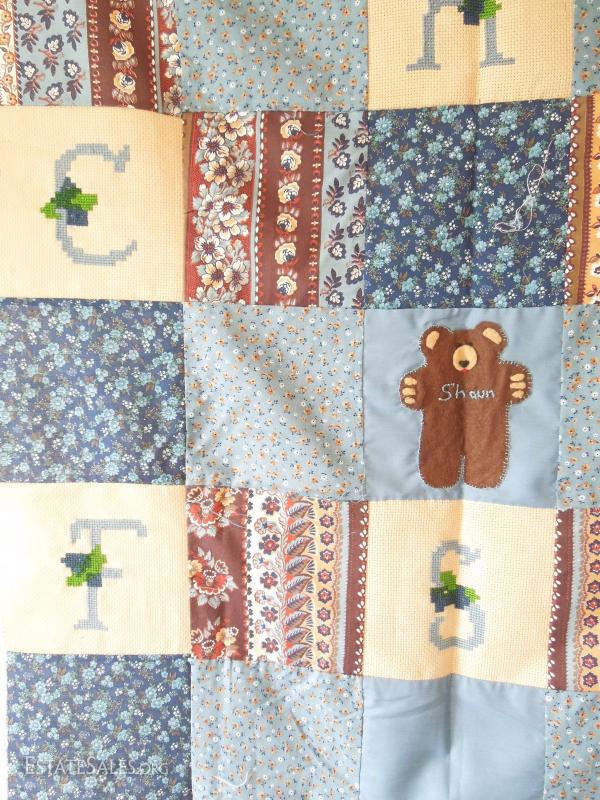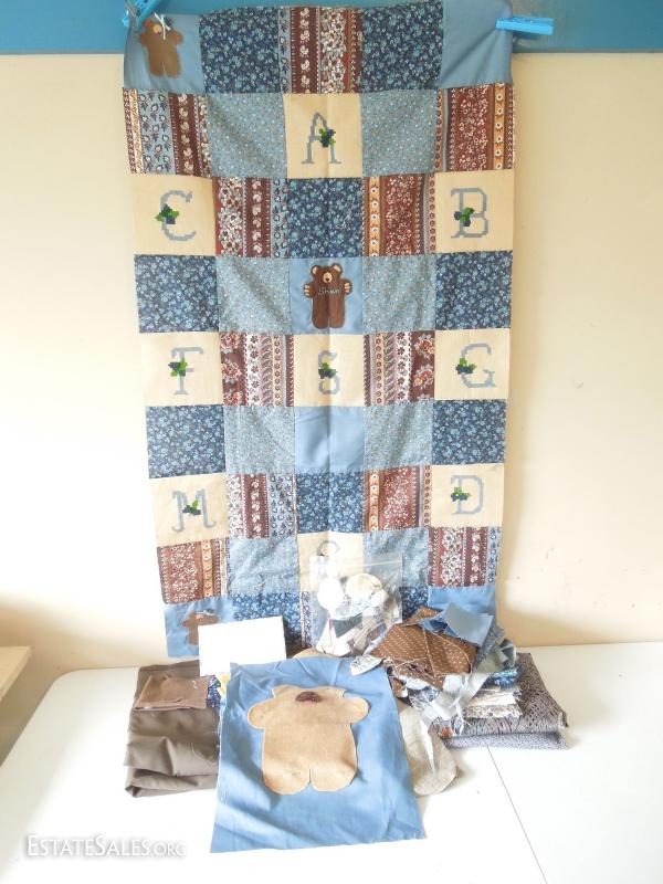 Amazing quilt top with additional cut squares and fabric. Quilt has bear and ABC theme. Each letter on quilt is hand embroidered on canvas. Beautiful assortment of calico cotton in blues, browns and cream colors. 45x25.