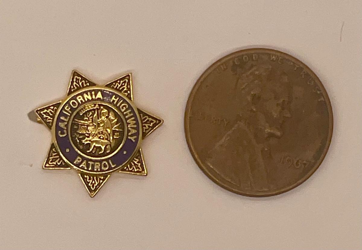 Miniature version of the CHP badge, polished gold tone lettering and central image on a blue enamel background. Great condition.