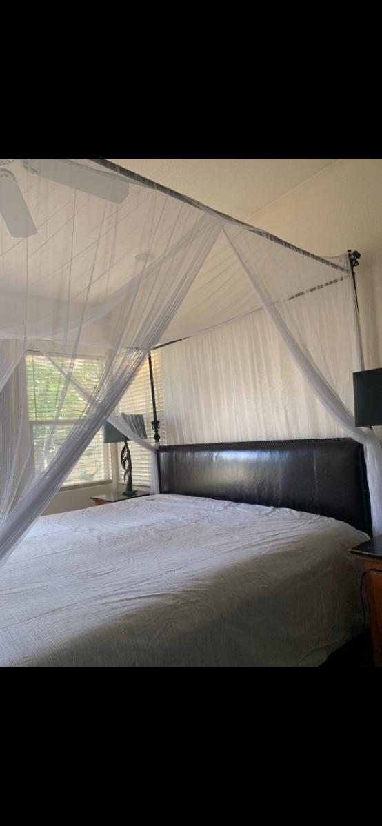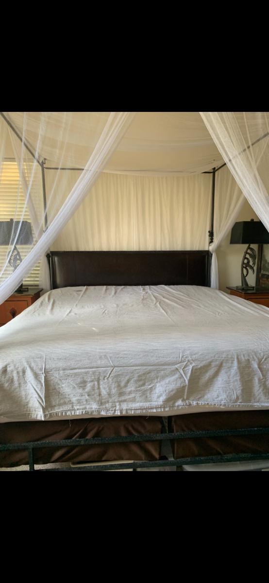 California King Size mattress, box spring, and mattress topper & Cast Iron Bed Frame made for a canopy which comes with a white canopy to drape.