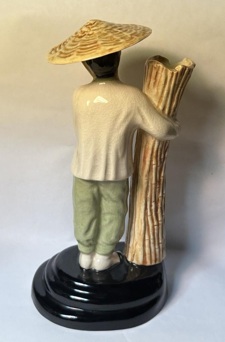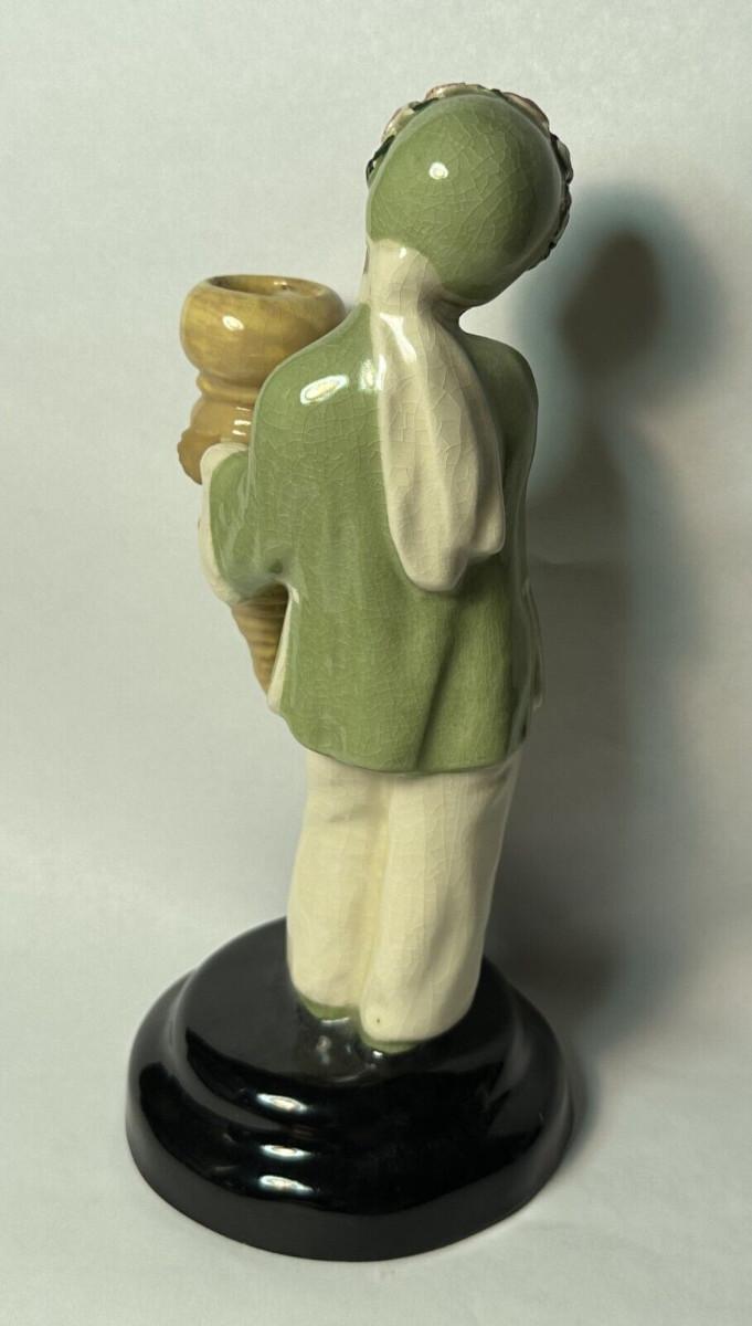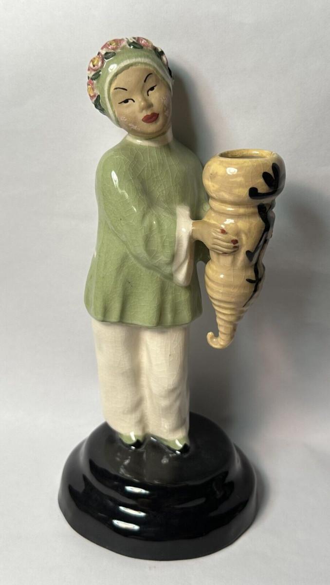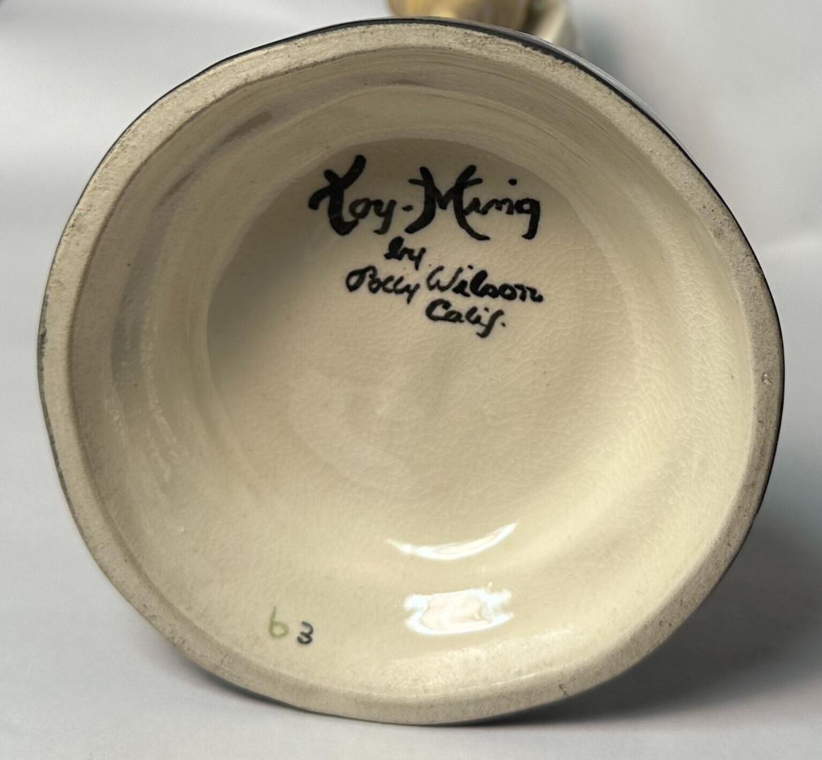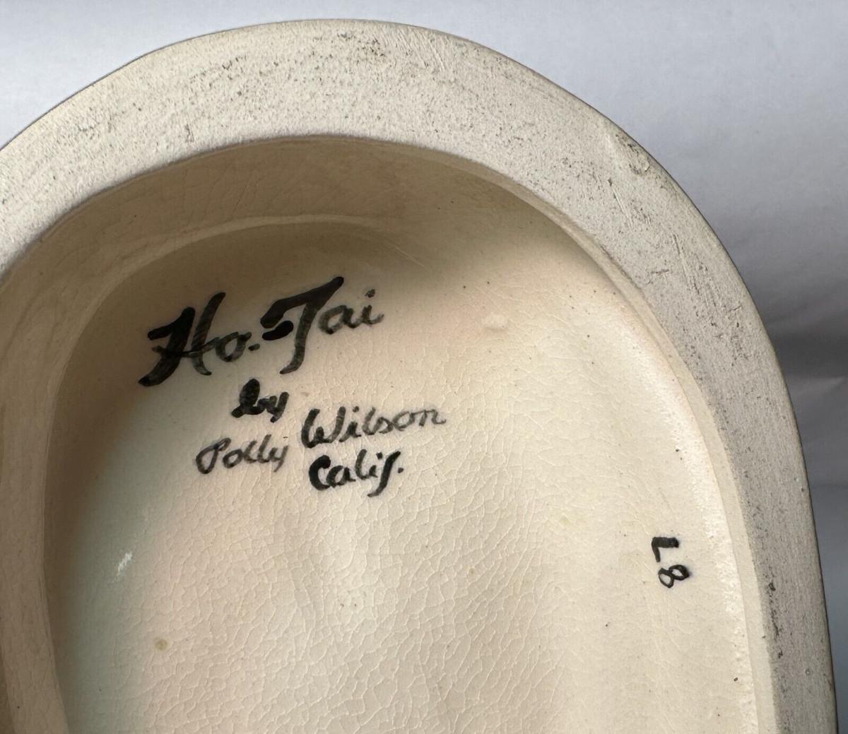 pair of signed California Pottery figures from Polly Wilson...8 1/2" tall on these bud vases..Asian figures Toy-Ming and Ho-Tai...No chips or cracks..some light crazing with age..the only detractor I spot are some light rubs on the cold painted face of the lady...As shown...Polly and Walter Wilson produced giftware and figurines in Pasadena, CA between 1943 and 1954.